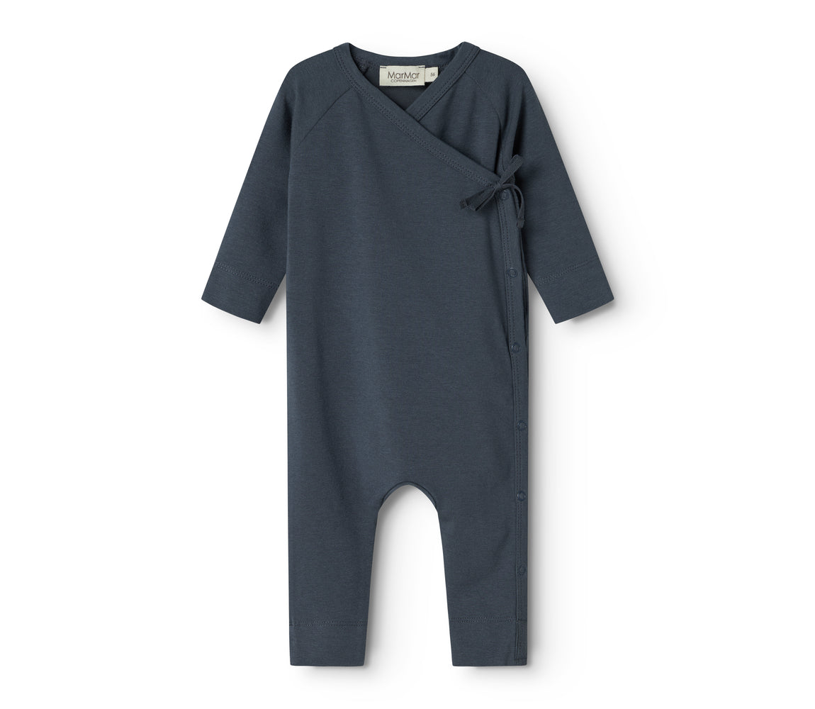 Long-sleeved jumpsuit with wrap-around closure, the jumpsuit closes with snaps and ties from the neck down one leg.