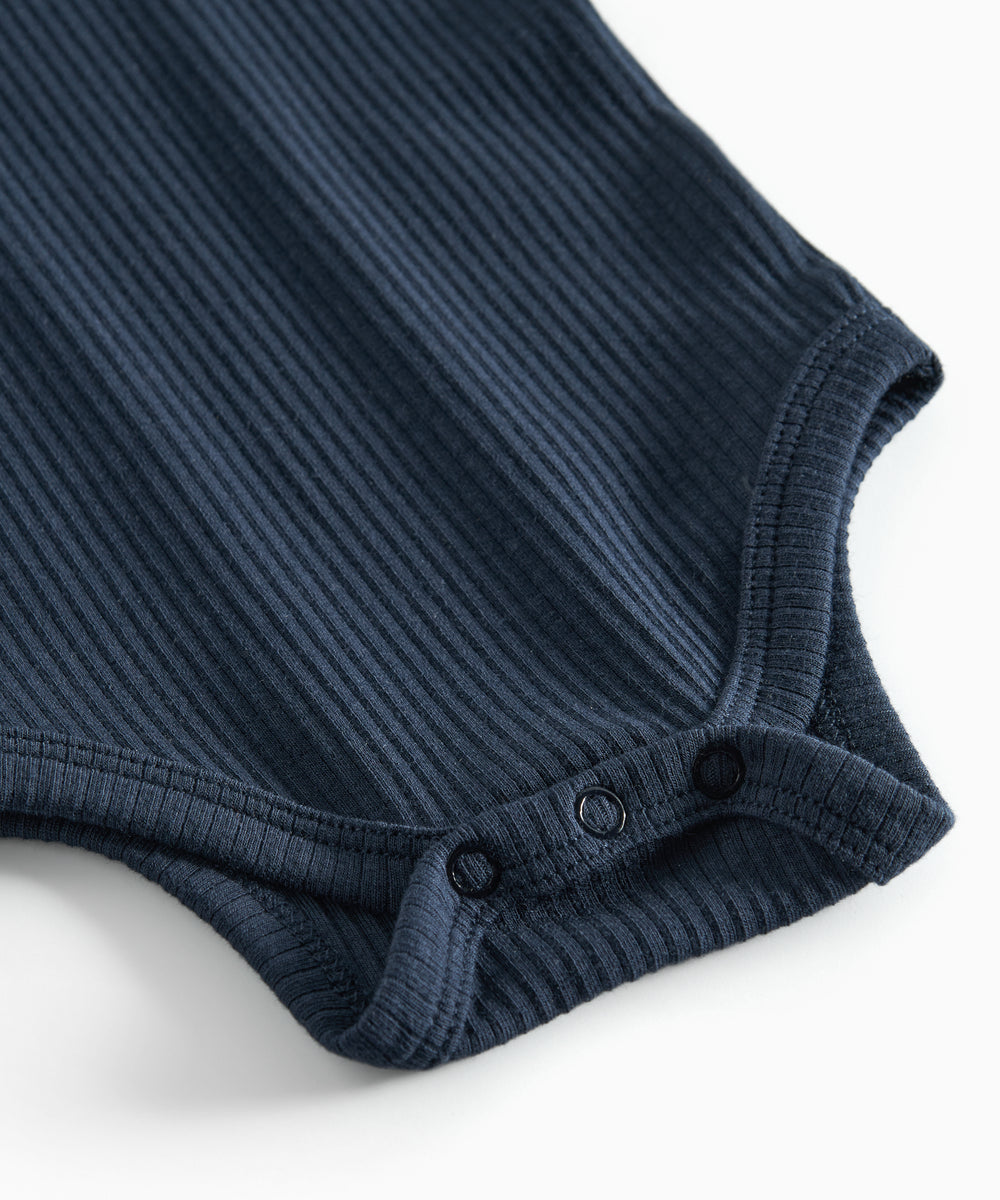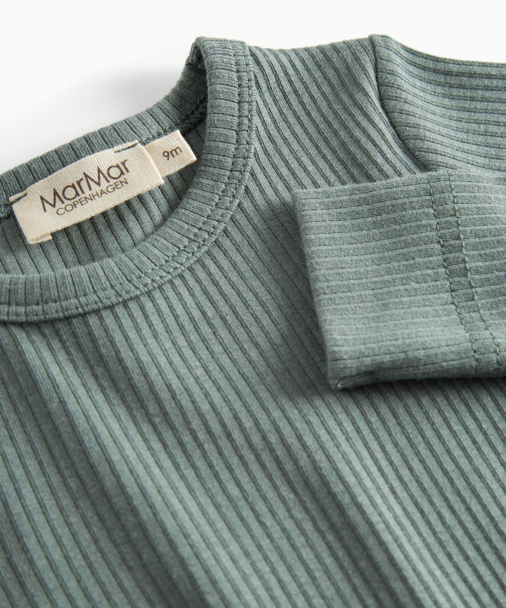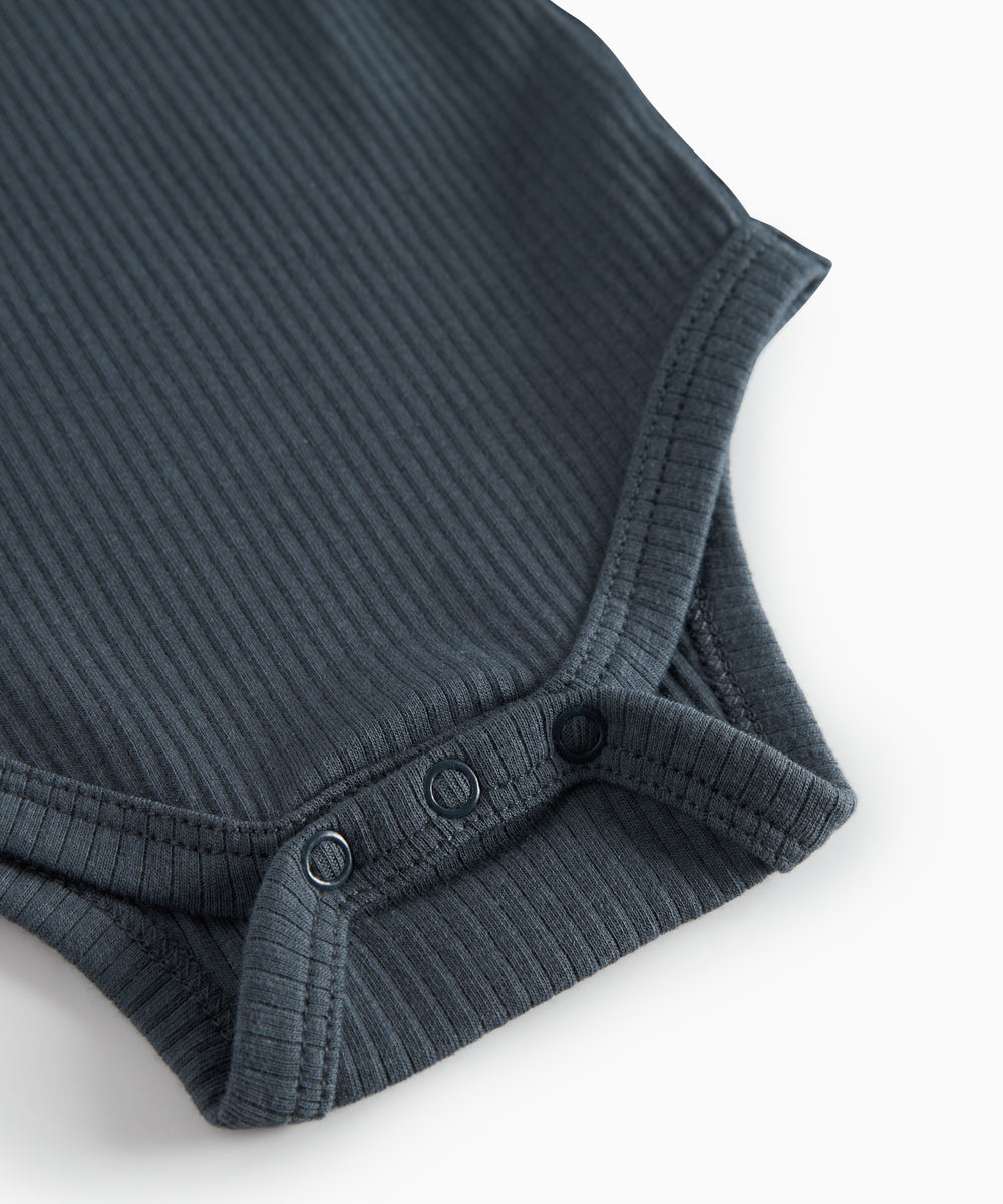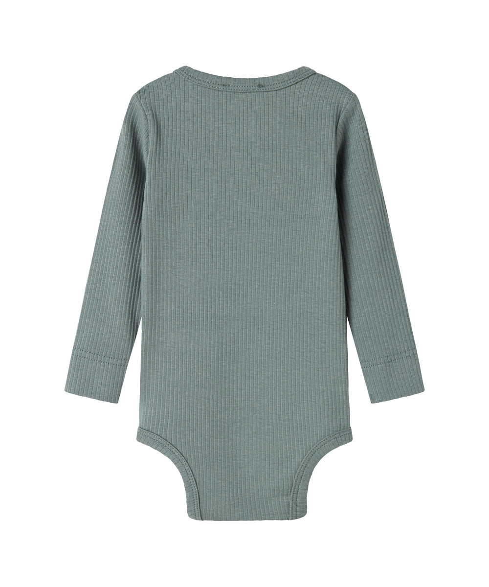 Baby iført mørkegrøn ribbet body med stolpeknapper