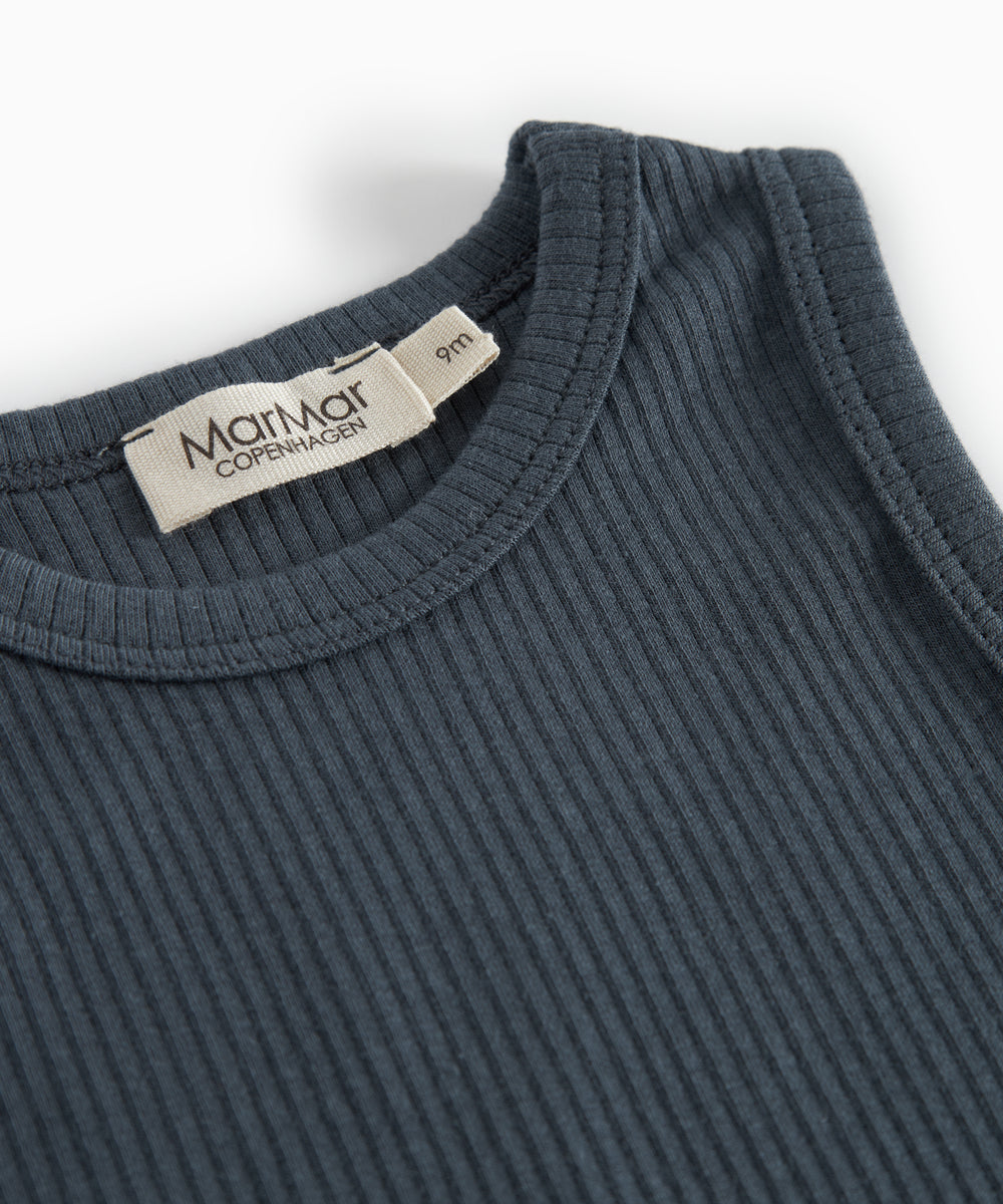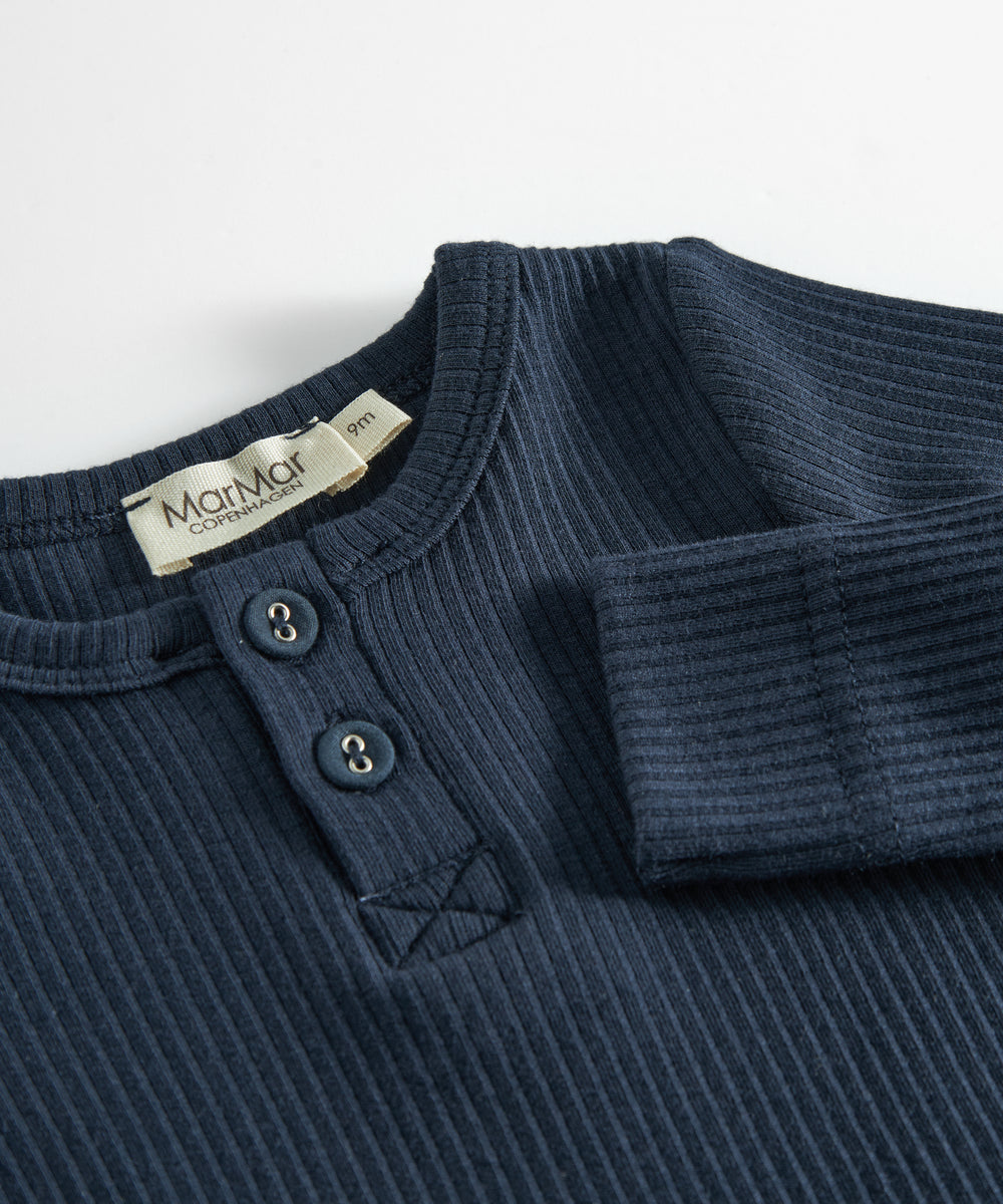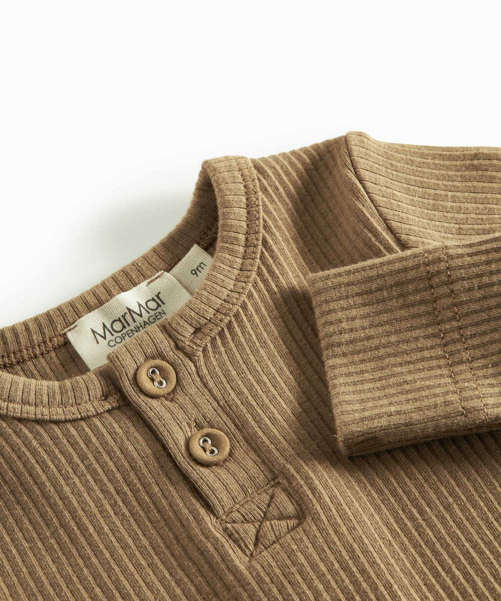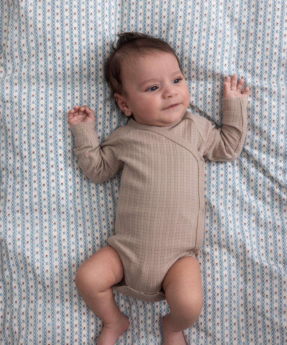 Baby iført mørkegrøn ribbet body med stolpeknapper