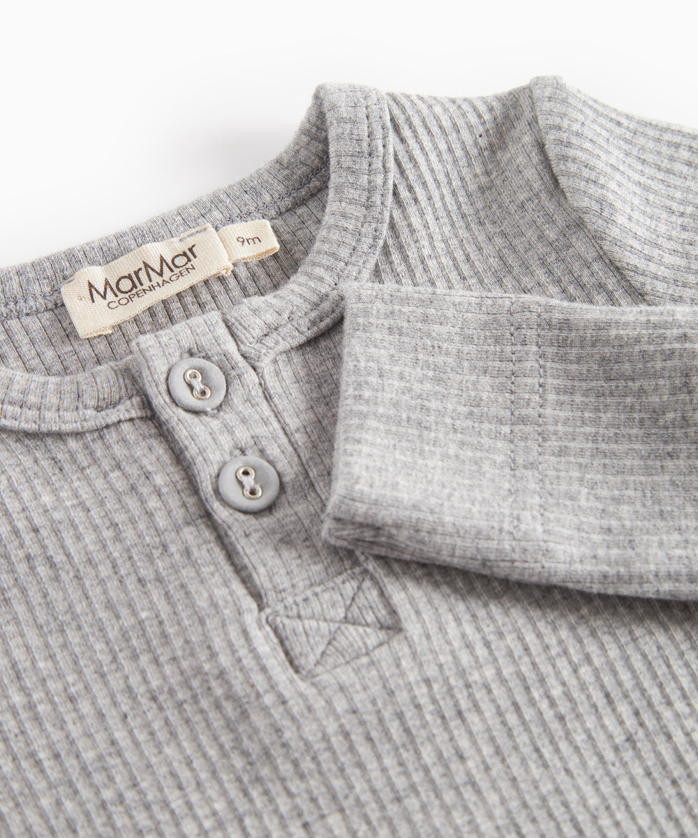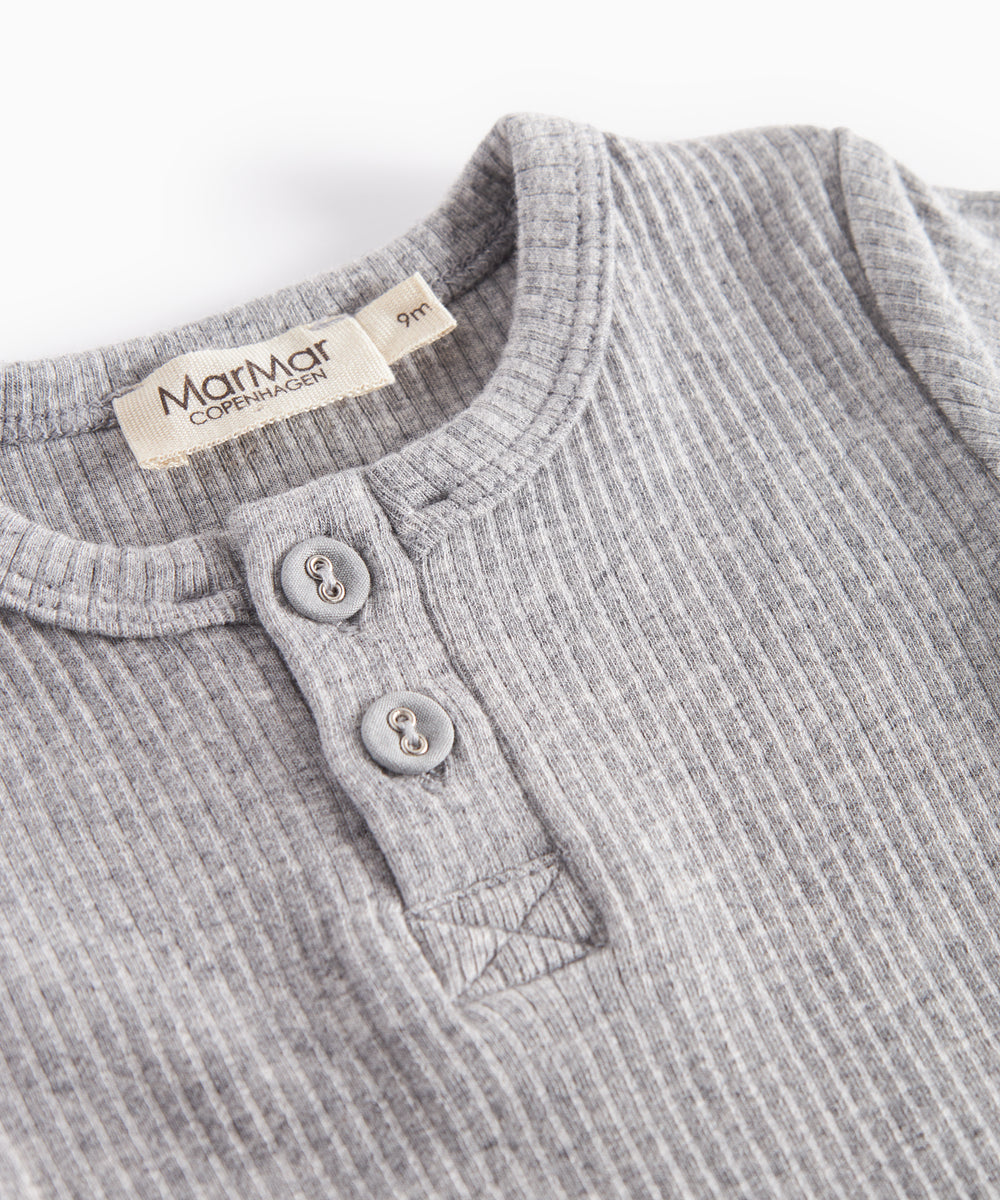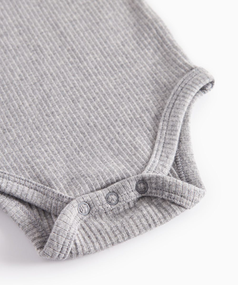 Lysegrå ribbet body med lange ærmer og flæsekrave til baby