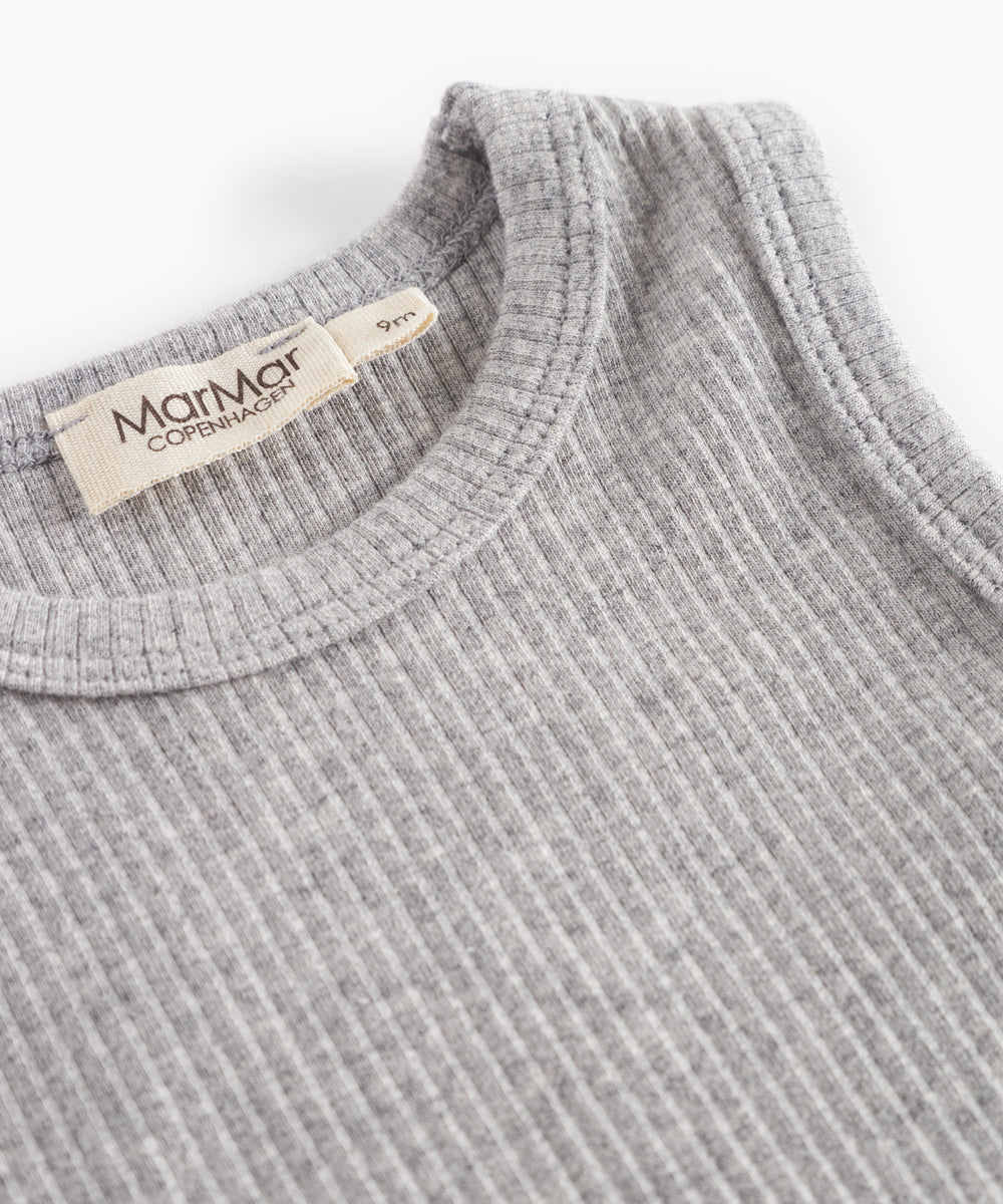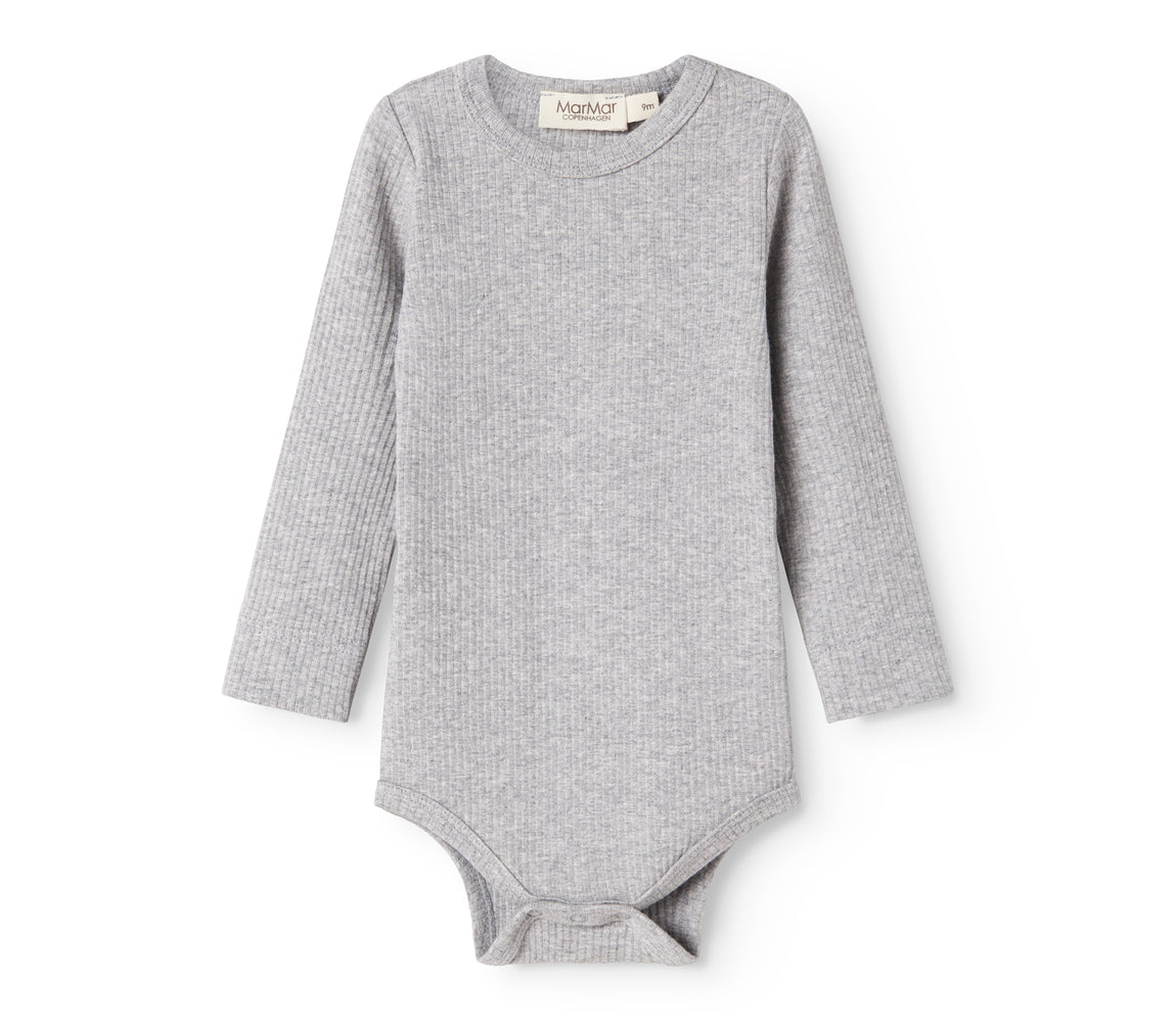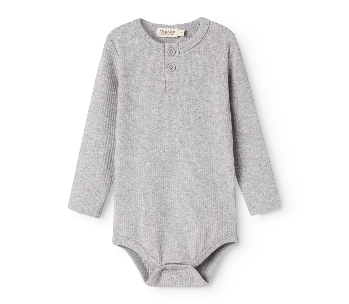 Lysegrå ribbet body med lange ærmer og flæsekrave til baby