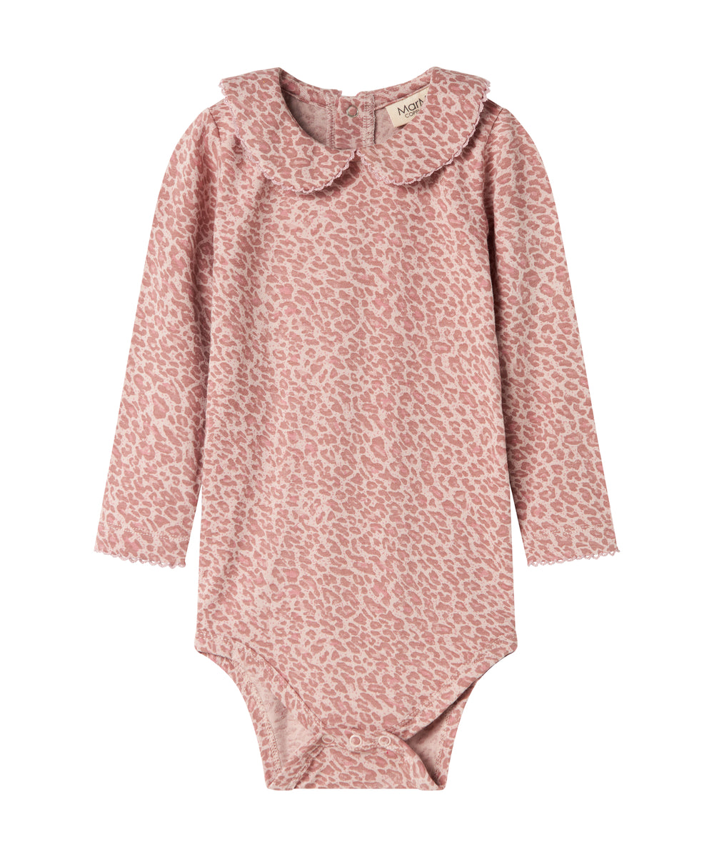 Baby iført støvet rosa body med flæsekrave