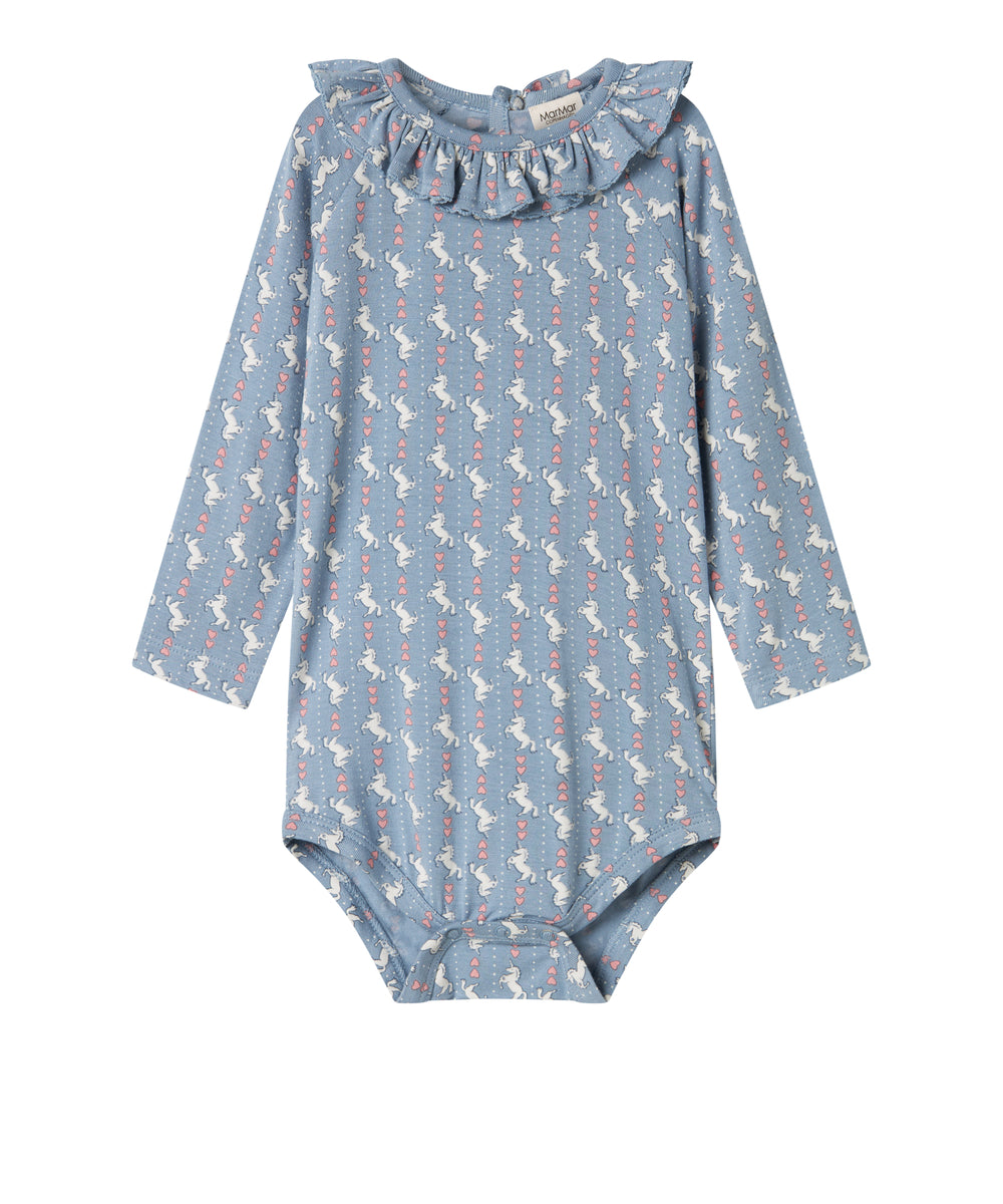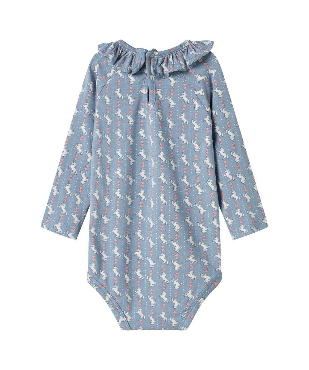 Blå langærmet body til baby med enhjørningemønster og flæsekrave