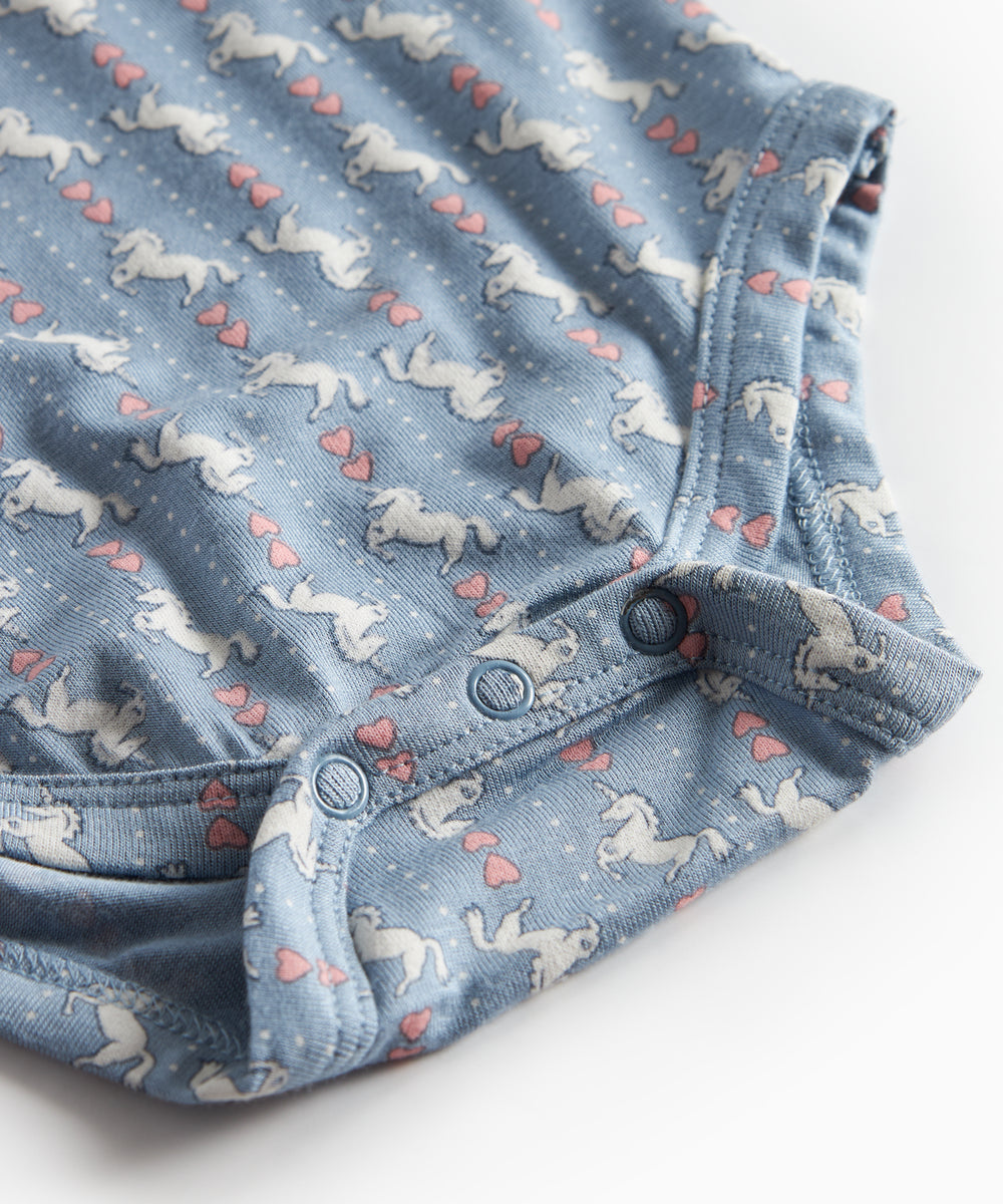 Baby iført blå body med enhjørningemønster og flæsekrave