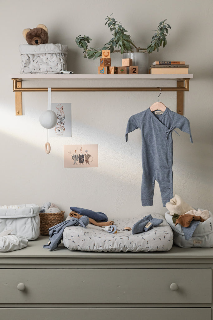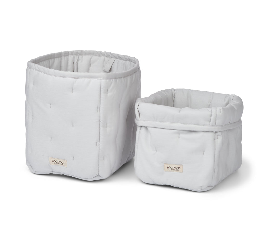 2 quilted baskets for changing supplies. The small one measures W:15cm x L:21cm x H:20cm. The large one measures W:17cm x L:25cm x H:20cm