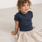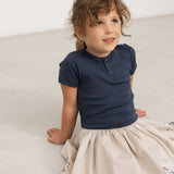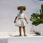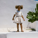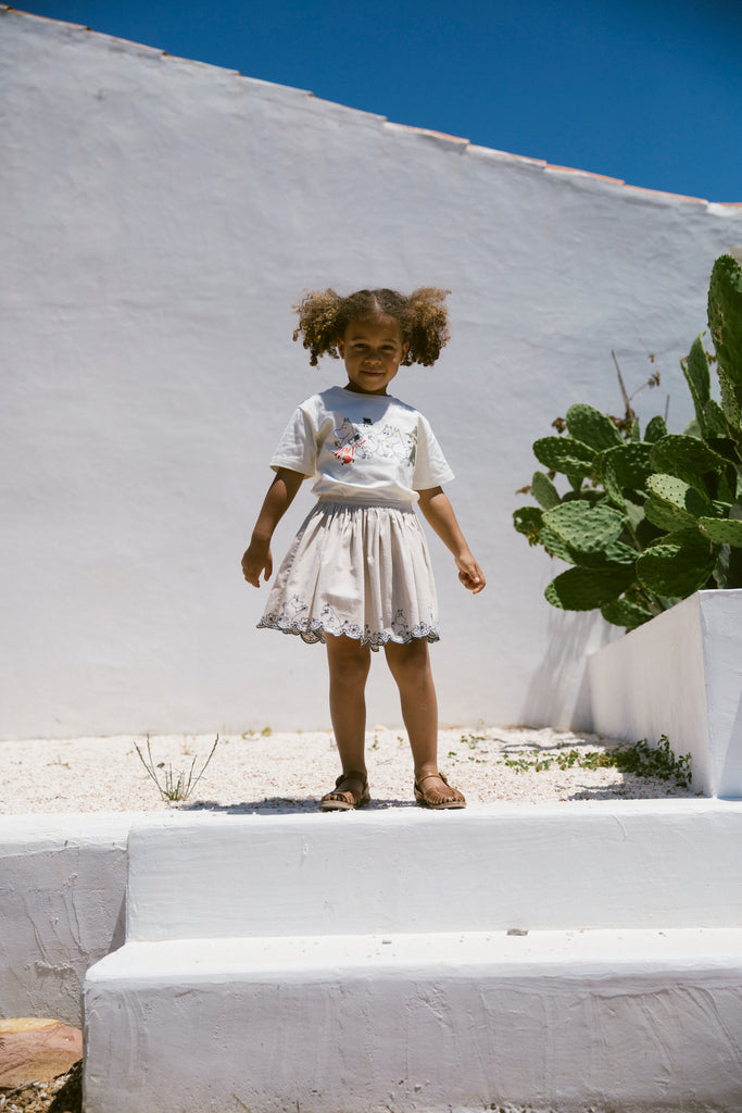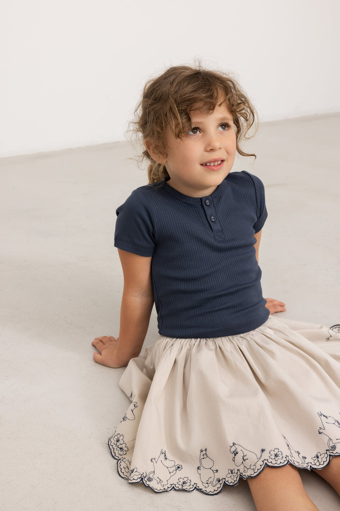 Skirt with elastic waist and fine hooped edges with embroidered Moomin details at the bottom. The length of the skirt goes above the knee.