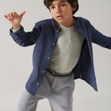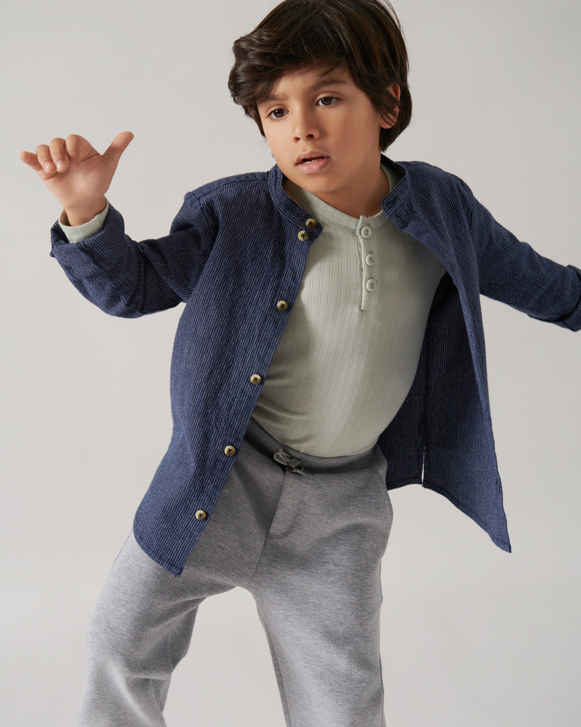 Long-sleeved striped chambray denim shirt with mandarin collar and button closure