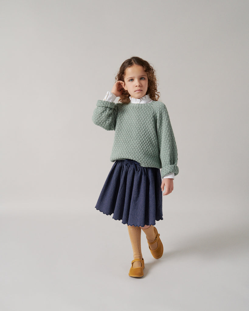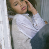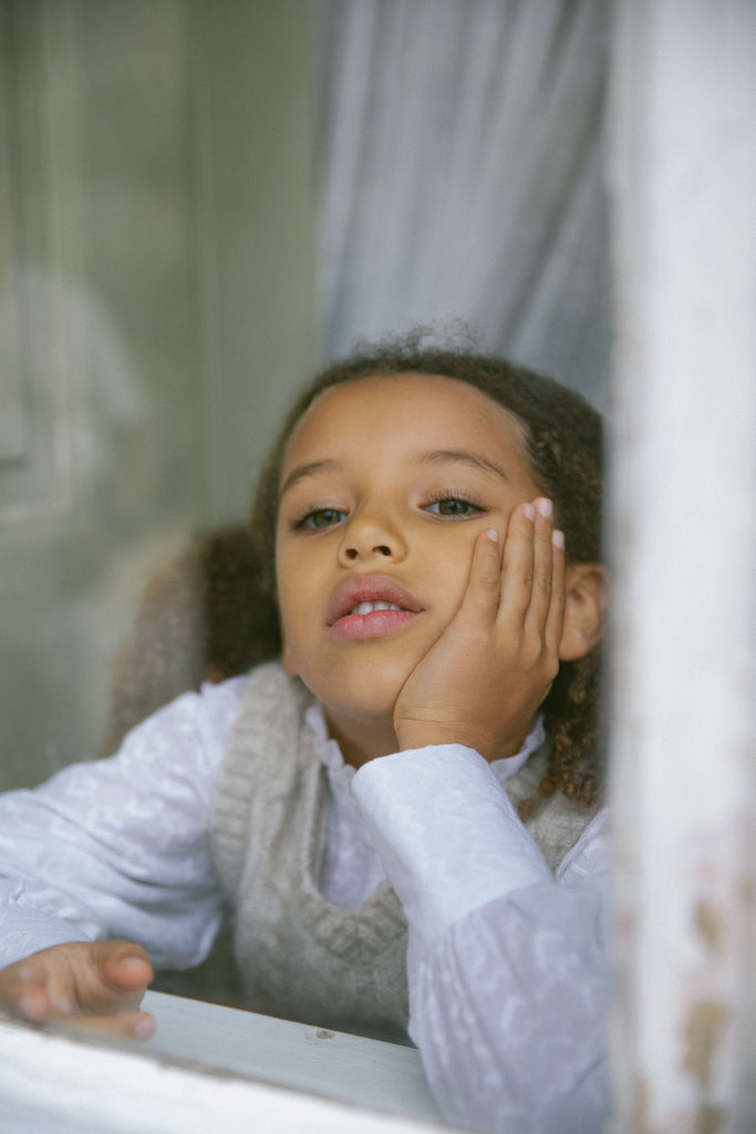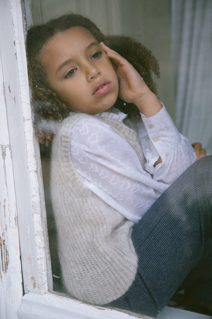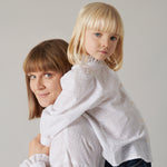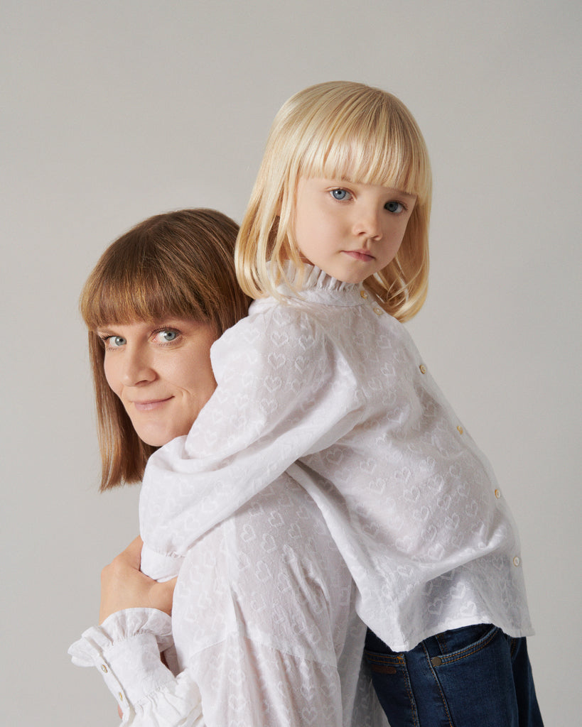 Shirt for children with fine heart embroidery, high ruffle collar, voluminous sleeves and buttons at the front