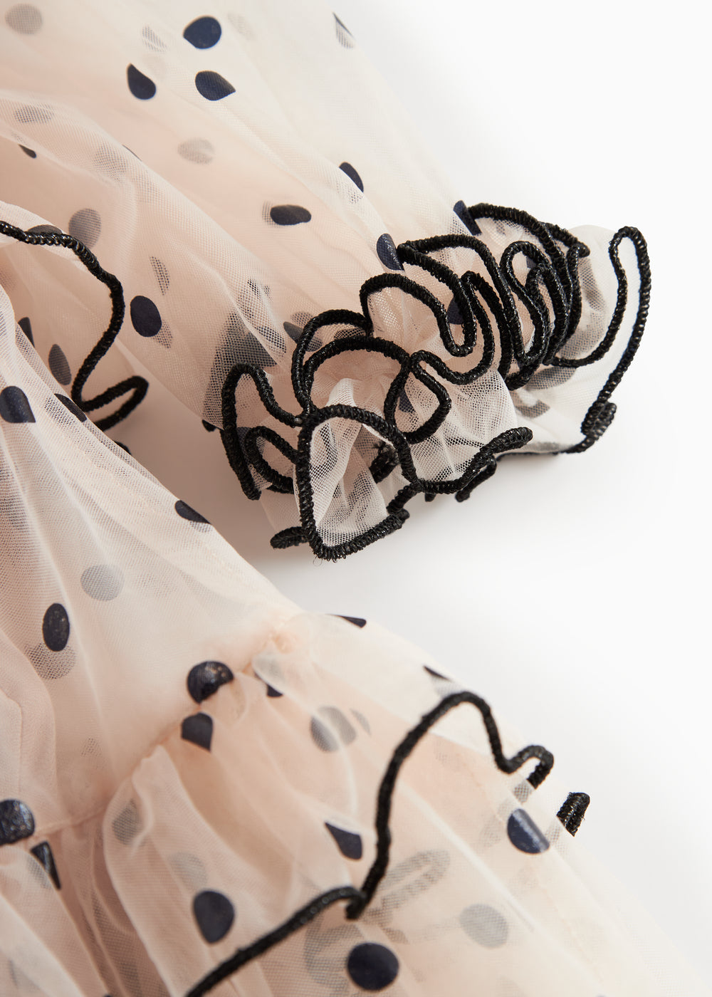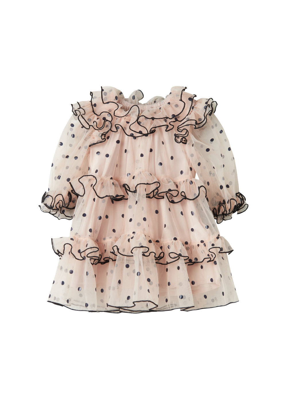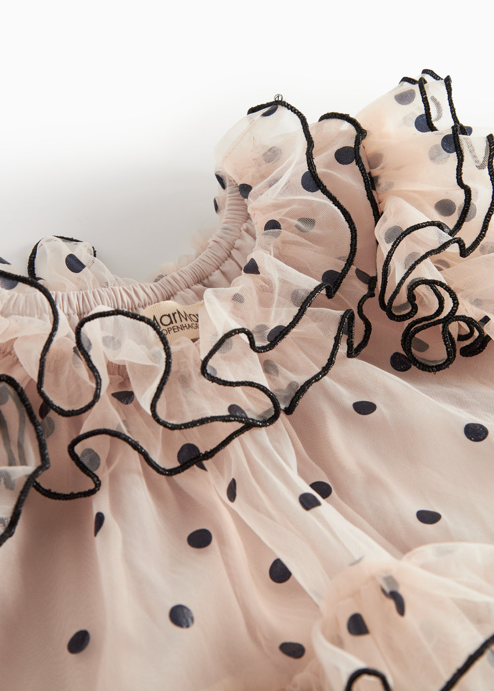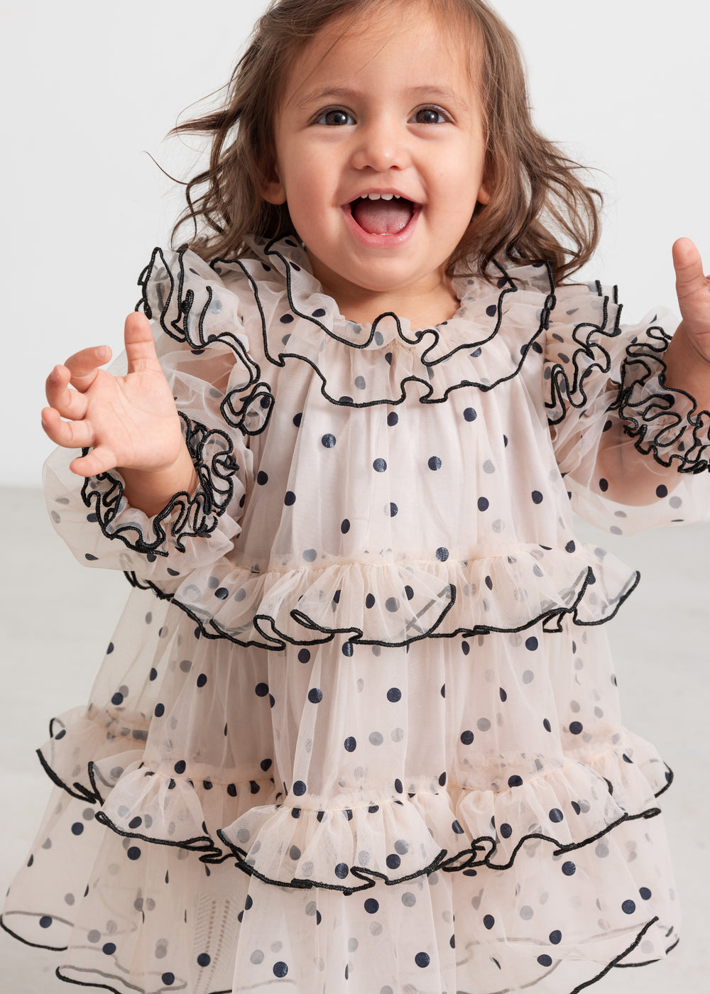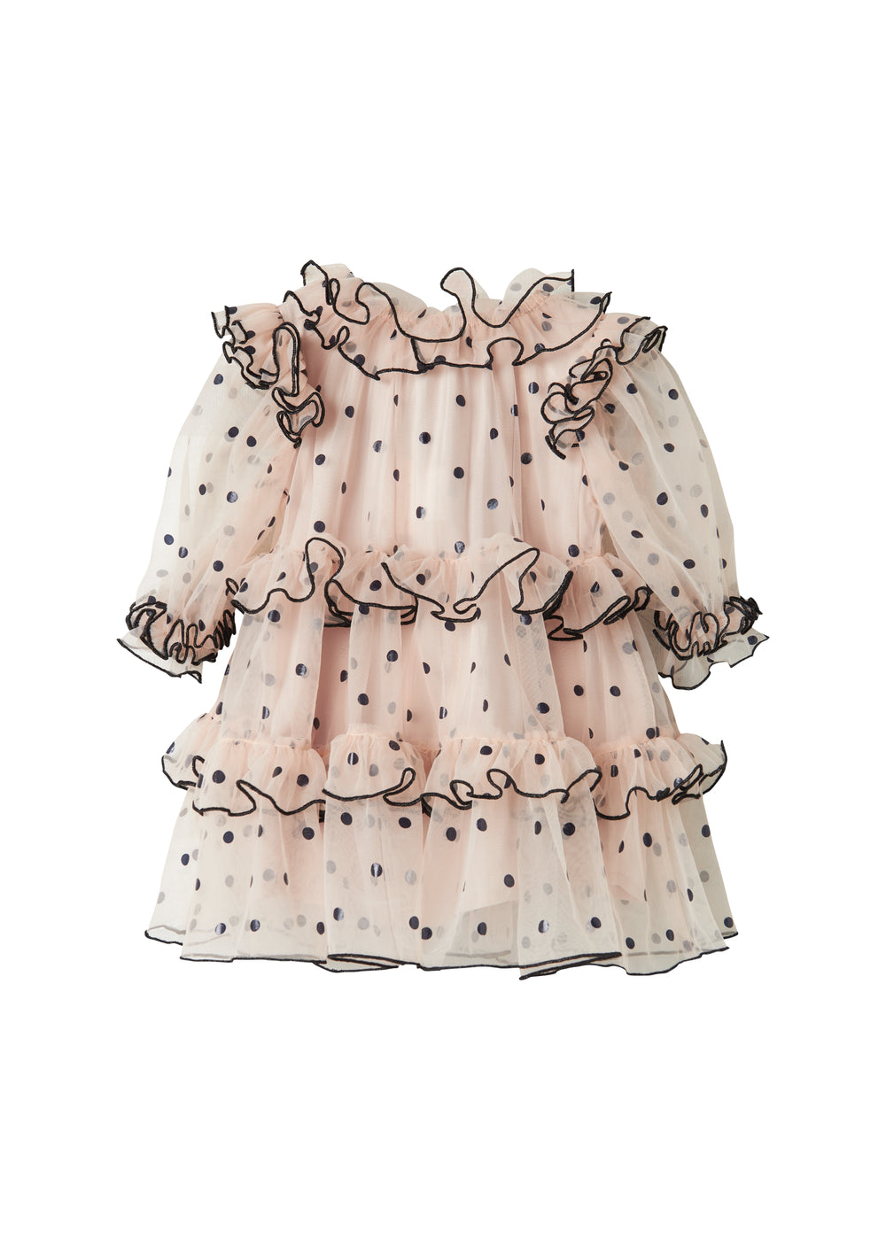 Short-sleeved baby dress with many layers of tulle for volume. The dress has beautiful metallic dots, a nice round collar with tulle ruffles and contrast edging. The length of the dress goes above the knees.