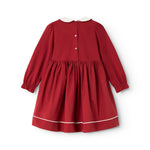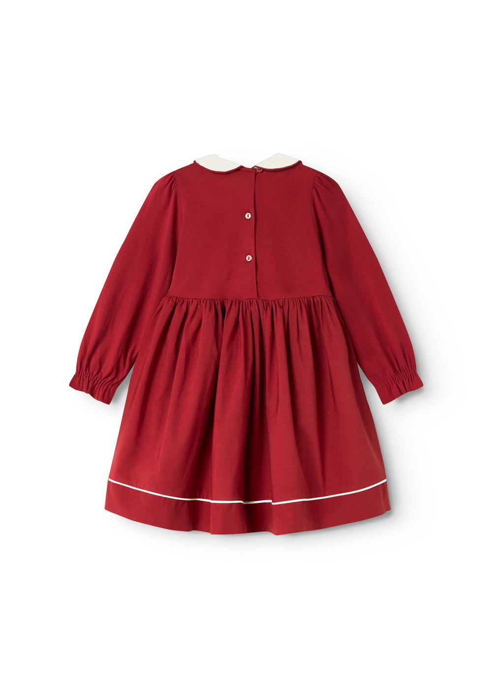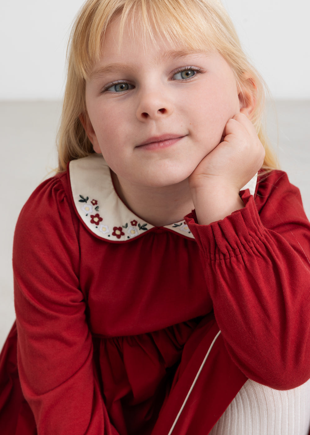 Long-sleeved dress with a classic fit. The dress has a nice collar with floral embroidery. The skirt is wide and ends with elegant contrast piping at the bottom. The sleeves have elastic at the wrists and the dress is perfect for special occasions and holidays. The length of the dress goes above the knee.