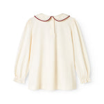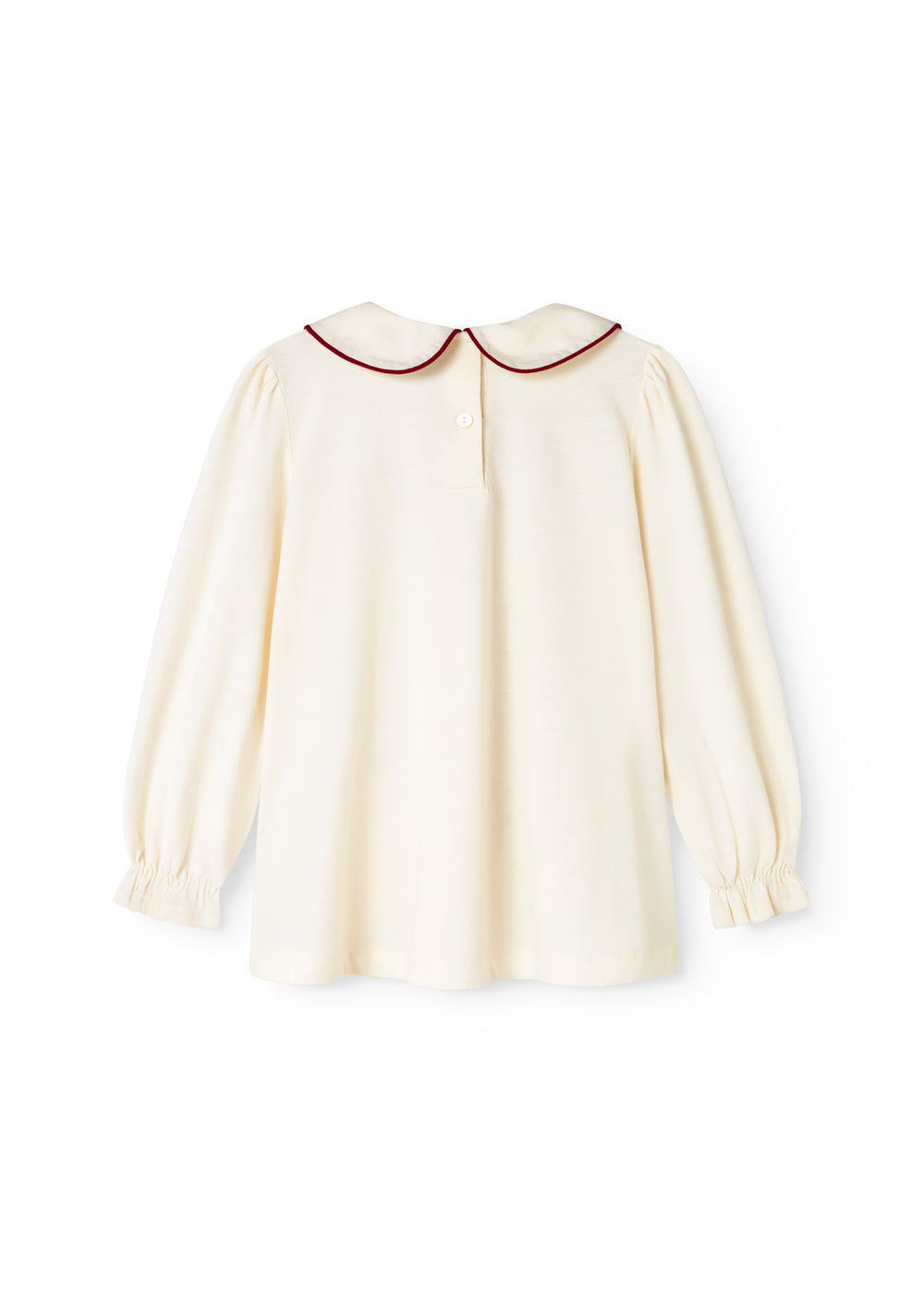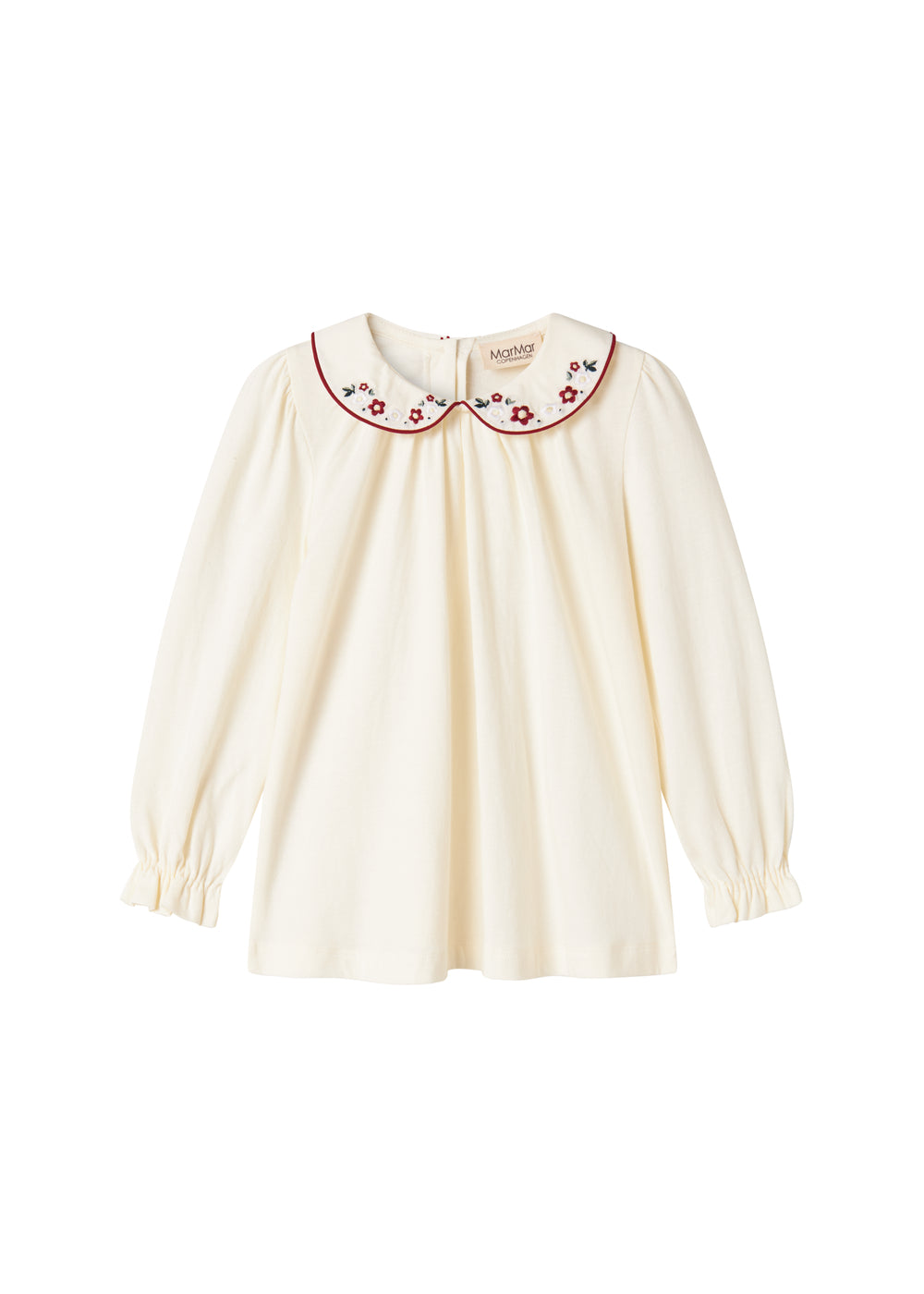 T-shirt with long sleeves and a nice collar with floral embroidery details. The blouse closes with buttons at the back. The T-shirt is both soft, stretchy and comfortable to wear.
