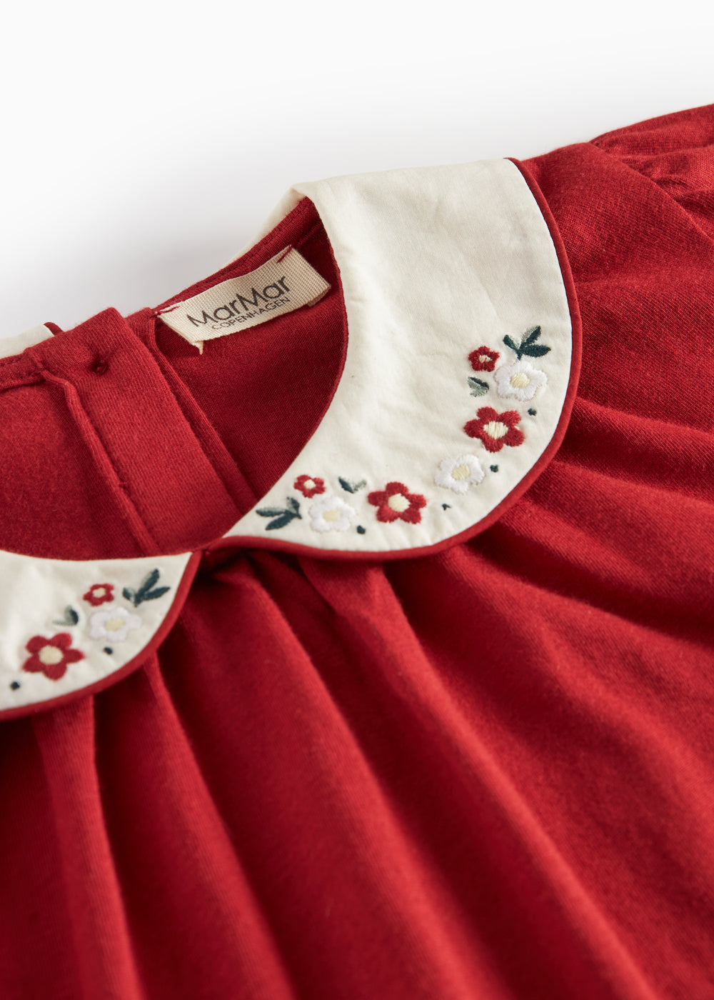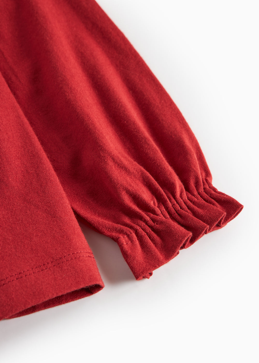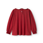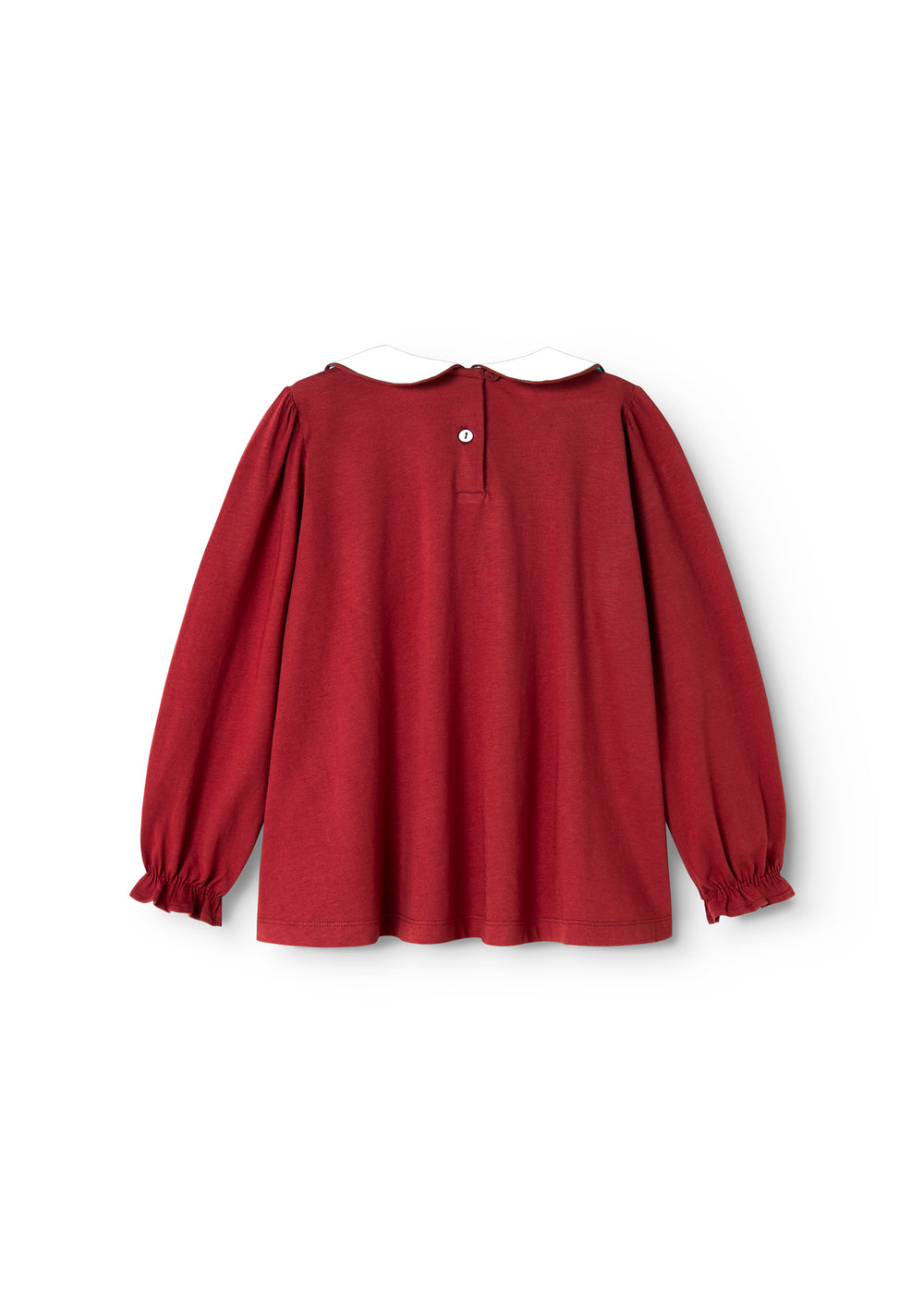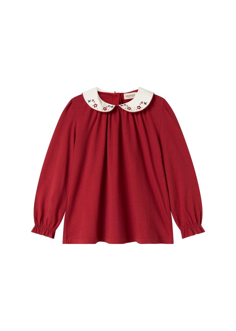 T-shirt with long sleeves and a nice collar with floral embroidery details. The blouse closes with buttons at the back. The T-shirt is both soft, stretchy and comfortable to wear.