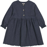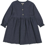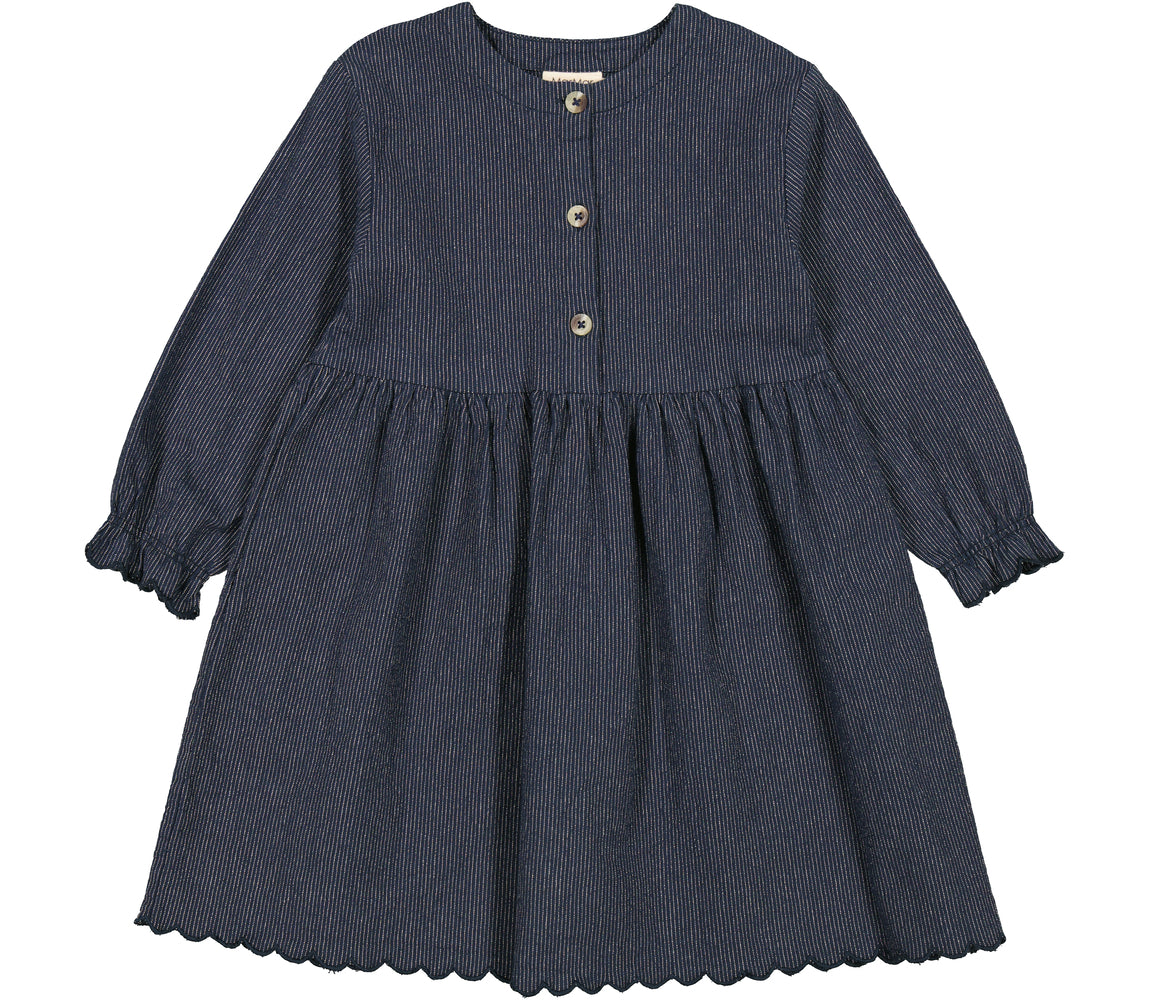Long-sleeved striped chambray denim dress with button closure at the front and a nice cut. The dress has a cute wave embroidery at the bottom and on the sleeves. The length of the dress goes above the knee