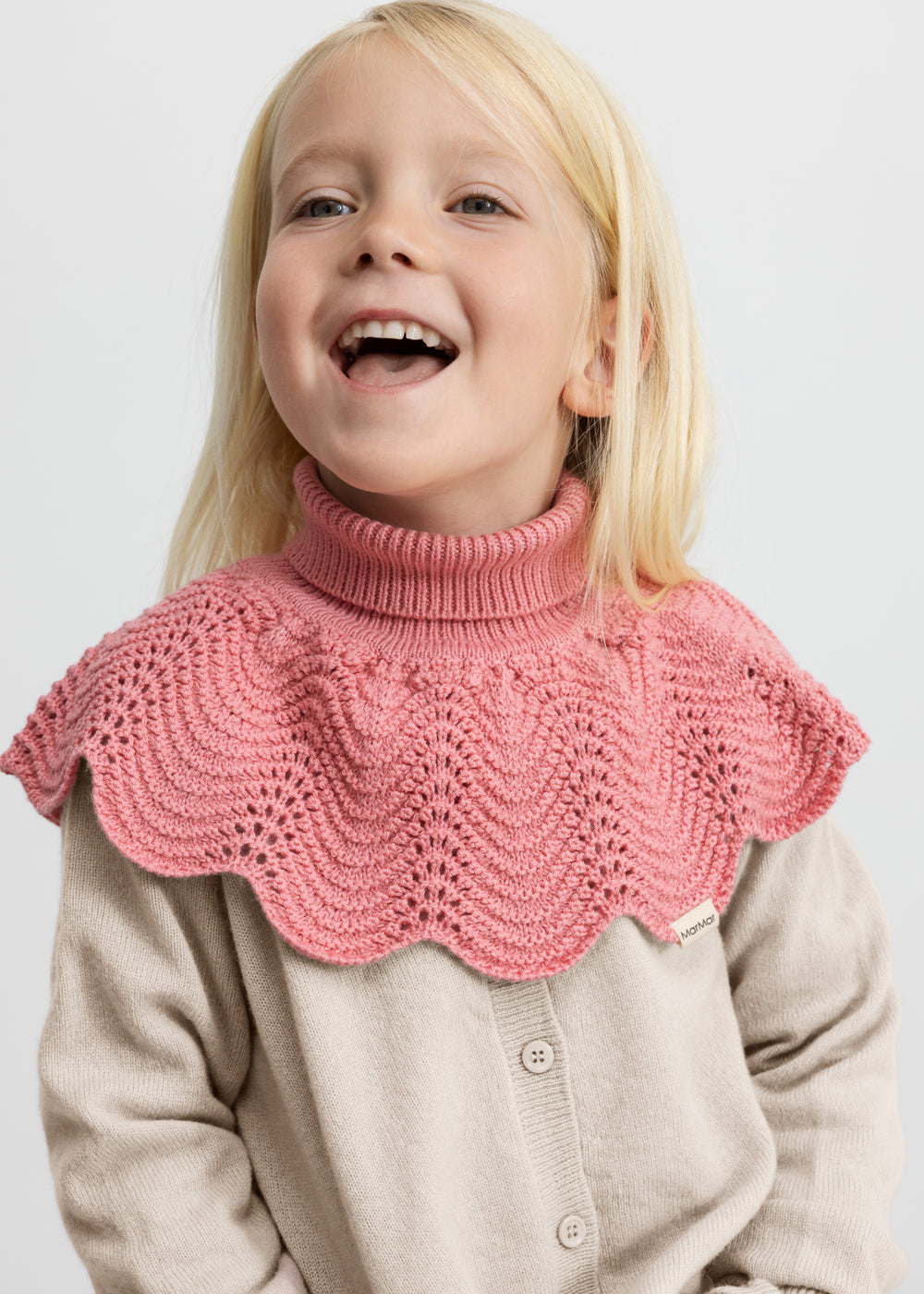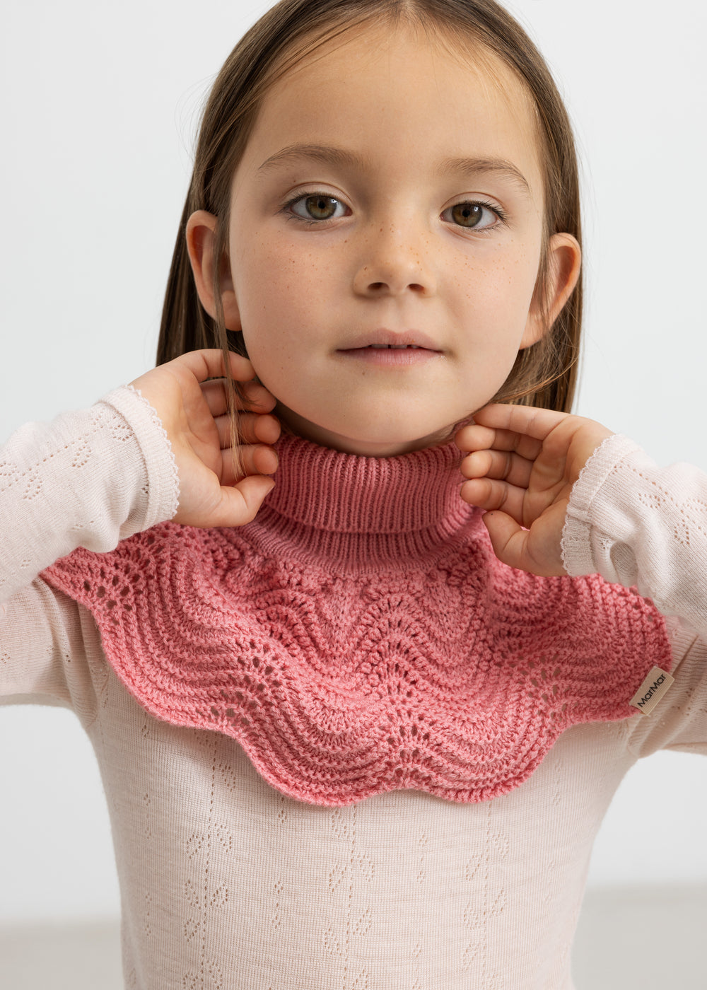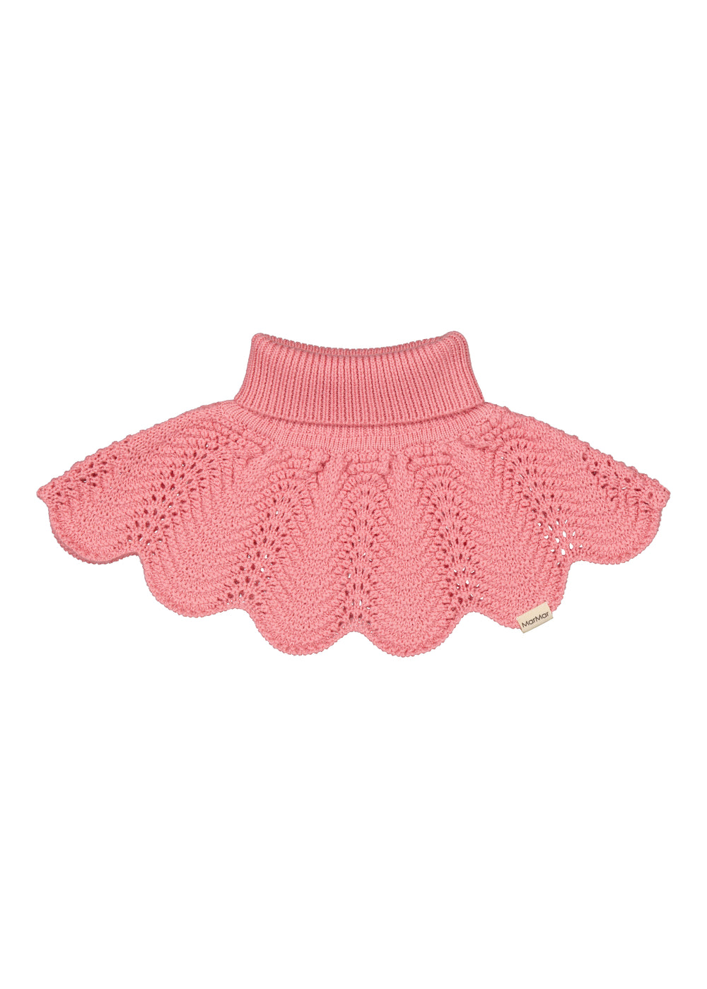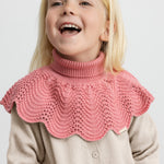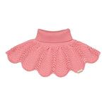 Knitted neck warmer that provides optimal protection against the cold by covering the neck while still fitting comfortably. The neck warmer has decorative wavy edges and a lace pattern at the bottom that adds an elegant and feminine touch. The neck warmer is soft, warm and perfect for the colder days.