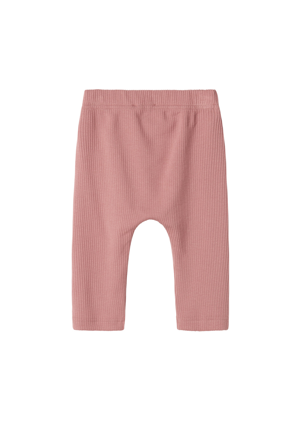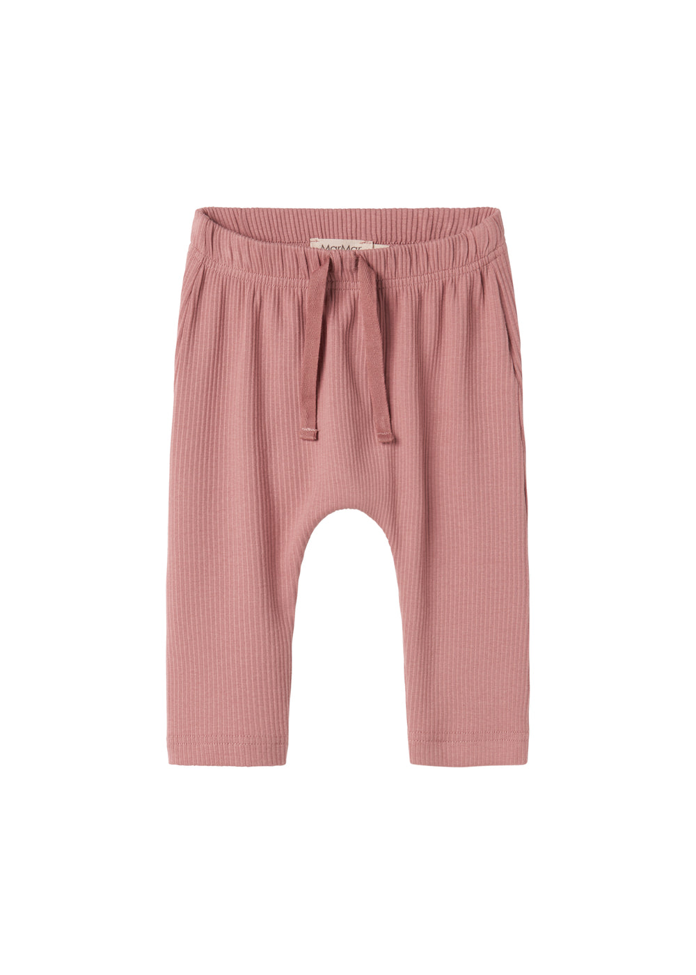 Baby pants with wide elastic and a tie at the waist. The pants are ribbed, soft, stretchy and comfortable to wear.