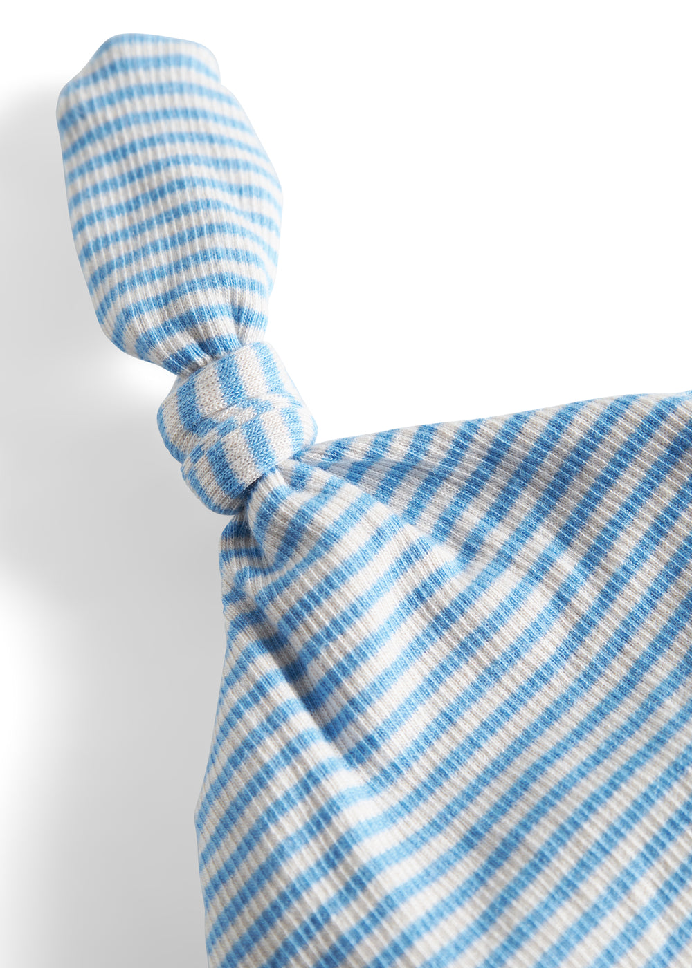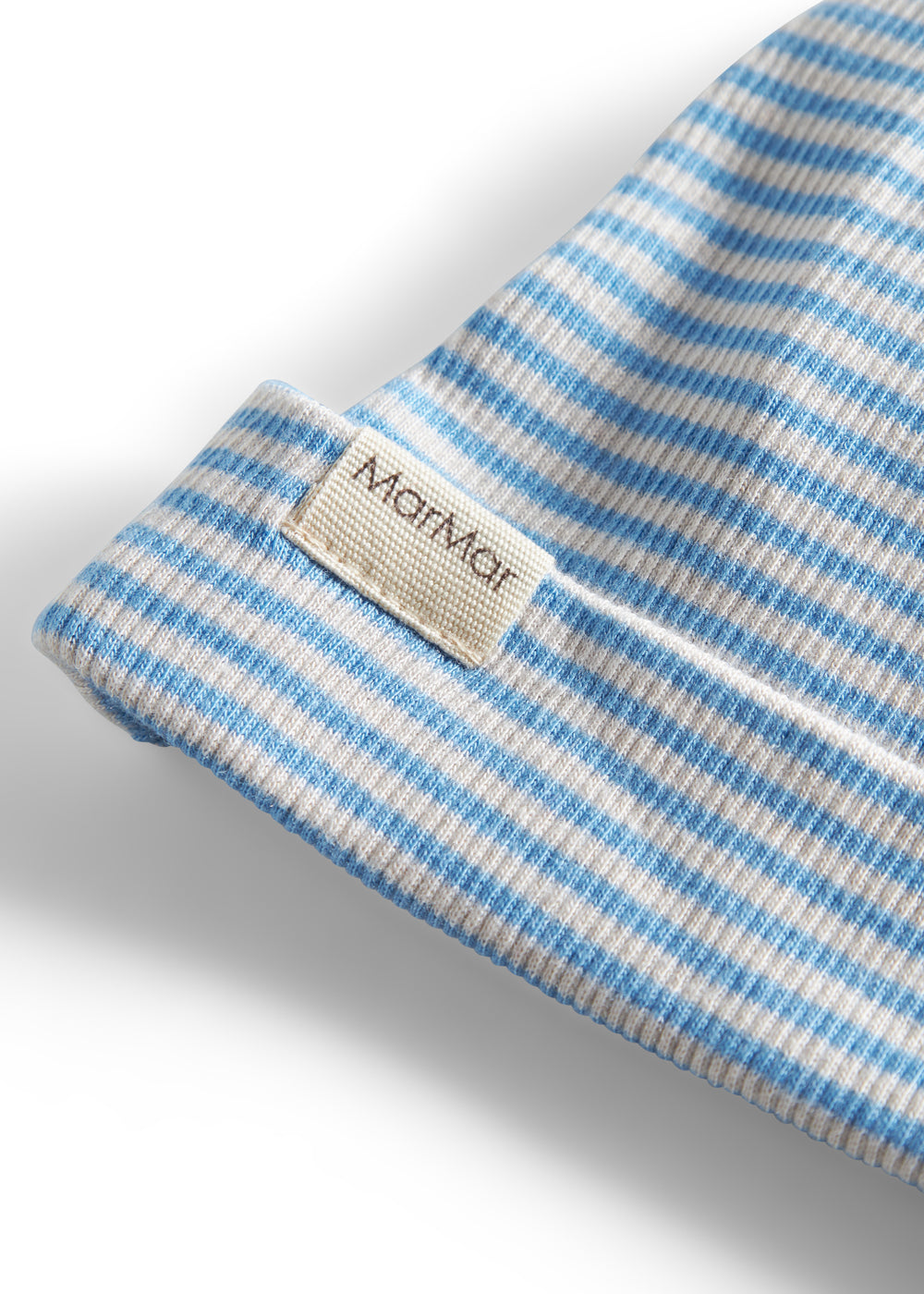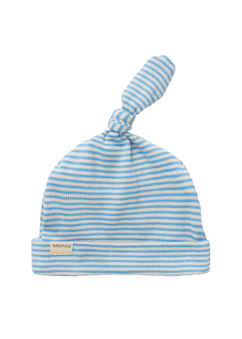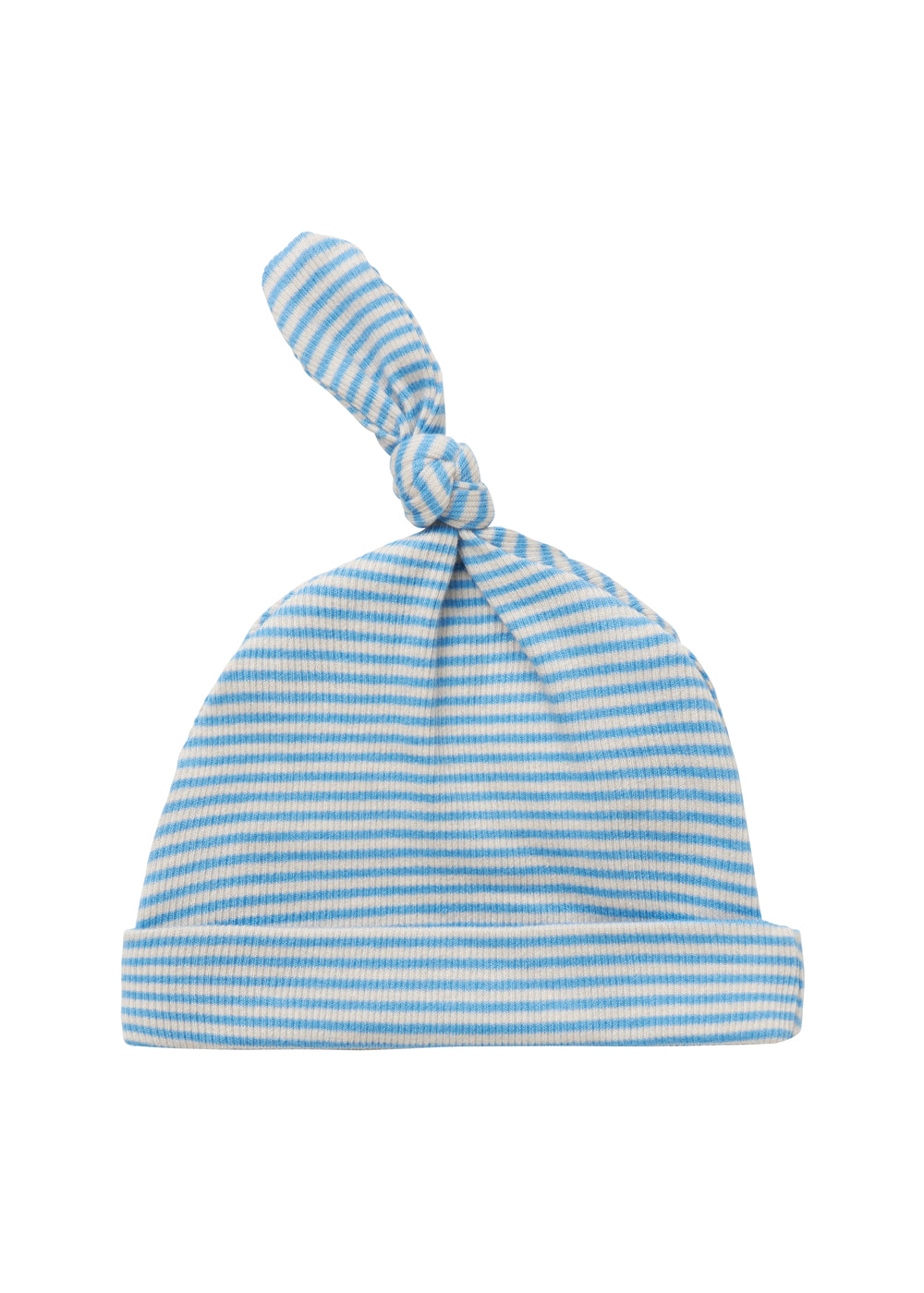 Small striped hat for newborns with a brim that can be folded down and a cute knot on top. The hat is soft, holds its shape and color and has elastane in it, which makes it stretchy and comfortable to wear.