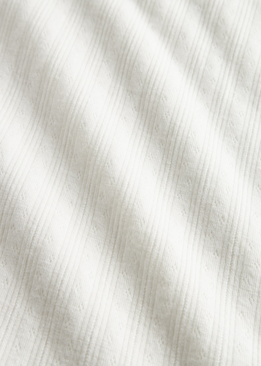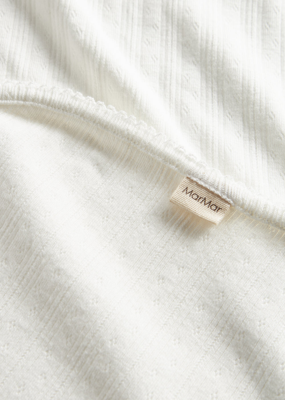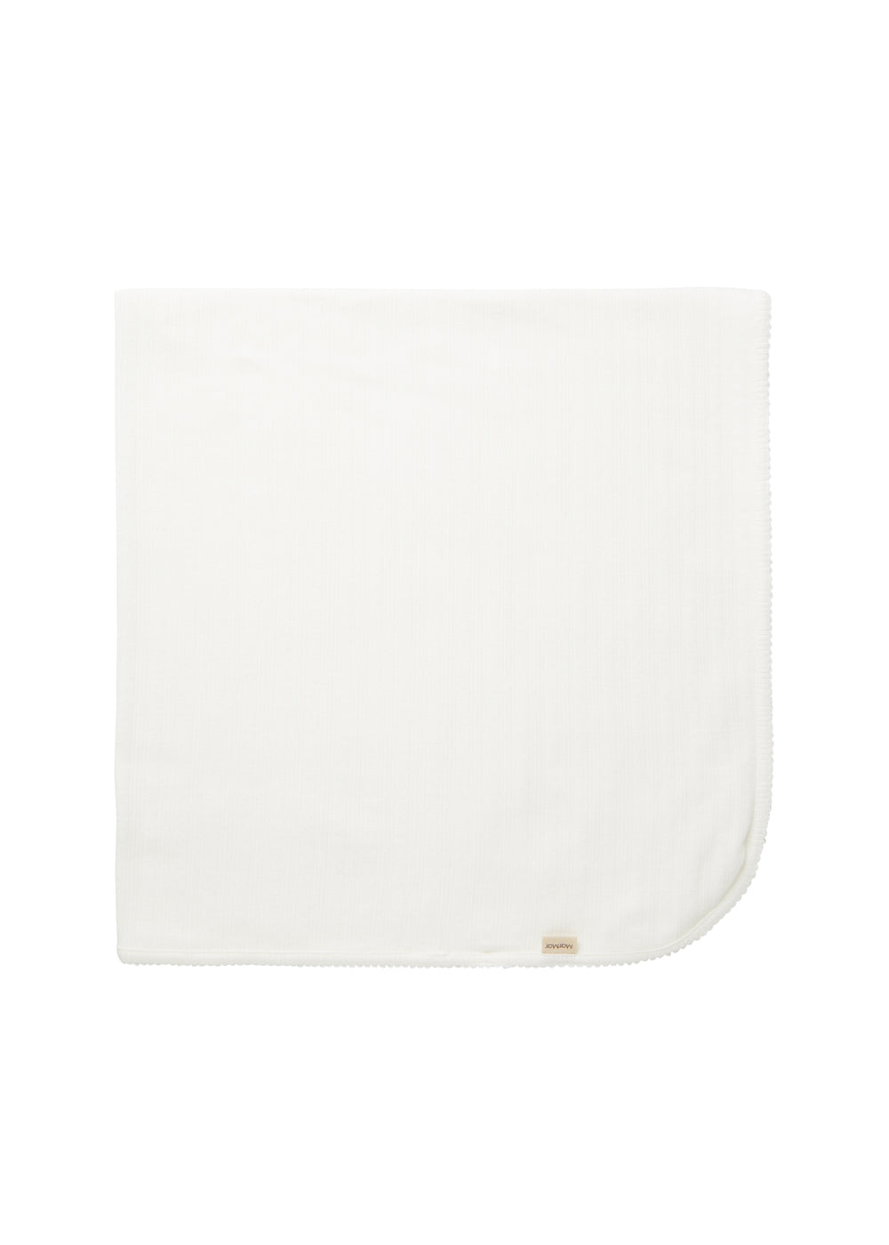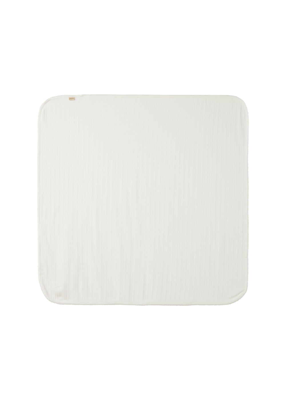 Baby pointelle blanket with rounded corners and picot edges. The blanket measures 80 x 80 cm. The blanket is soft, stretchy and comfortable to wear.