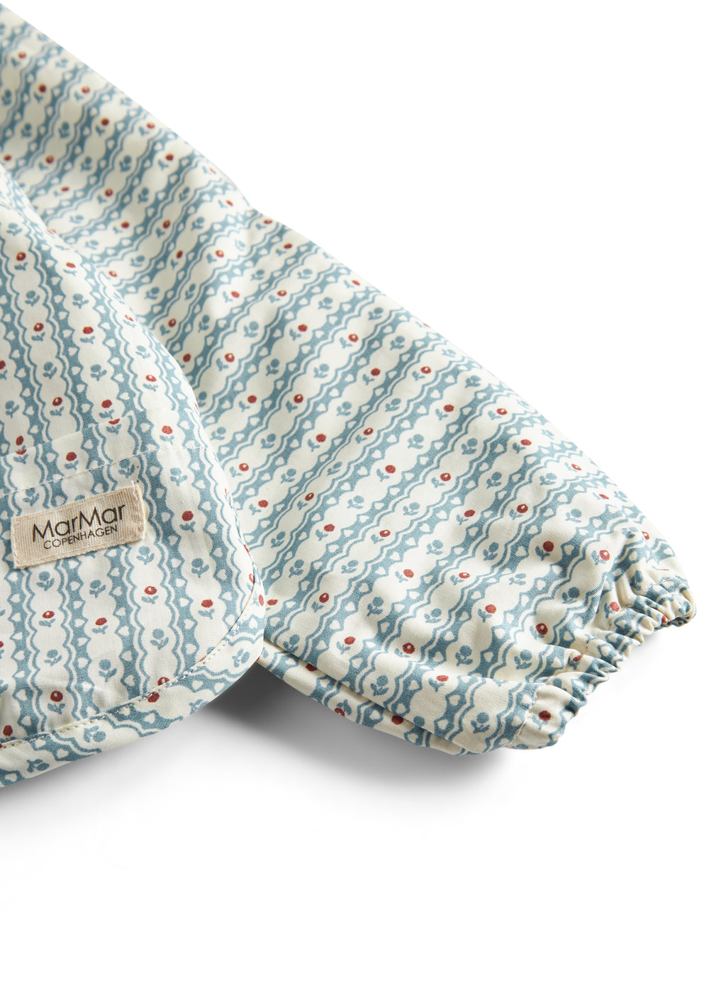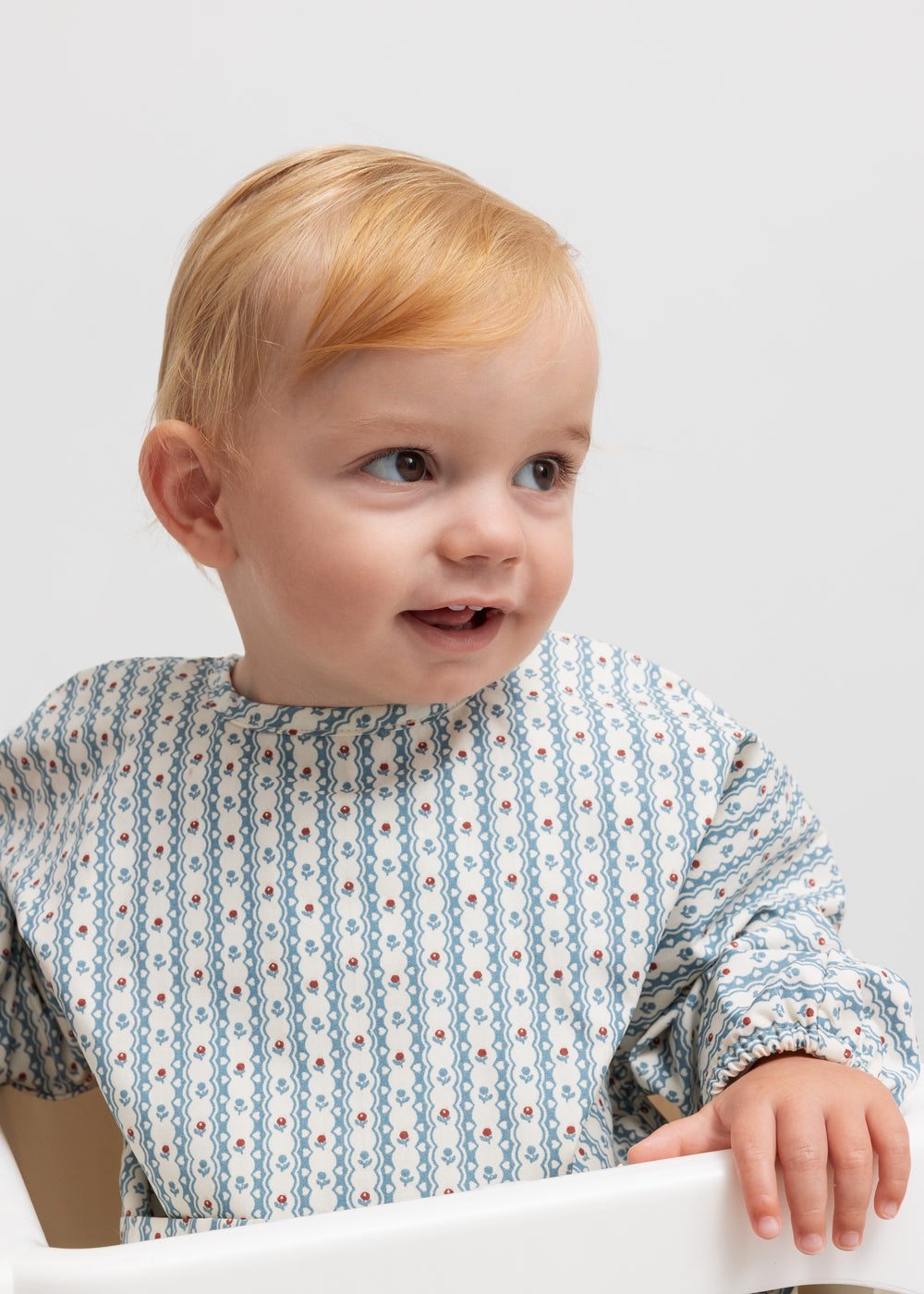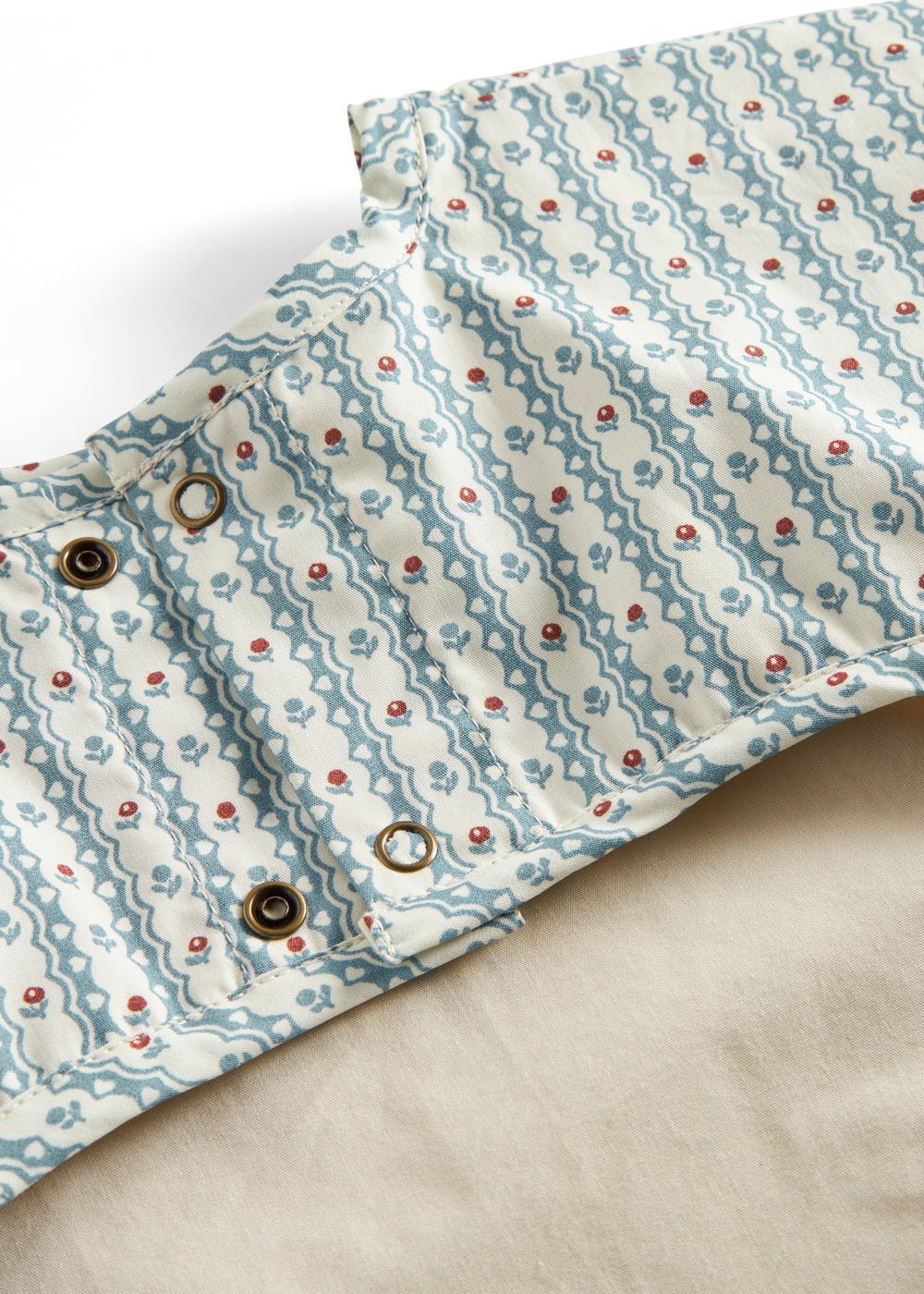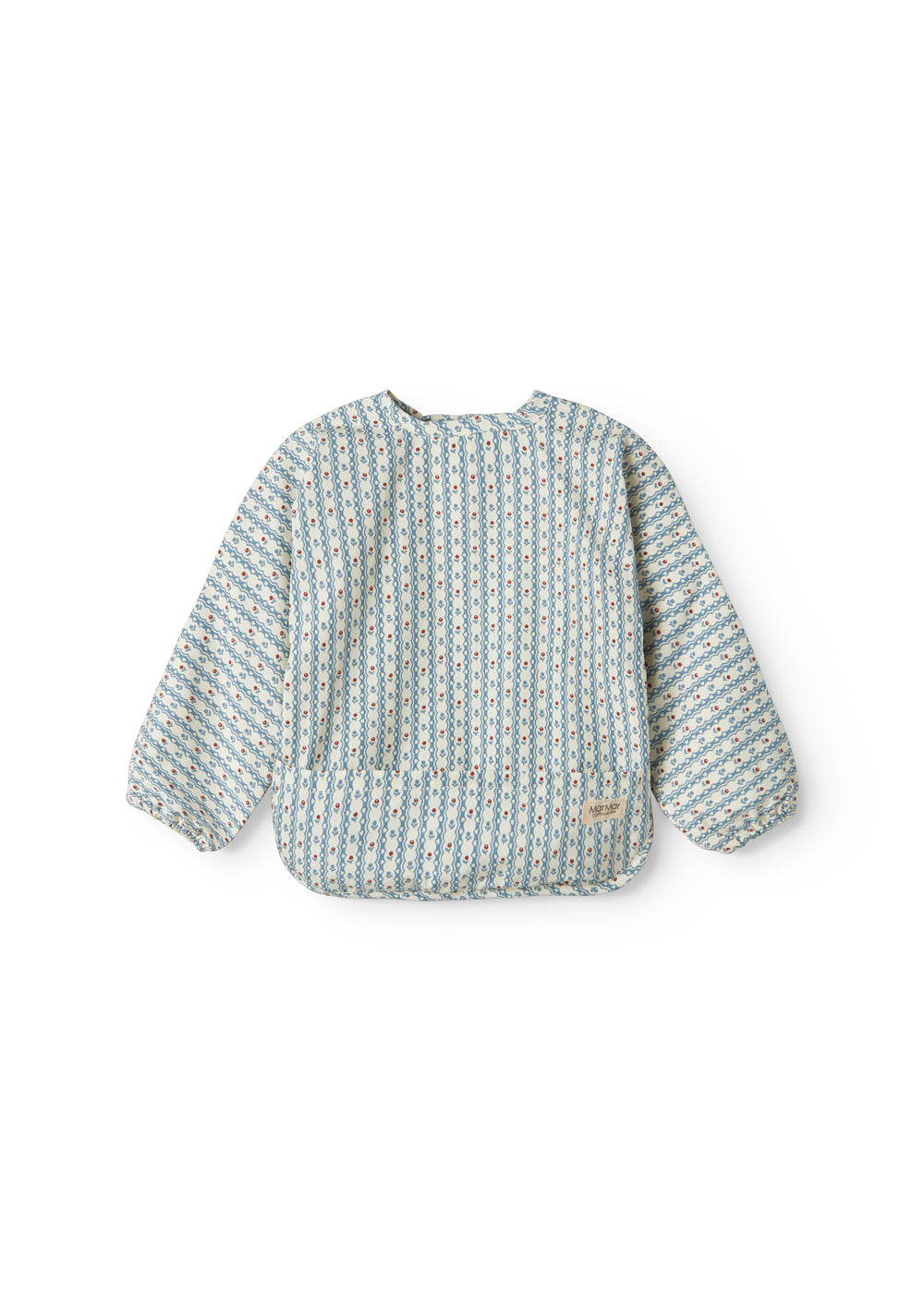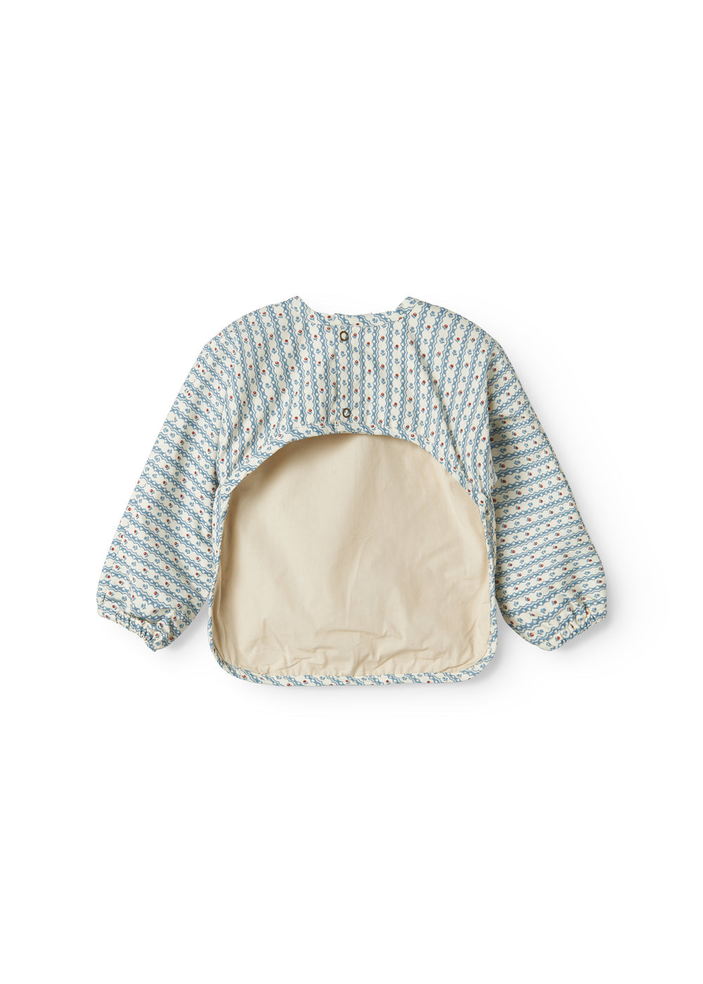 Long-sleeved apron with button closure at the back. The apron has a water-repellent coating so it is easy to wipe off.