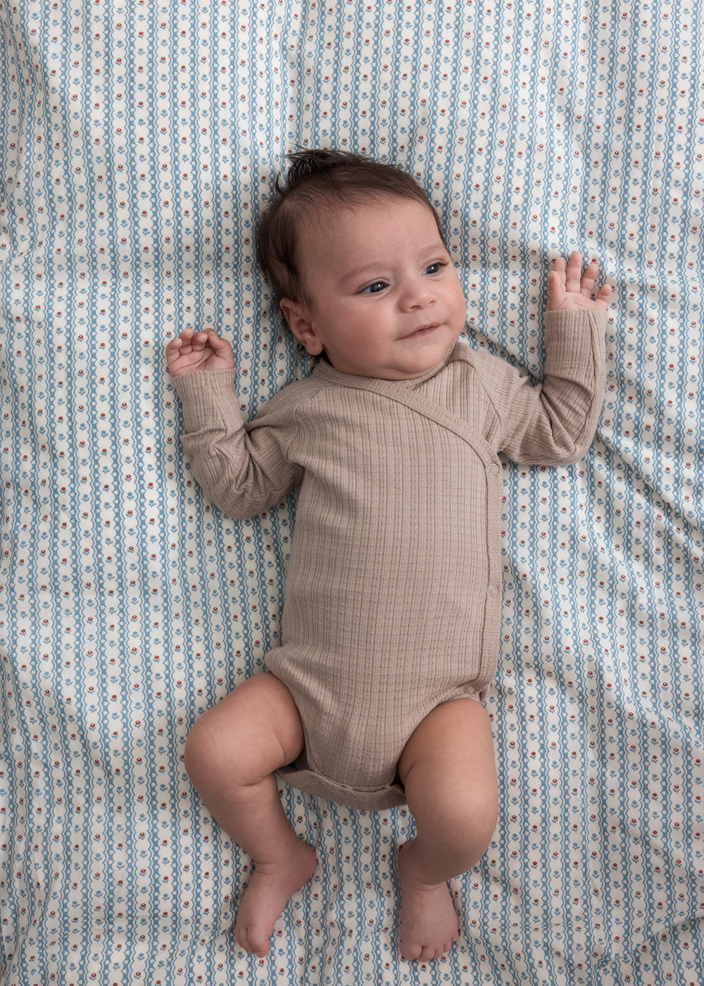 Long-sleeved pointelle patterned bodystocking for newborns with wrap-around closure. The bodystocking closes with snaps and is both soft, stretchy and comfortable to wear.