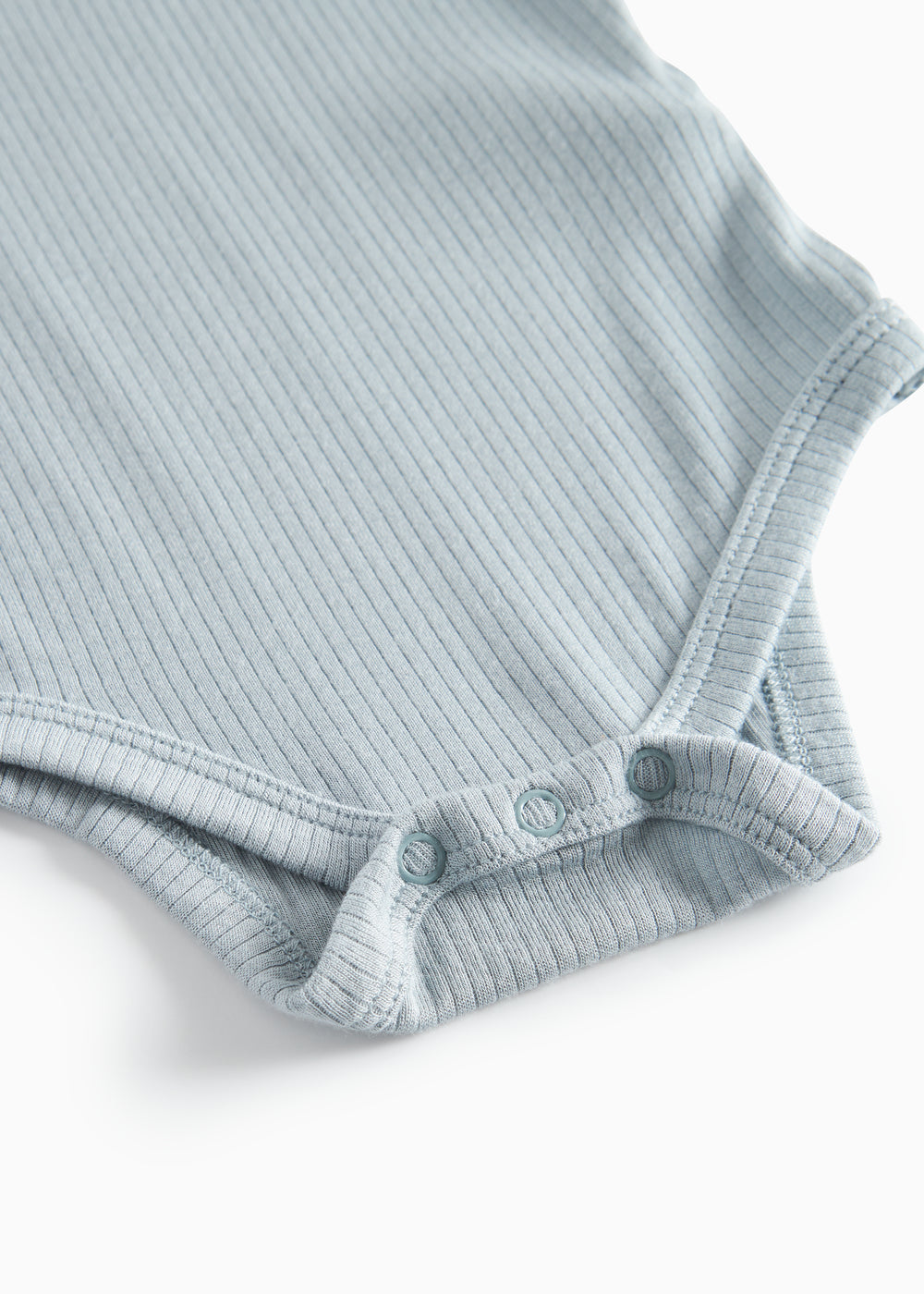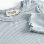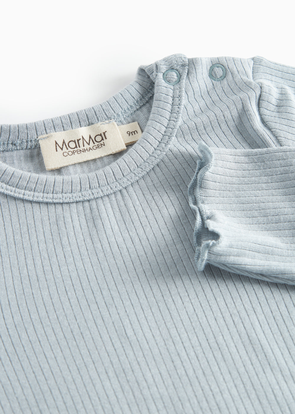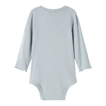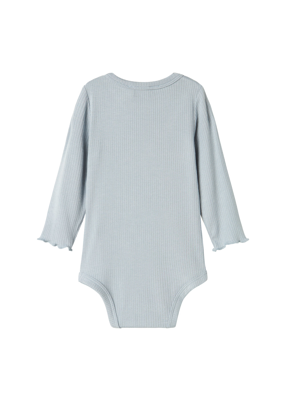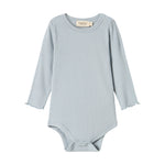 Simple long-sleeved bodystocking with ruffled sleeves that close with snaps on the left shoulder and between the legs for easy diaper changes. The bodystocking is incredibly soft, very stretchy and comfortable to wear.
