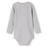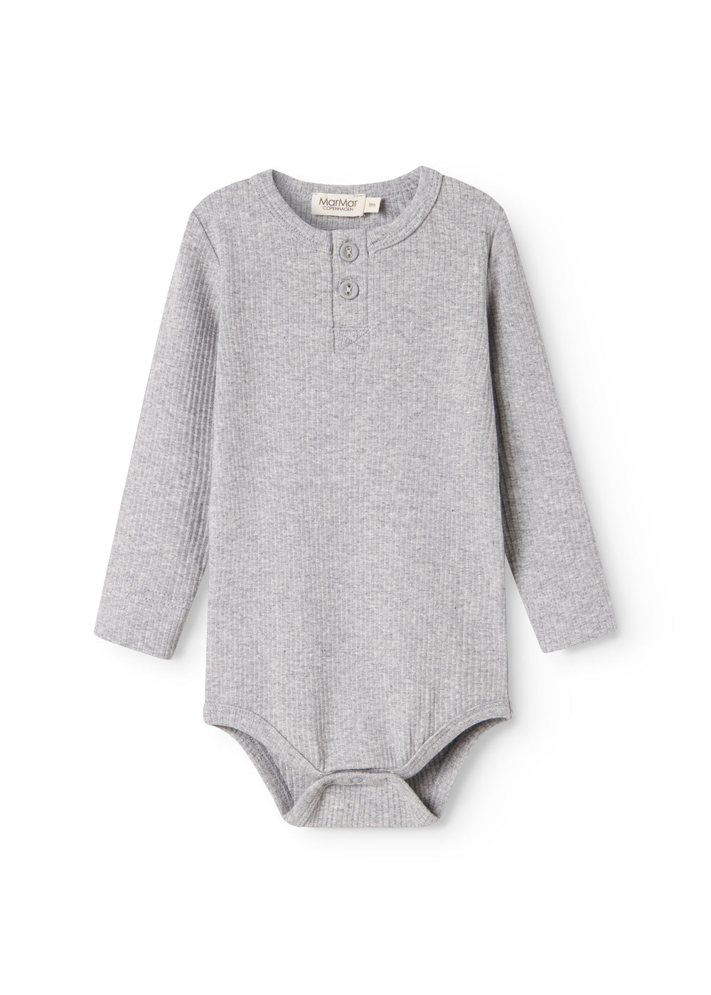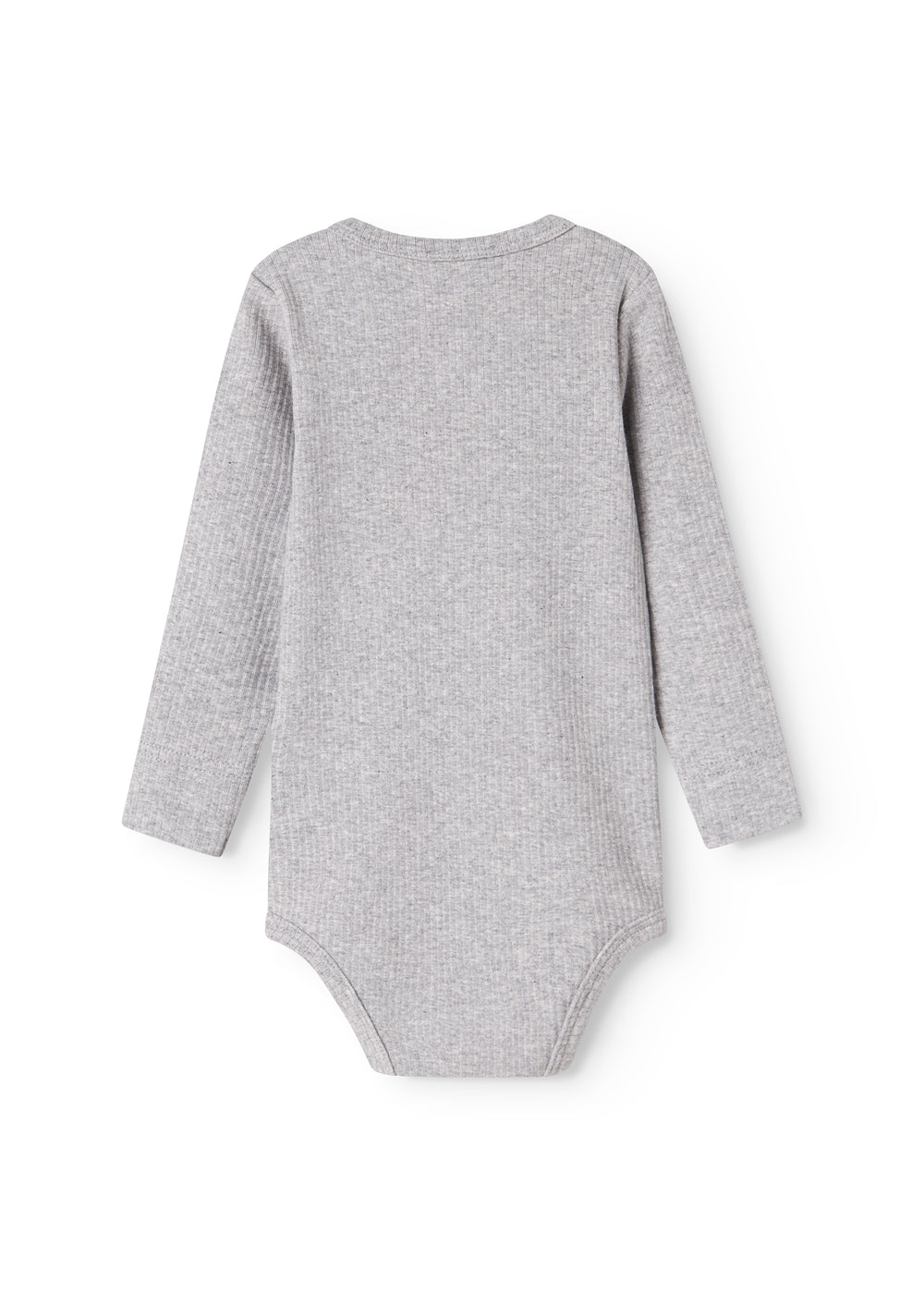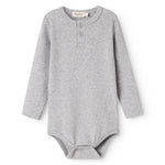Long-sleeved baby modal bodystocking with placket button closure that is closed with snaps between the legs for easy diaper changes.