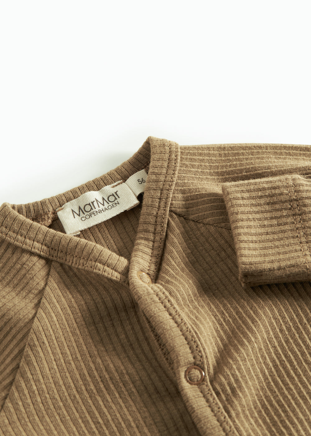Baby iført brun ribstrikket babybody med knapper foran og babyhue