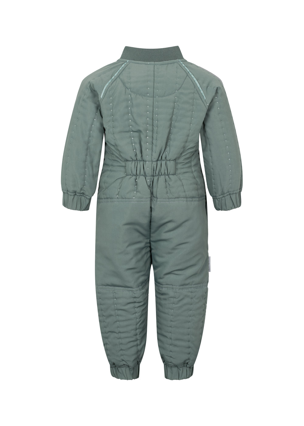 Bagside af støvet grøn termodragt til baby med elastik i taljen og ribkanter