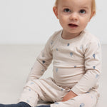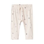 Comfortable baby pants with elastic and a decorative ribbon at the waist.