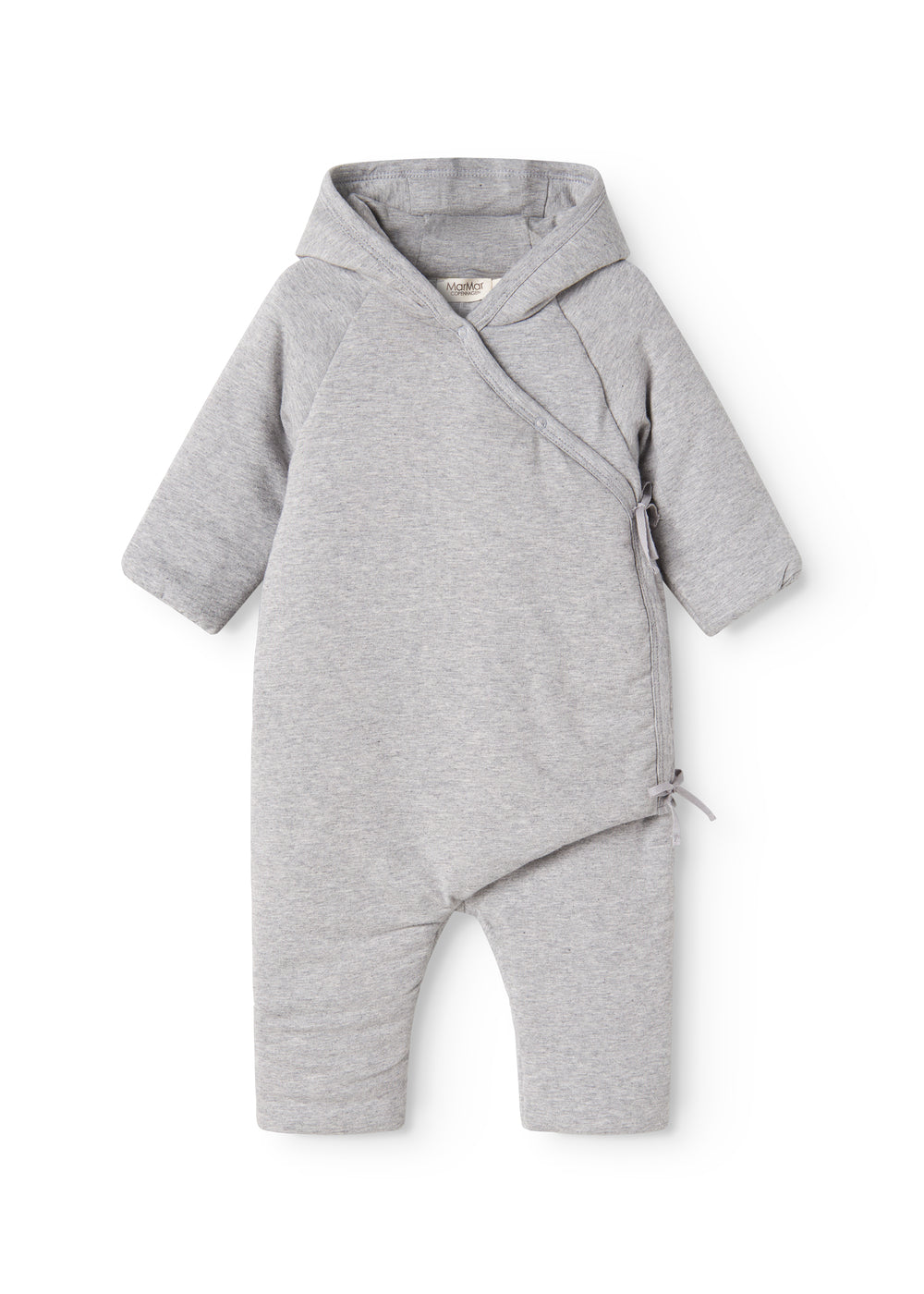 The jumpsuit is closed with snap buttons and ties.