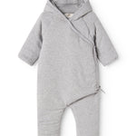 Warm padded jumpsuit with hood and wrap-around closure.