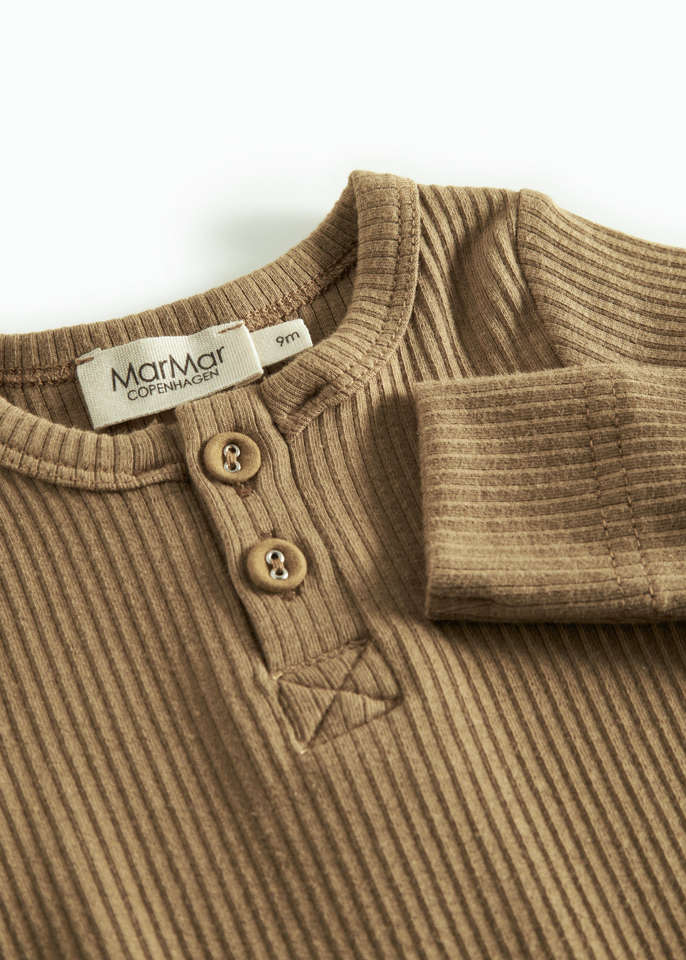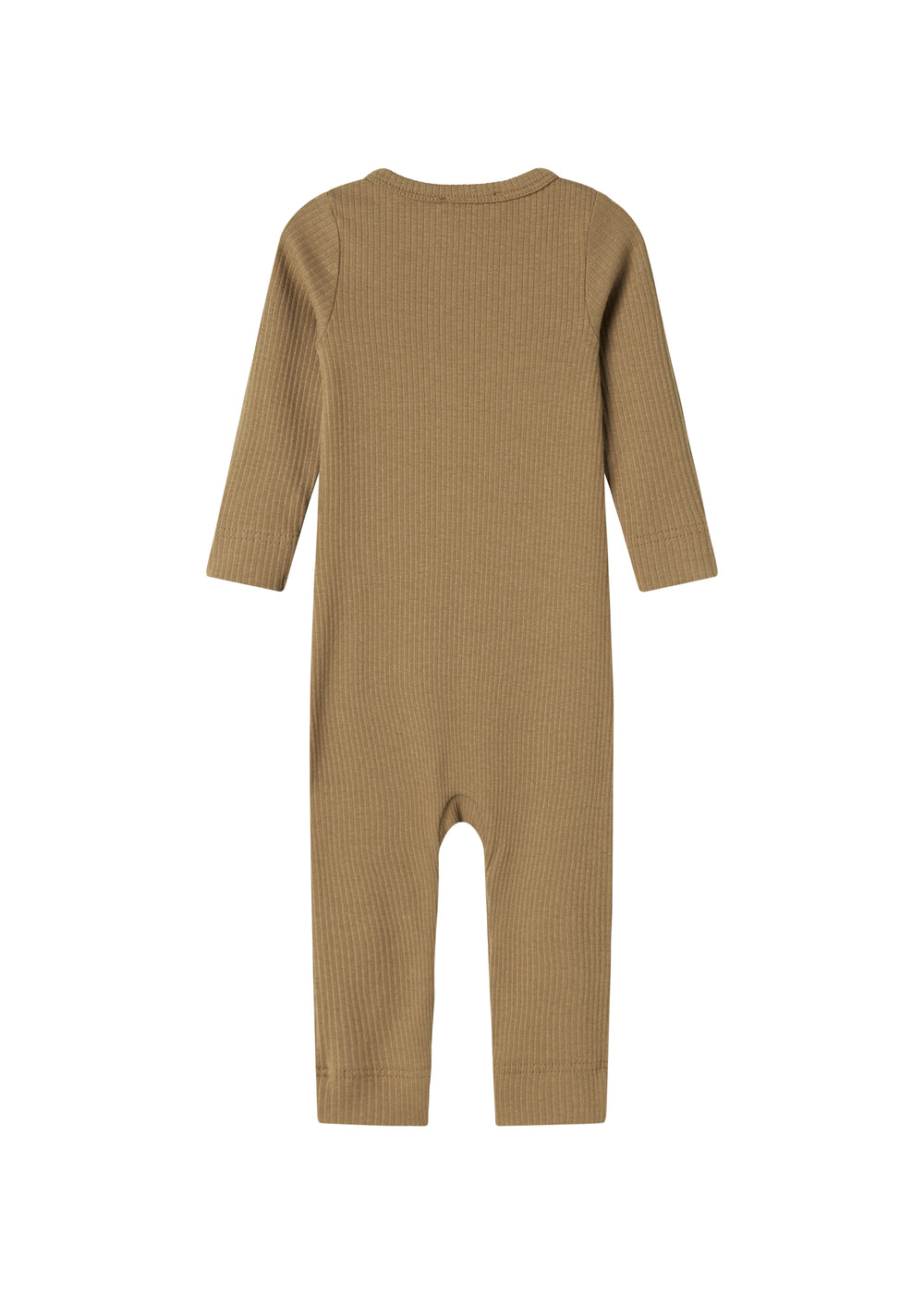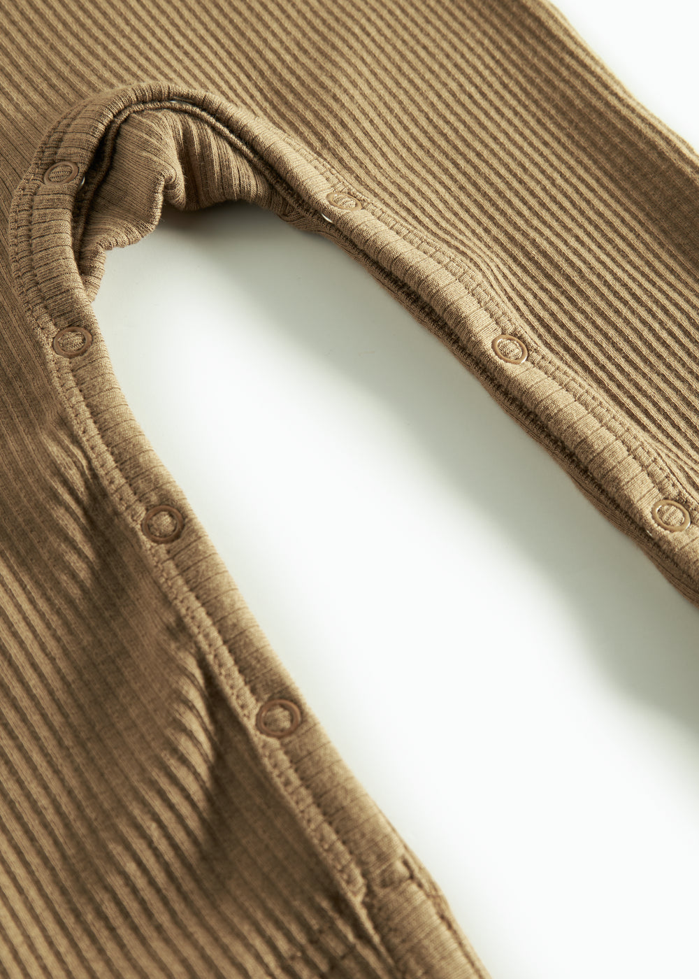 Ribbstrikket brun heldragt til baby i blødt materiale med lange ærmer, lange ben og knapper