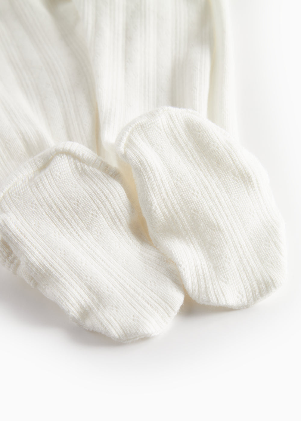 Long-sleeved pointelle onesie with feet for newborns. The onesie has a wrap-around closure, picot edges and closes with snaps and ties from the neck down one leg. The onesie is soft, stretchy and comfortable to wear.