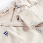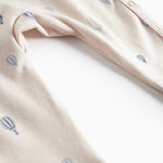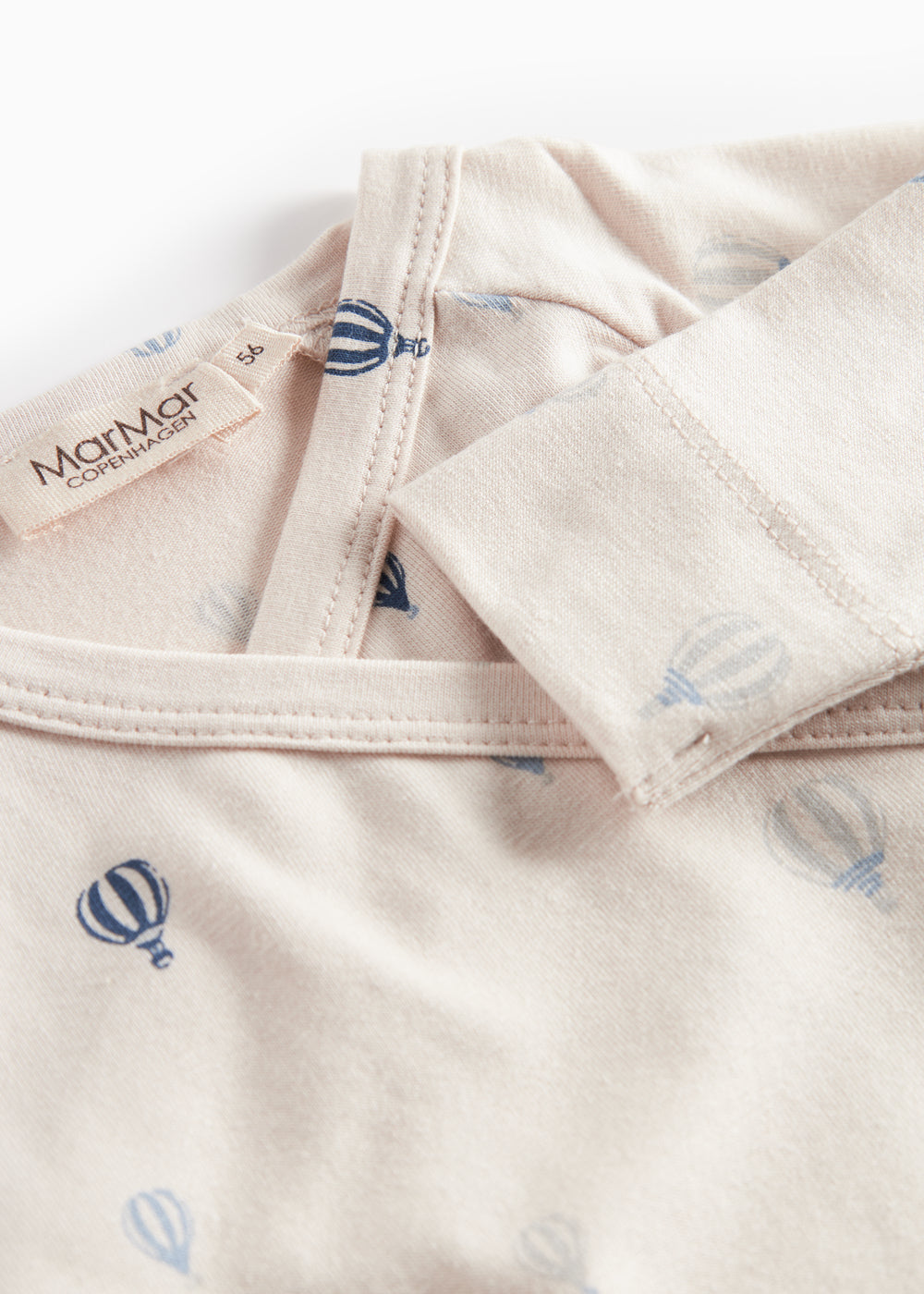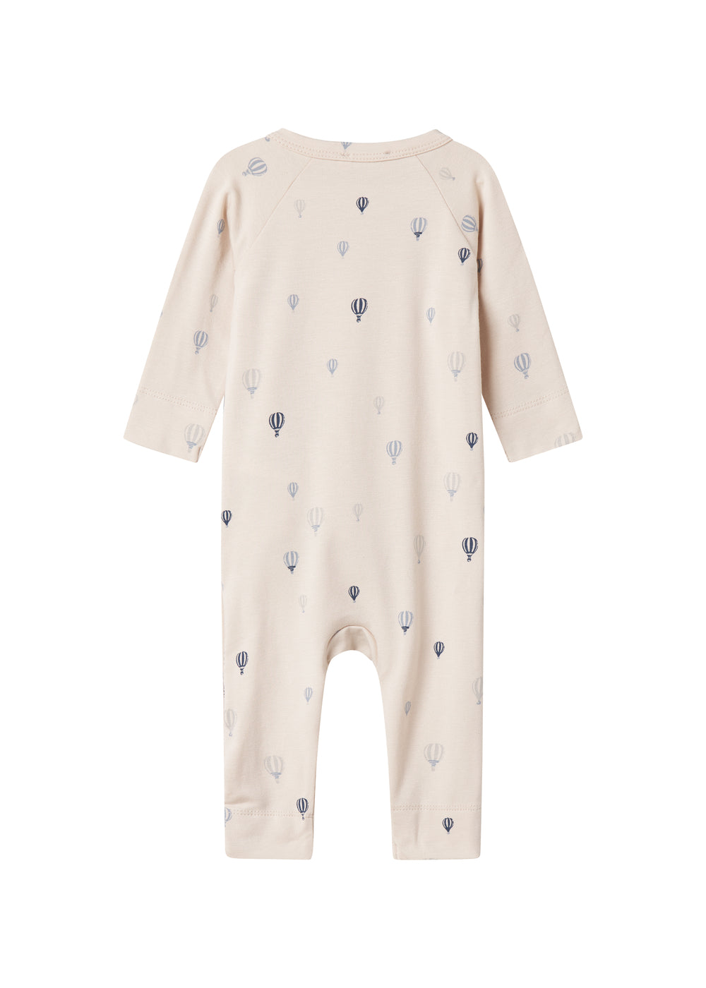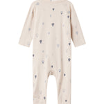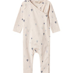 Long-sleeved jumpsuit with wrap-around closure for newborns. The jumpsuit closes with snaps from the neck and down one leg. The jumpsuit has a nice print and is soft, stretchy and comfortable to wear.