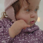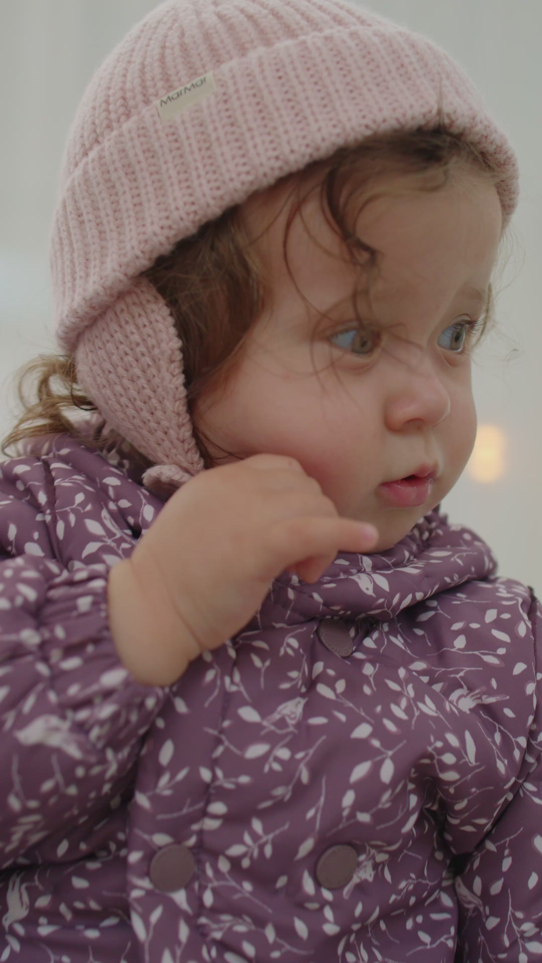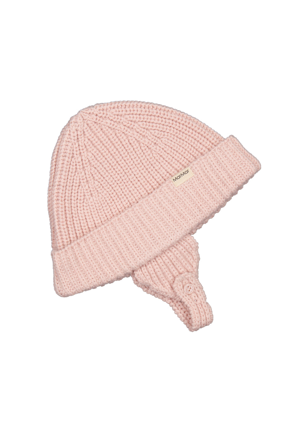 Knitted hat that goes down over the ears with a strap under the chin that can be adjusted with a button closure. The knitted hat is soft, chunky and has a nice drape and is perfect for both spring and autumn.