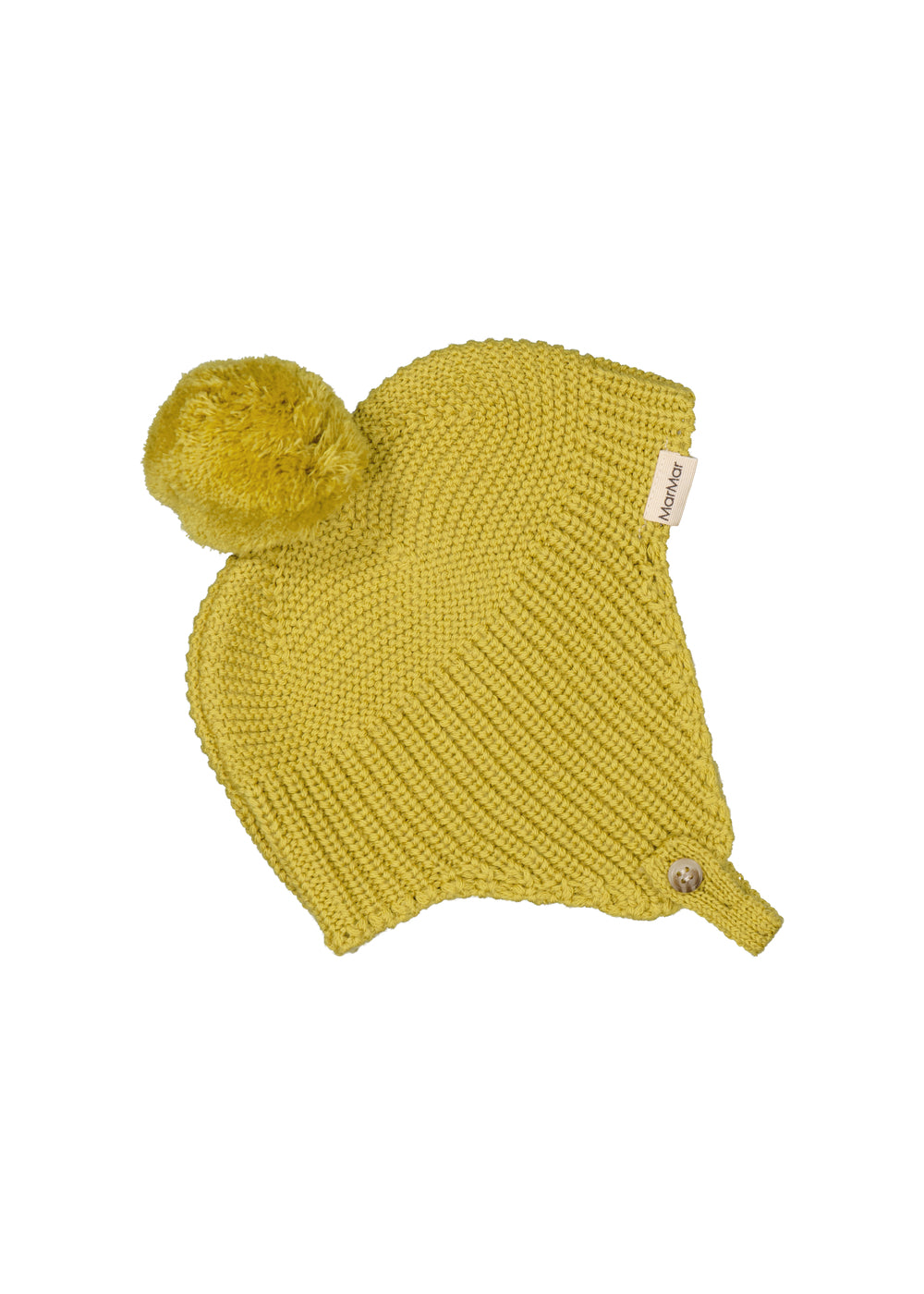 Knitted hat with pompom tassel, which provides optimal protection against the cold by covering both the head and ears while still fitting comfortably. The hat has a strap under the chin that can be adjusted to several lengths. The hat is soft, warm and perfect for the colder days.