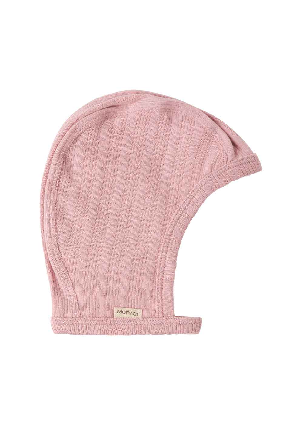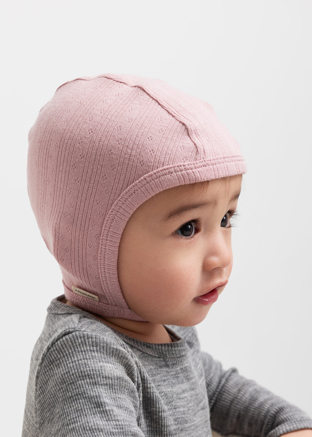 Nice little pointelle baby helmet that closes with a snap button in two lengths. The helmet is soft, stretchy and comfortable to wear.
