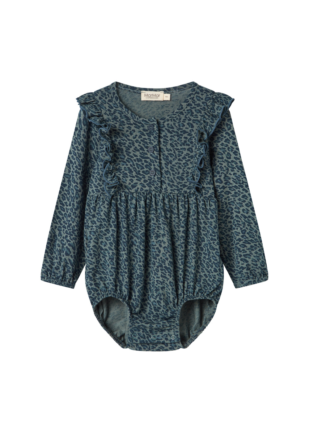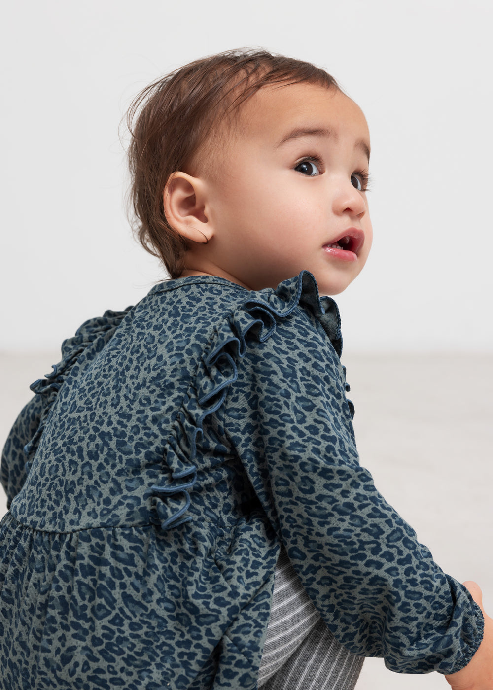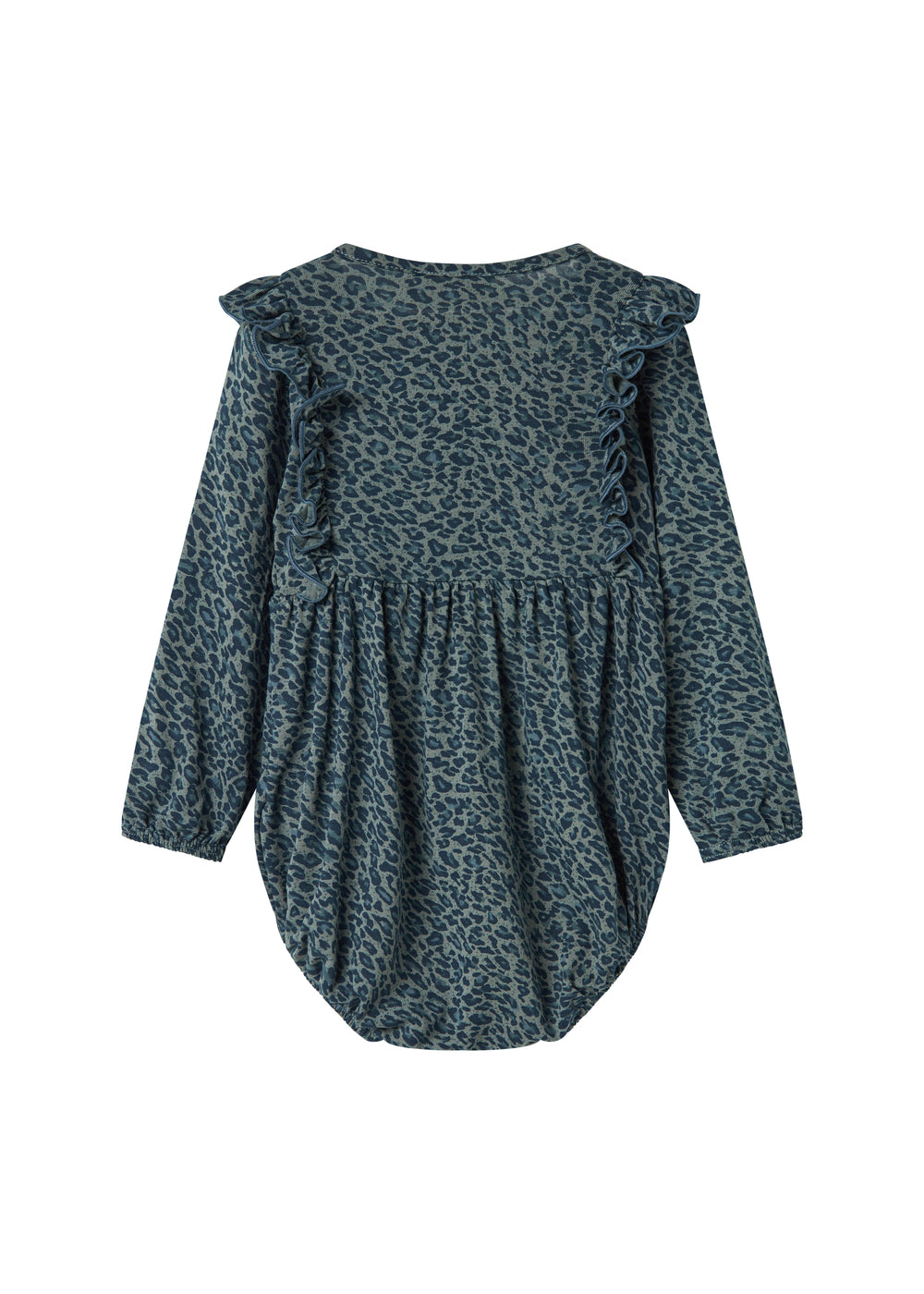 Grøn leopardmønstret babybody med lange ærmer og flæser