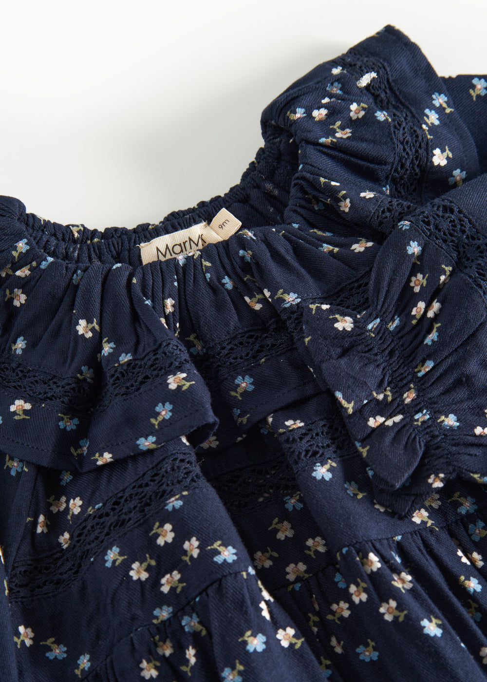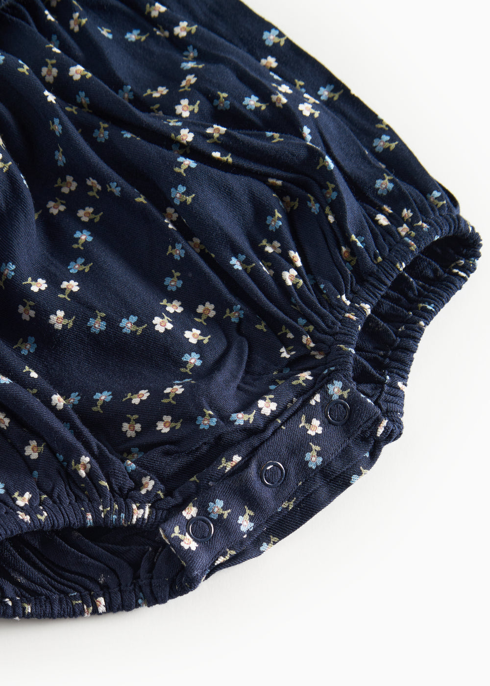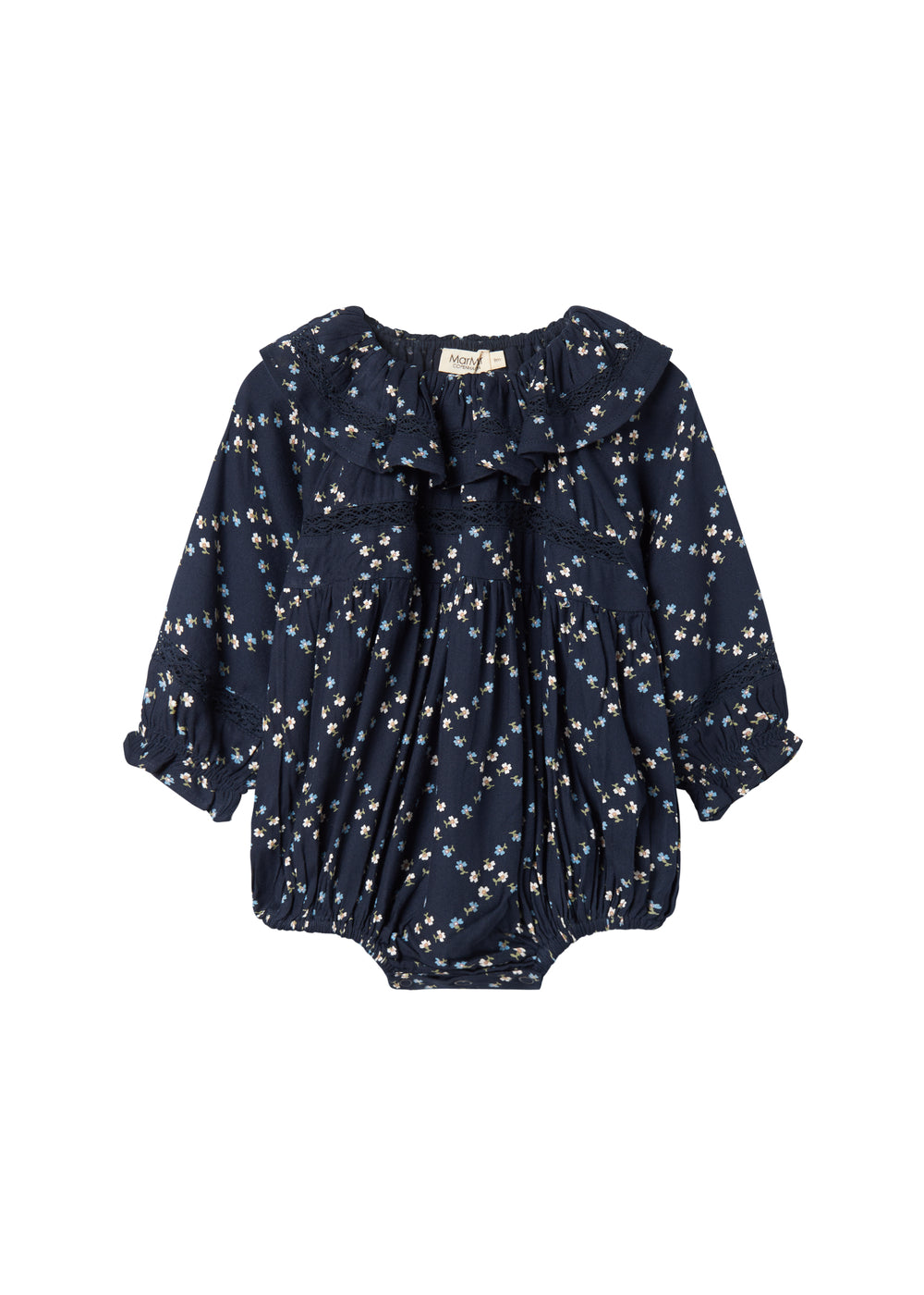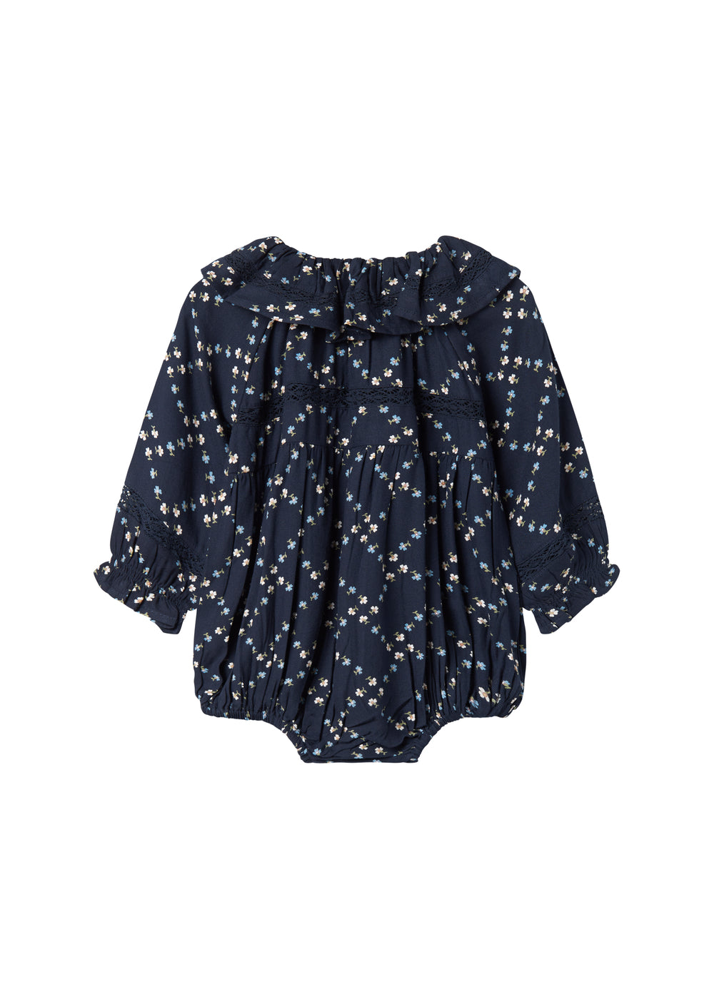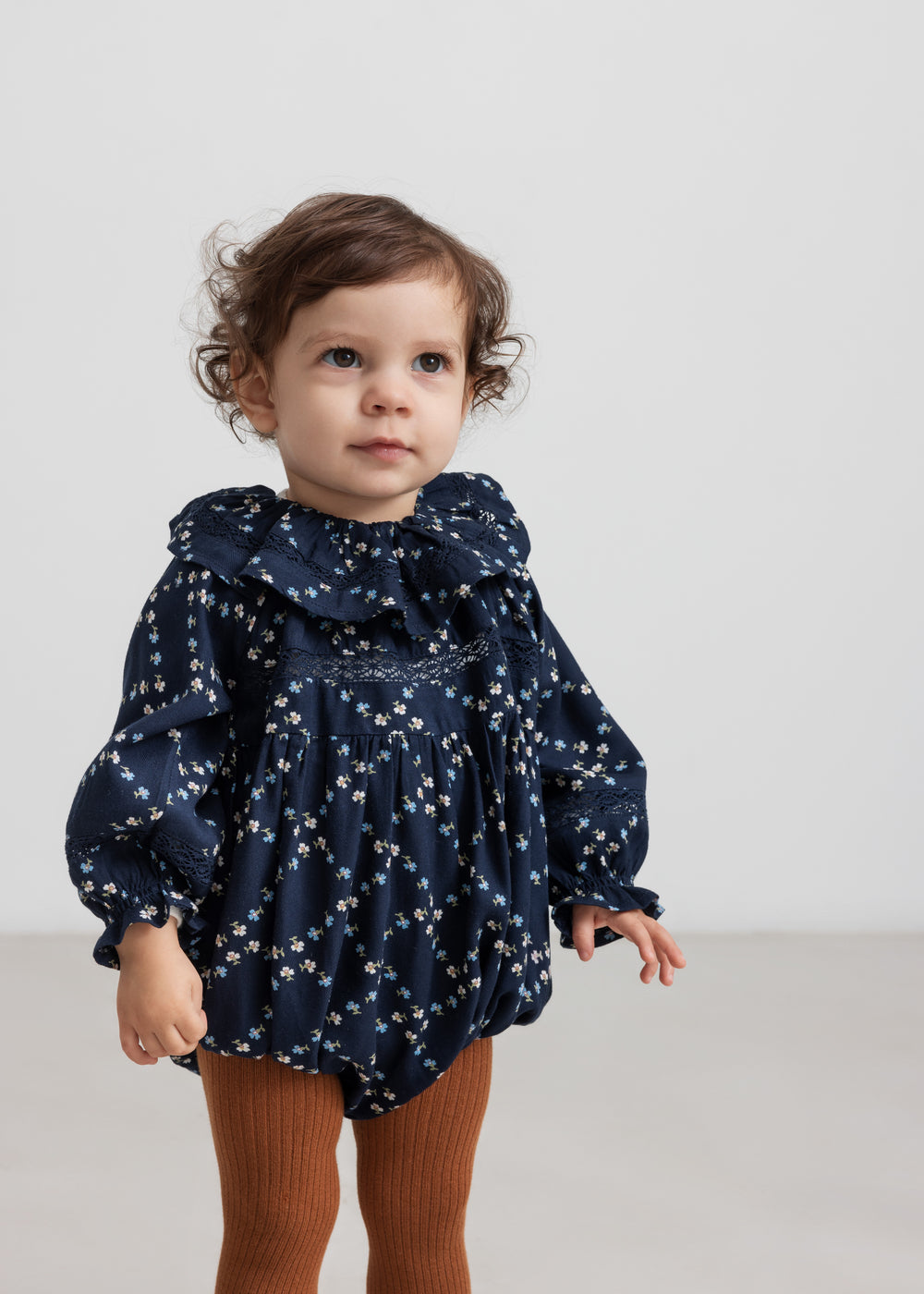Loose-fitting romper with a floral print in soft viscose with long sleeves and a pretty collar with lace details. The romper closes with snaps between the legs for easy diaper changes.