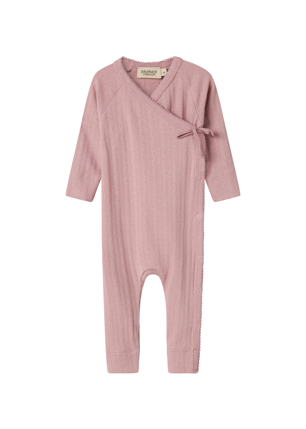 Long-sleeved pointelle jumpsuit with wrap-around closure for newborns. The jumpsuit has picot edges and closes with snaps and ties from the neck down one leg. The jumpsuit is soft, stretchy and comfortable to wear.
