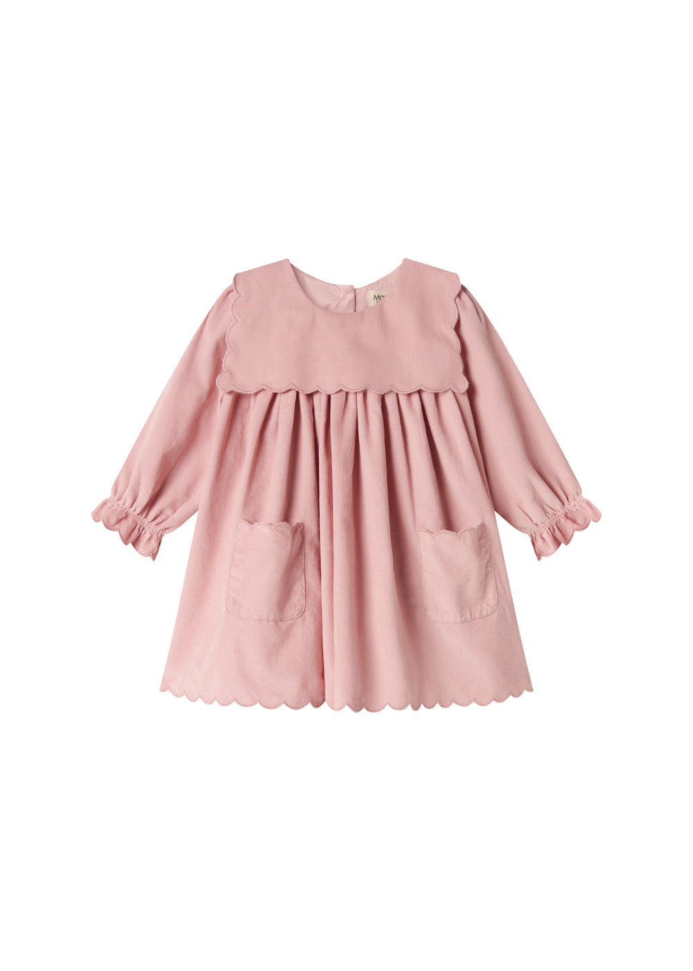 Long-sleeved dress for the little ones in baby velvet with a loose fit and a nice large decorative collar with wavy details. The dress has two pockets in the front and a button closure at the back. The length of the dress goes above the knee.