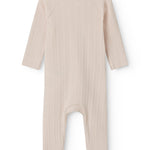 Long-sleeved pointelle jumpsuit with wrap-around closure for newborns. The jumpsuit has picot edges and closes with snaps and ties from the neck down one leg. The jumpsuit is soft, stretchy and comfortable to wear.