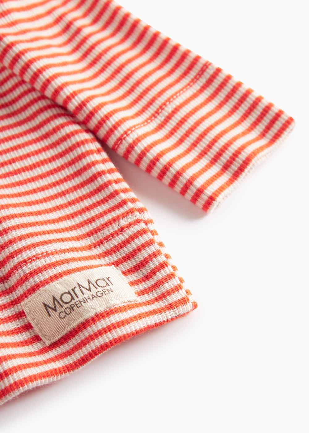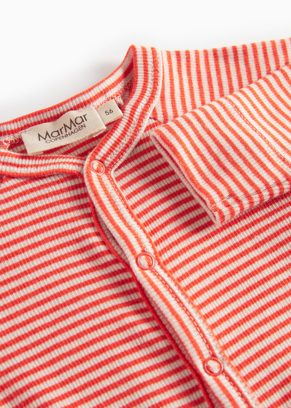 Simple long-sleeved t-shirt with stripes that closes with snaps all the way down the front. The t-shirt is soft, holds its shape and color, and has elastane in it, which makes it stretchy and comfortable to wear.