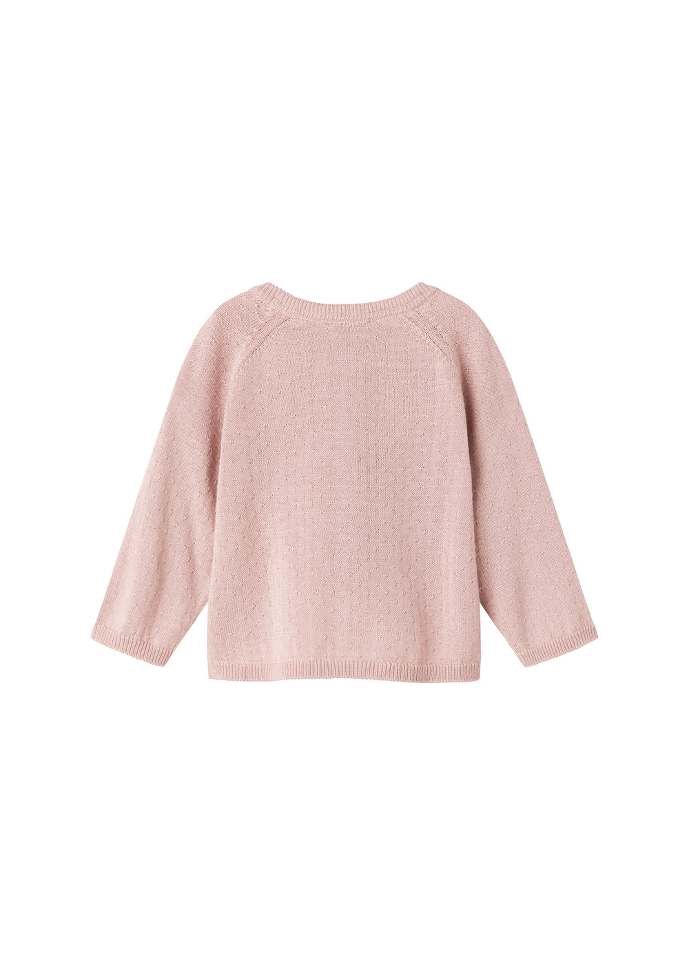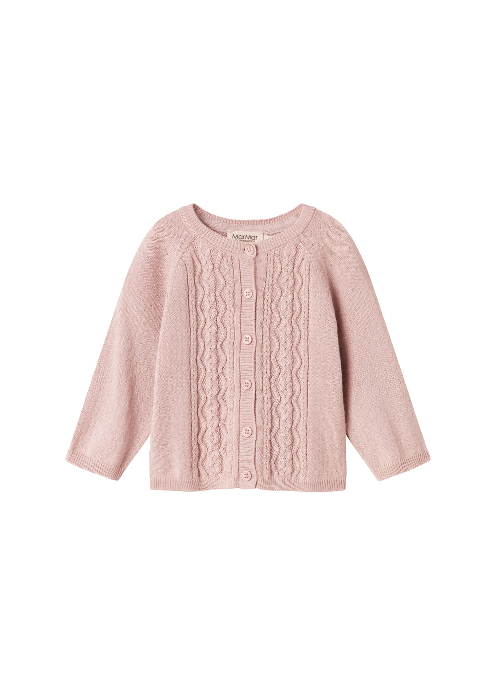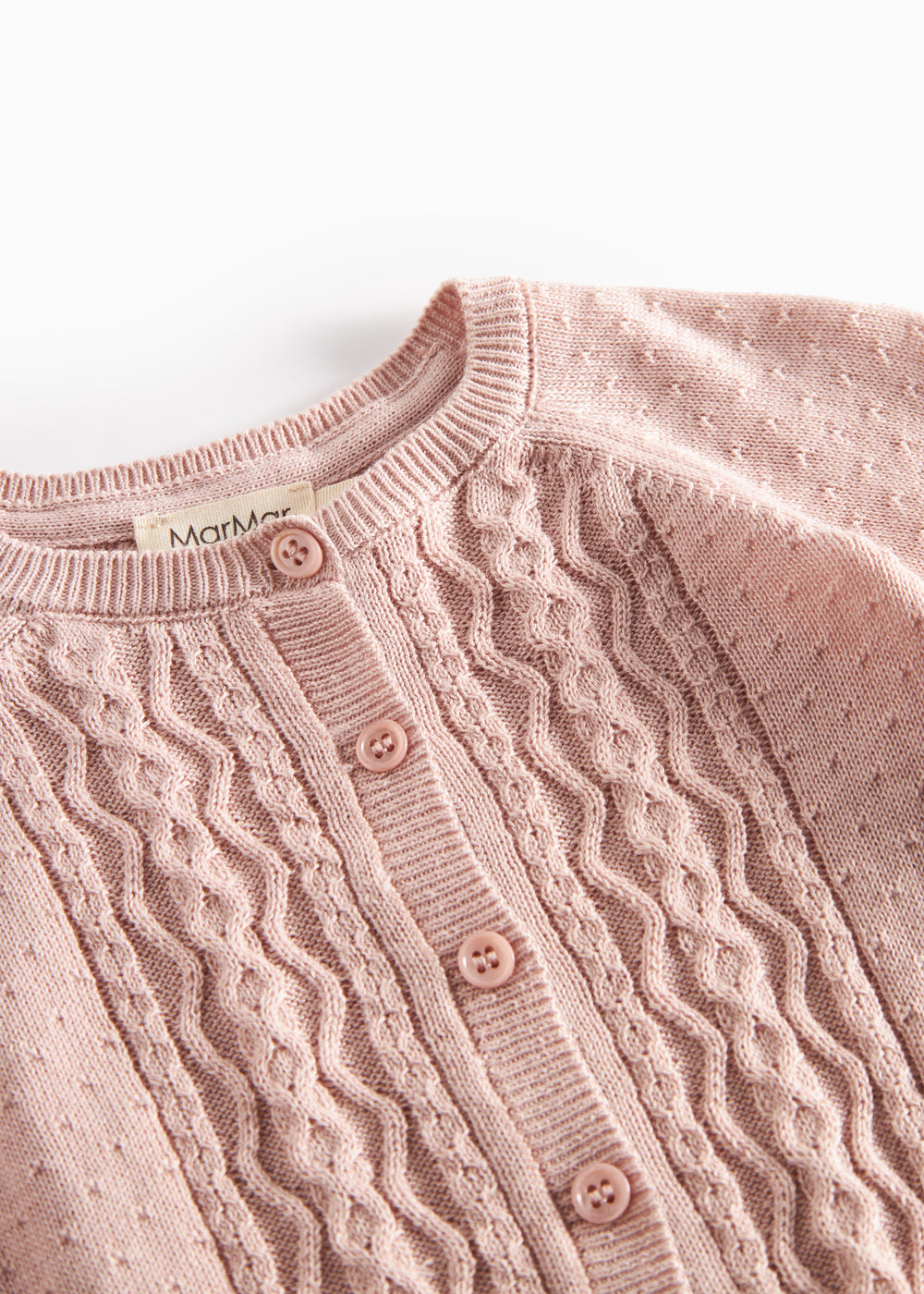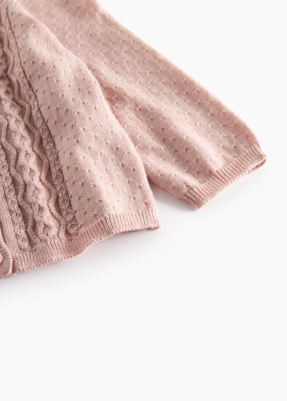 Knit cardigan for the little ones with raglan sleeves, delicate lace pattern and beautiful cable details at the front. The cardigan has a round neck, button closure and ribbed edges at the sleeves and bottom. The cardigan is perfect for both everyday wear and festive occasions.