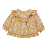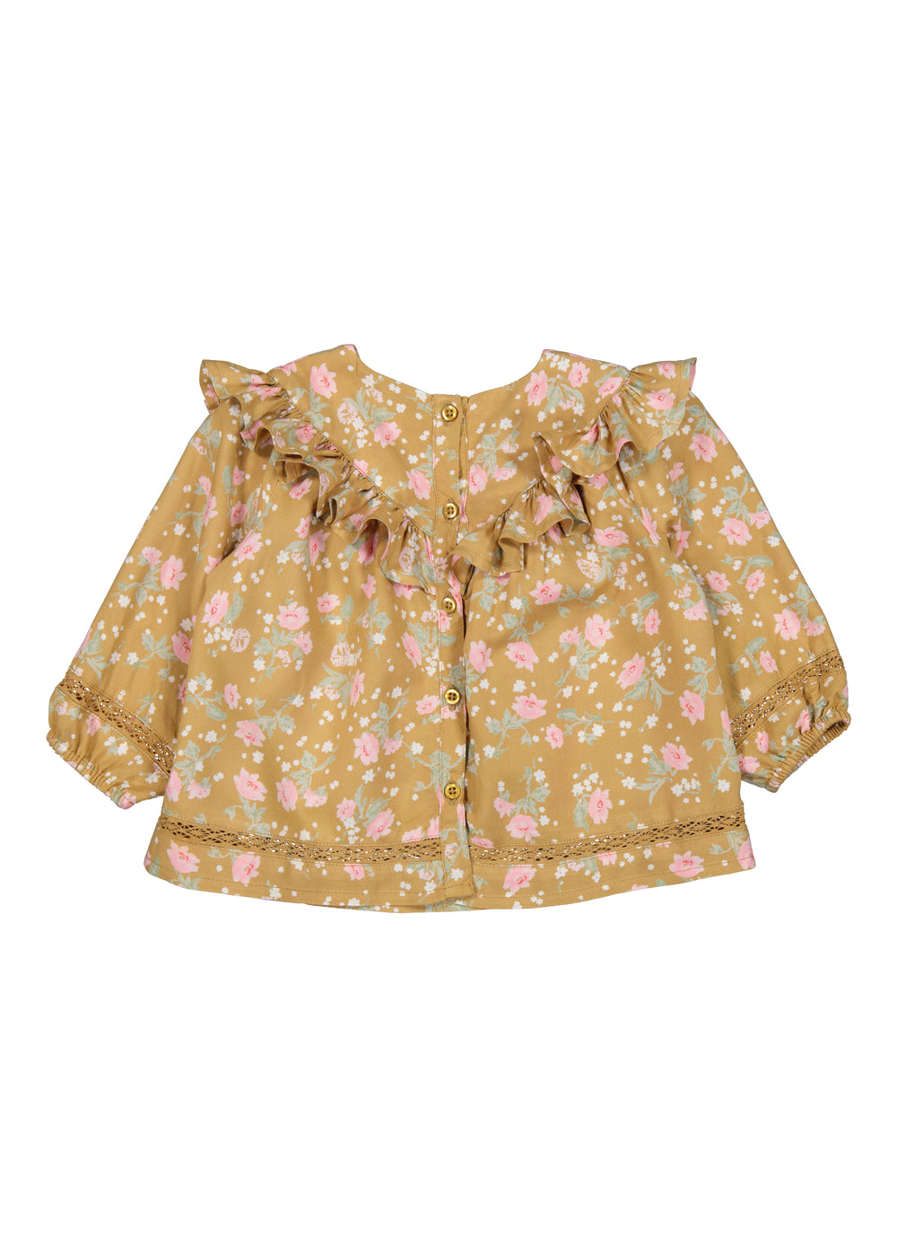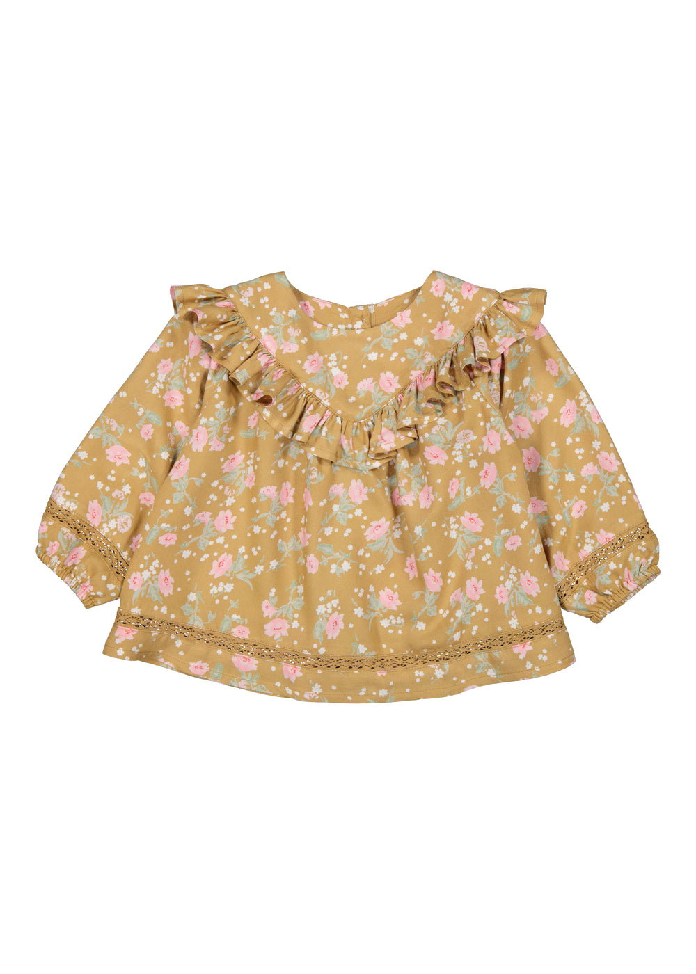 Loose-fitting, long-sleeved soft viscose blouse with a cute ruffle at the front and lace edge details. The blouse closes at the back with buttons.