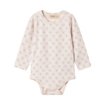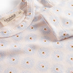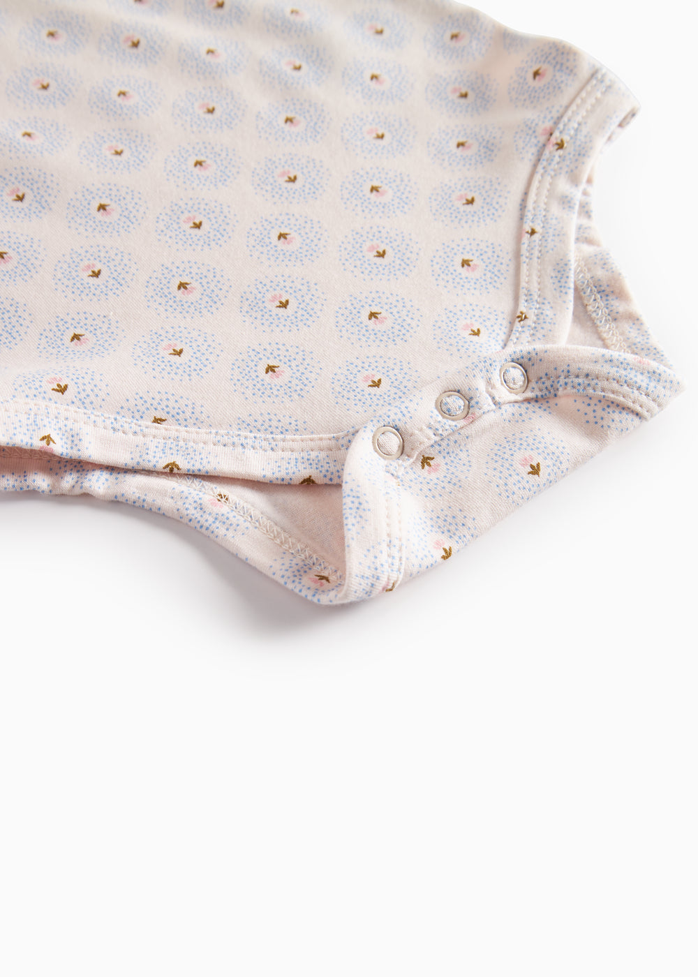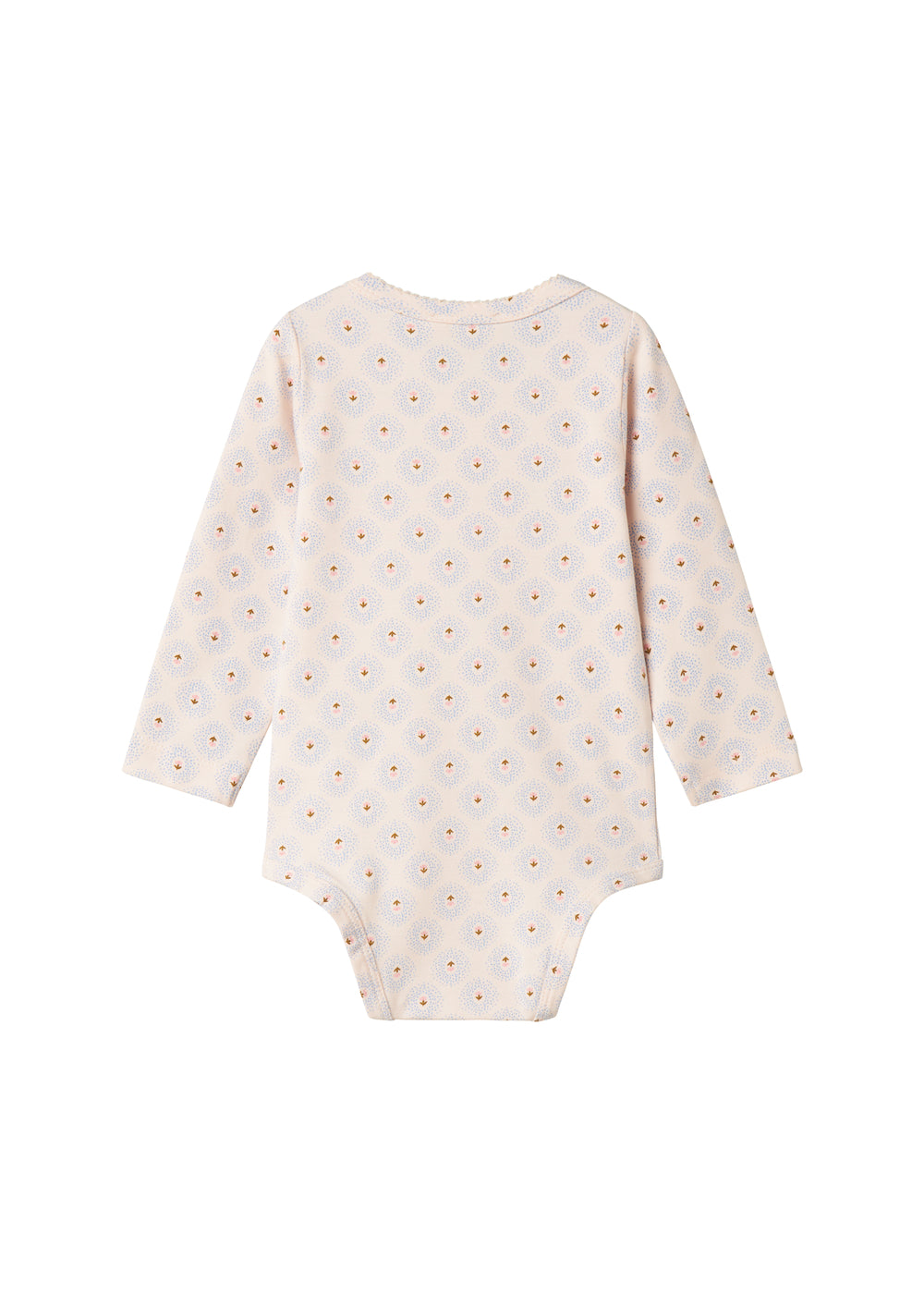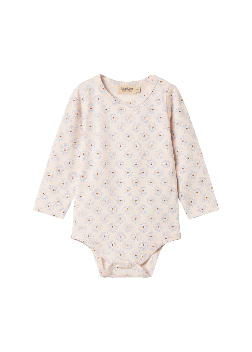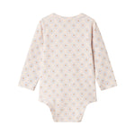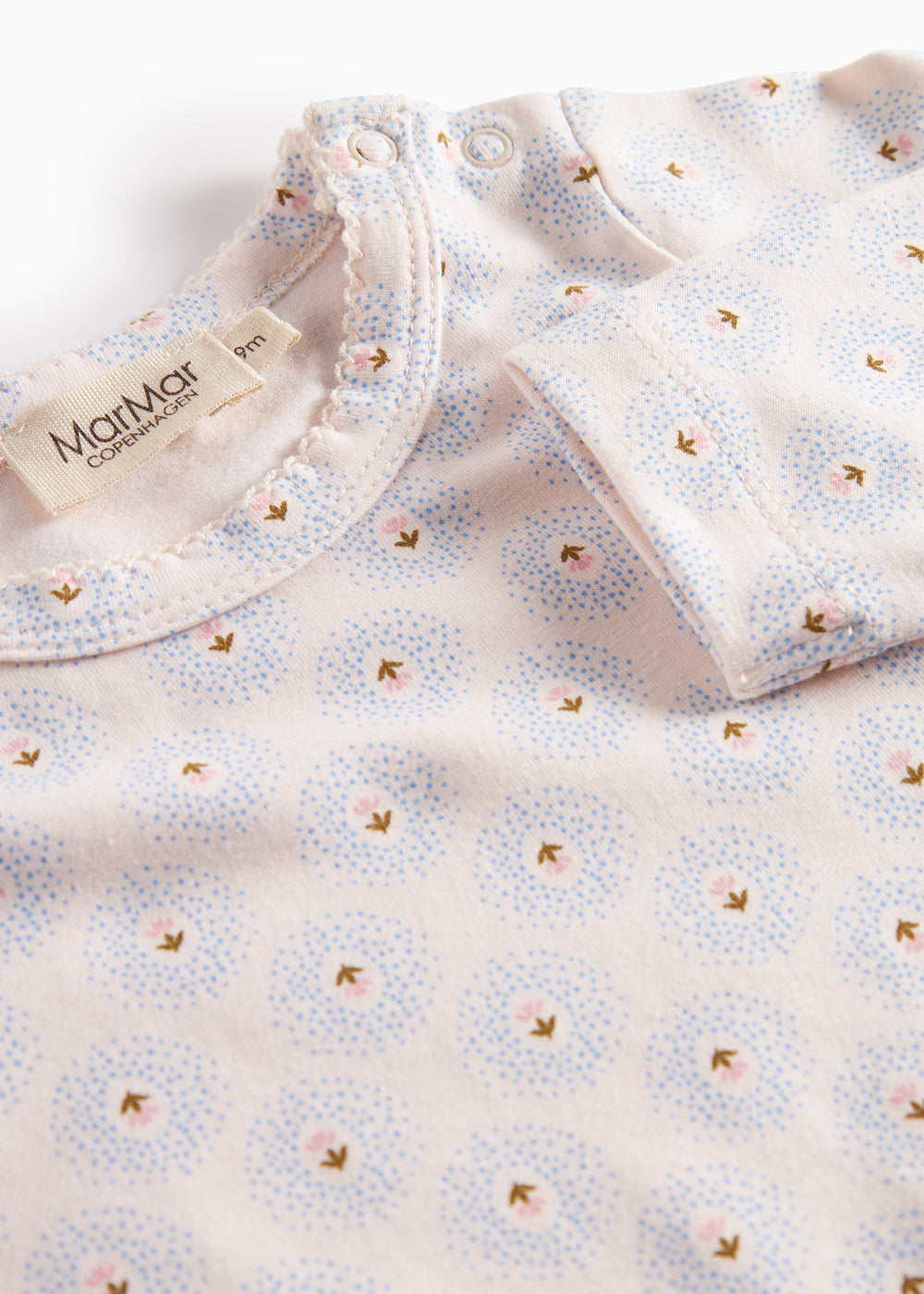 Simple long-sleeved baby bodystocking that closes with snaps on the left shoulder and between the legs for easy diaper changes. The bodystocking has a nice print and is both soft, stretchy and comfortable to wear.