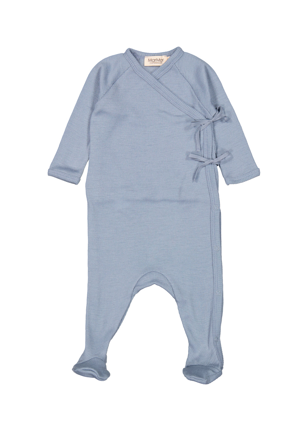 Long-sleeved jumpsuit with feet for the little ones. The jumpsuit has a wrap-around closure and closes with snaps and ties from the neck down one leg.