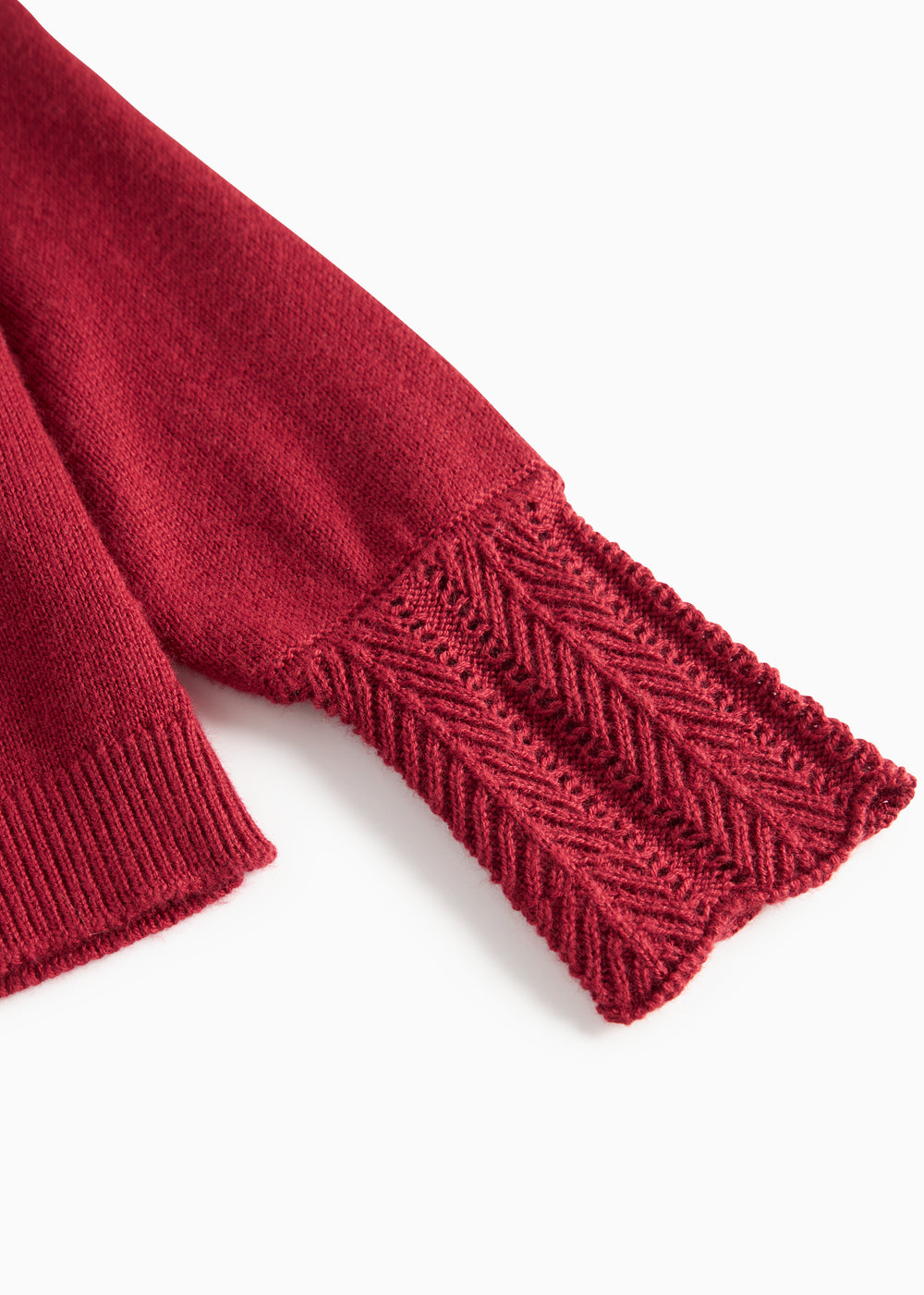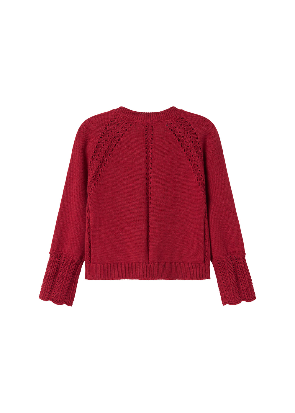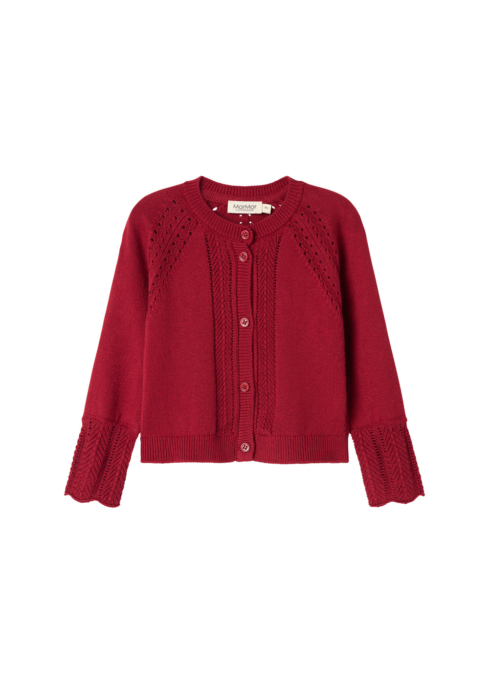 Knit cardigan for baby with button closure, raglan sleeves and lace/hole pattern details. The cardigan is perfect for both everyday and festive occasions.