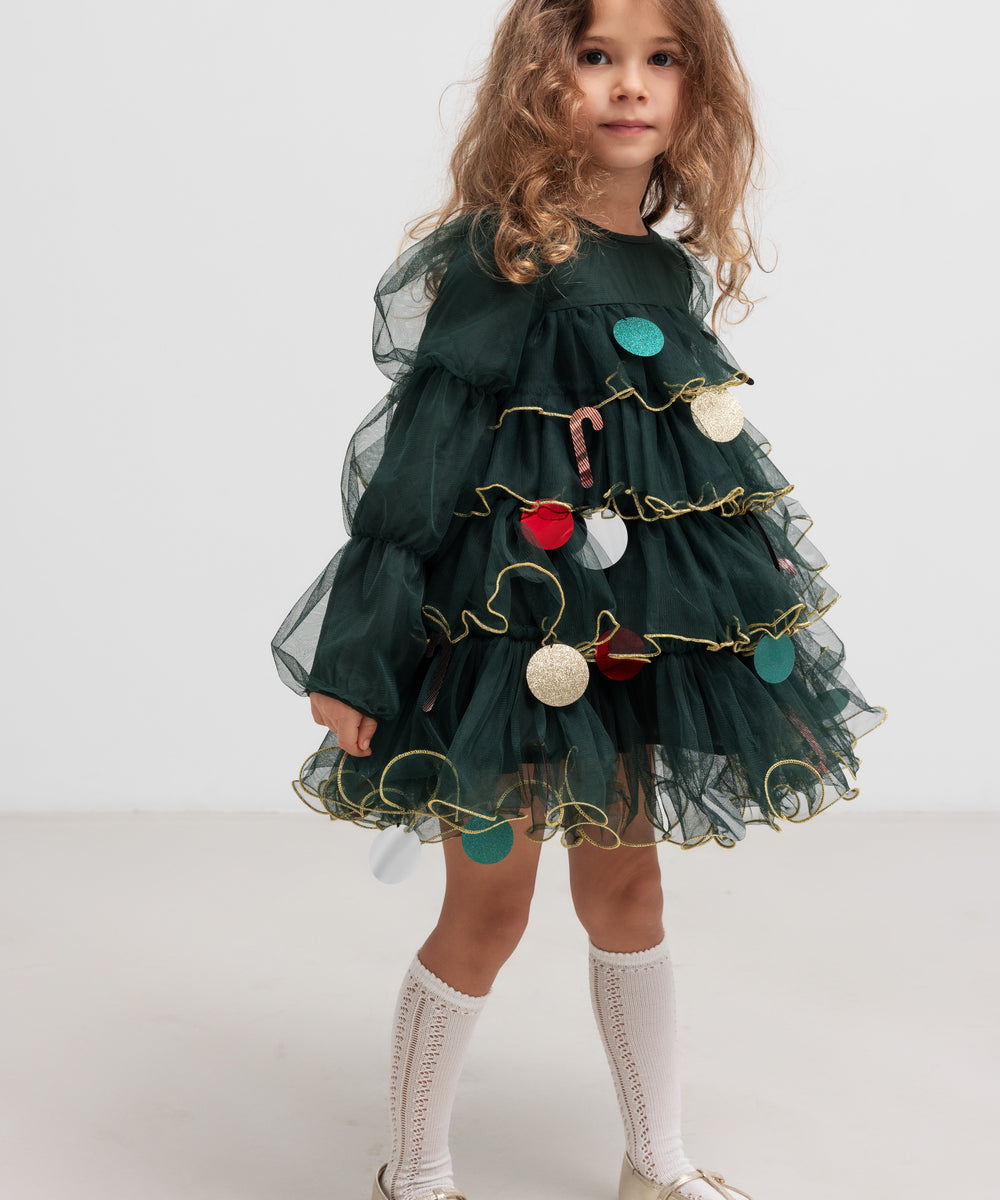 Pige iført ternet julekjole og cremefarvede strømpebukser til børn