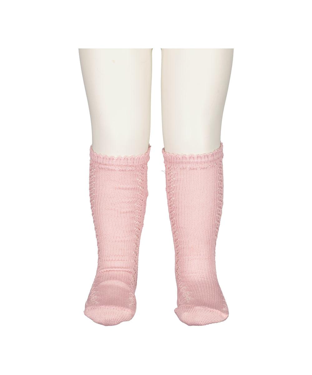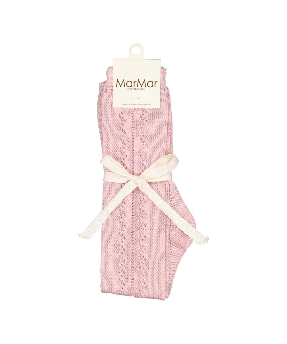 Lyserøde og cremefarvede børnestrømper med Moomin figurer og dekorative kanter