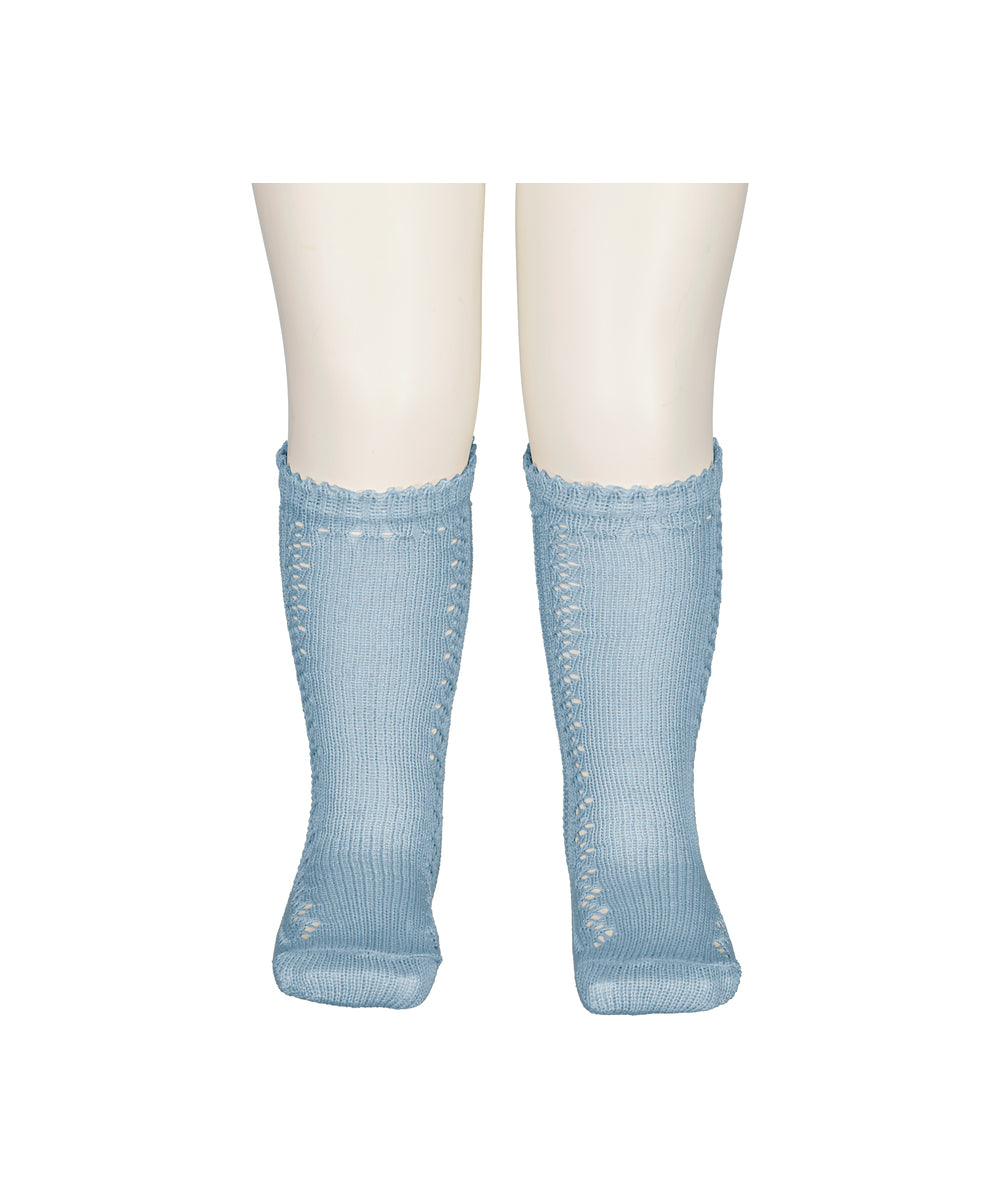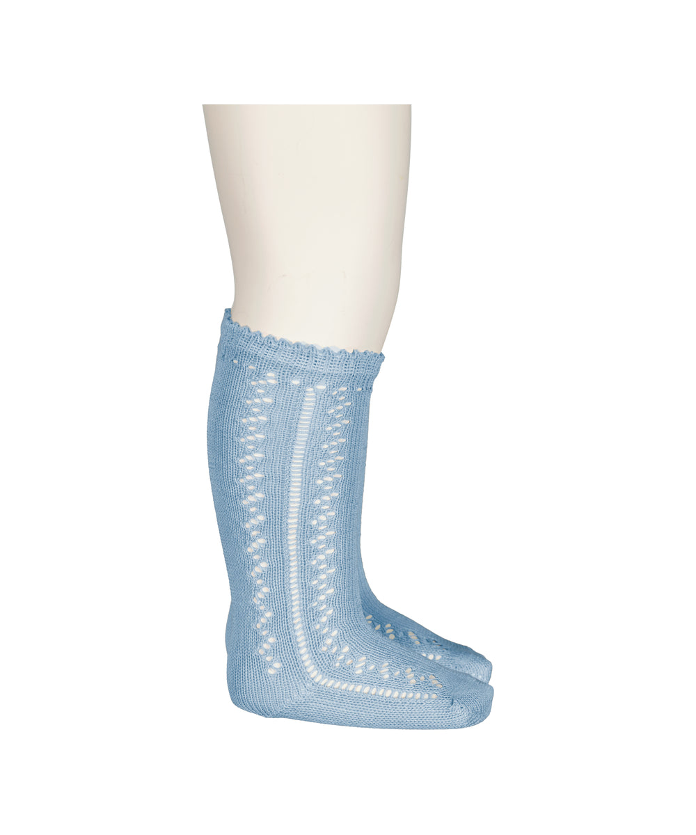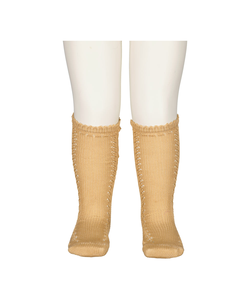 Barn med uldstriksokker, beige hue og mønsterstrik